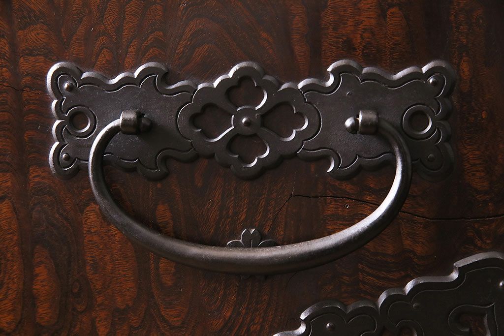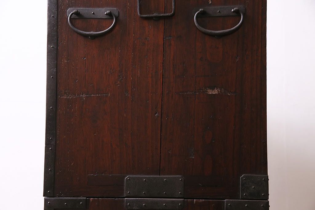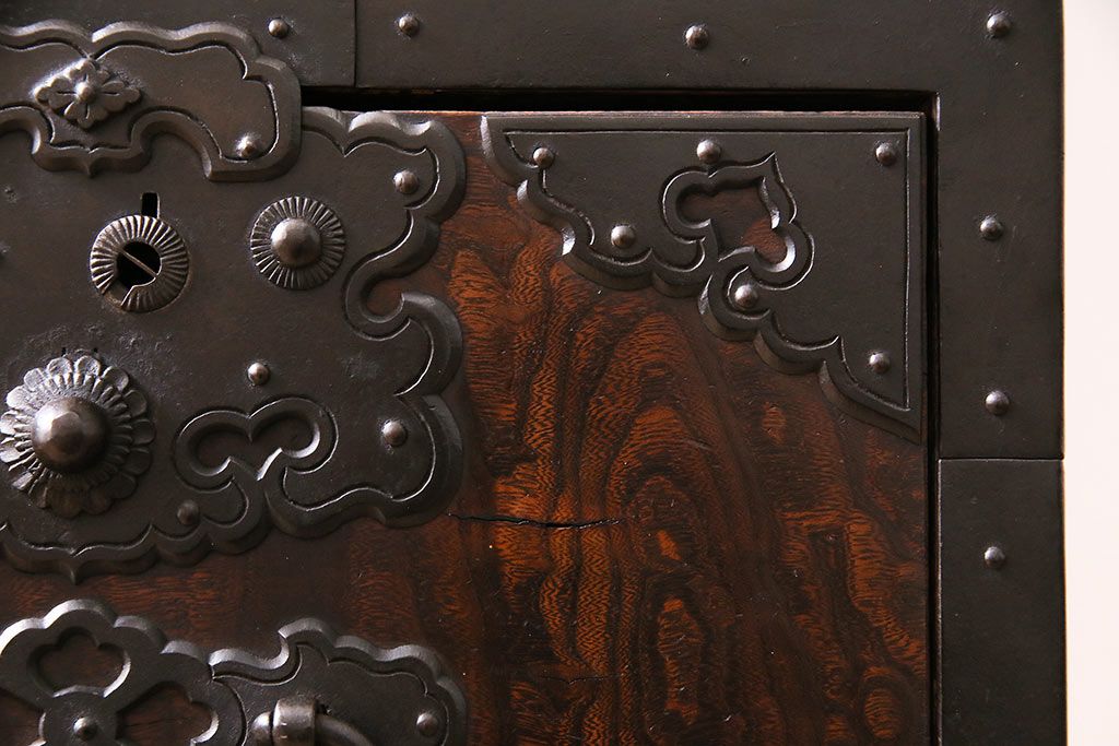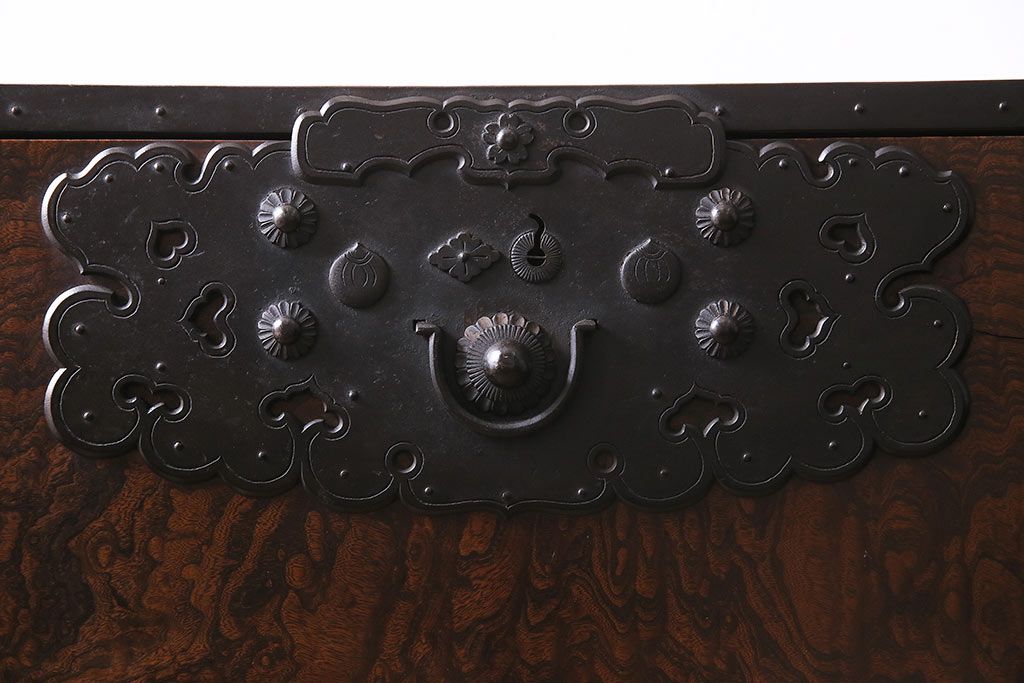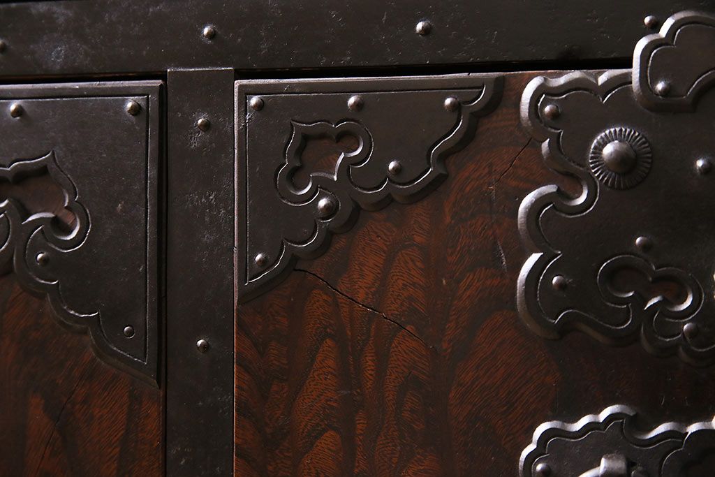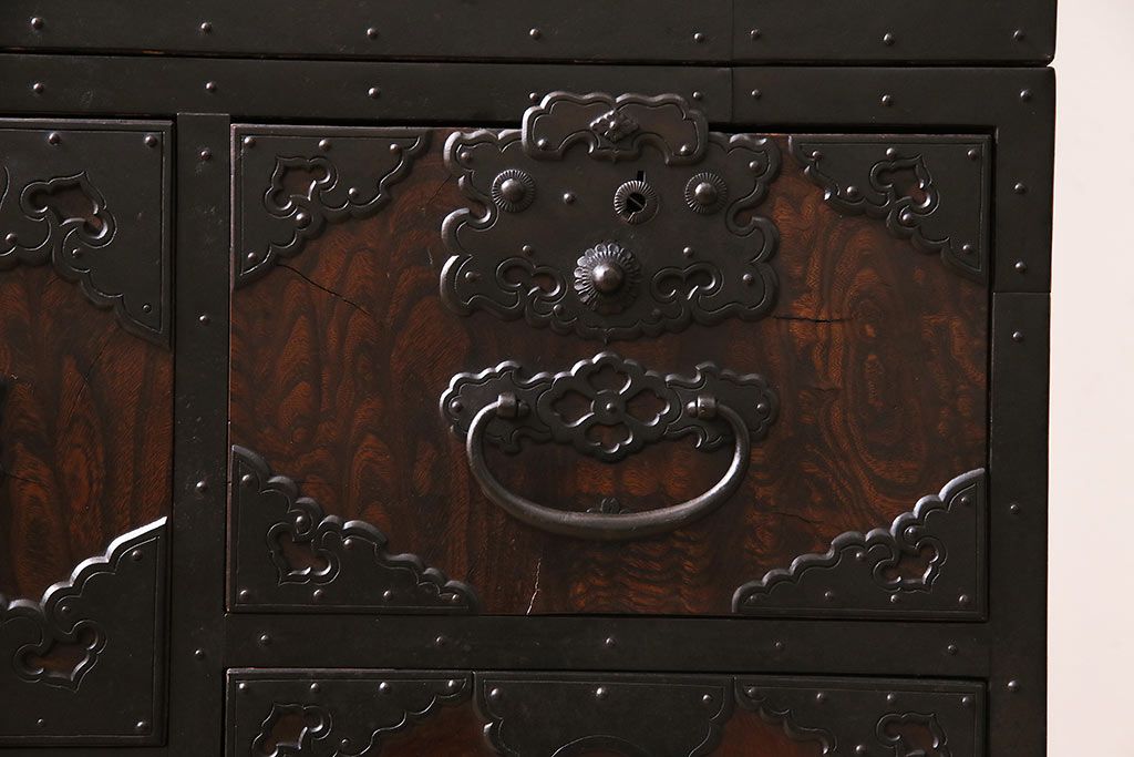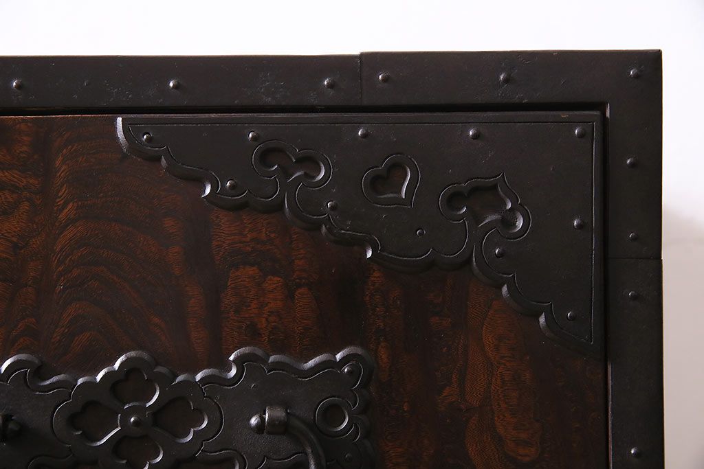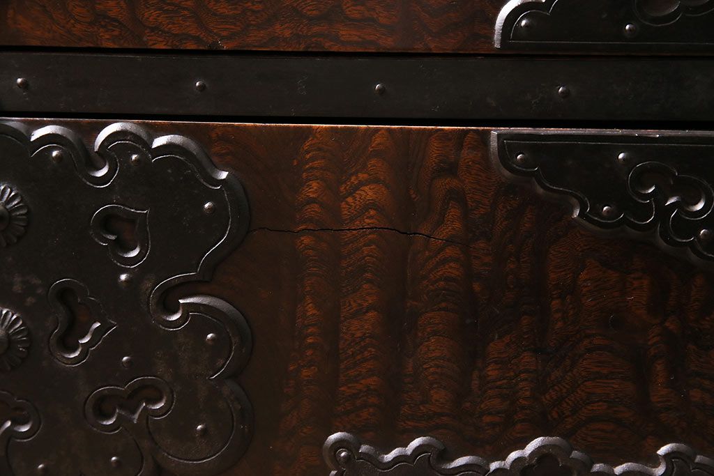 ラフジュ工房> チェスト・引き出し > アンティーク家具 前面ケヤキ材 玉杢 分厚い金具が目を引く上手物の佐渡小木箪笥(佐渡箪笥、衣装箪笥、重ね箪笥)(R-045038)