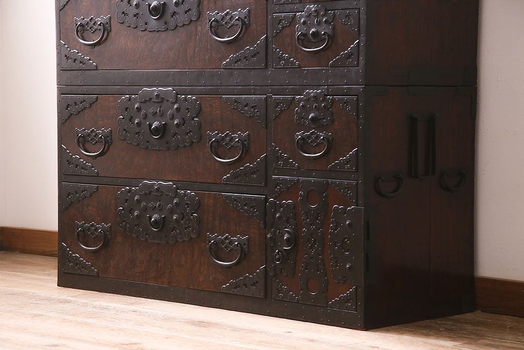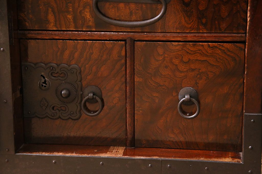 アンティーク家具 前面ケヤキ材 玉杢 分厚い金具が目を引く上手物の佐渡小木箪笥(佐渡箪笥、衣装箪笥、重ね箪笥)(R-045038)