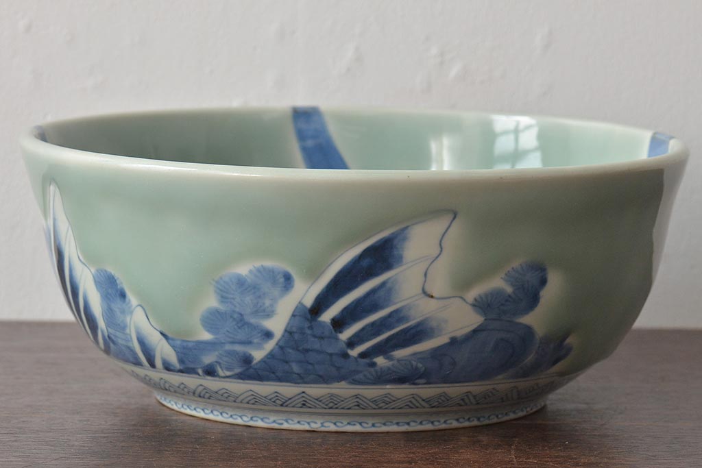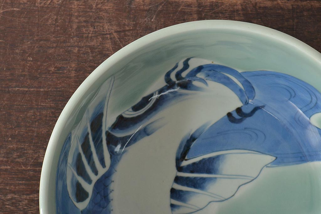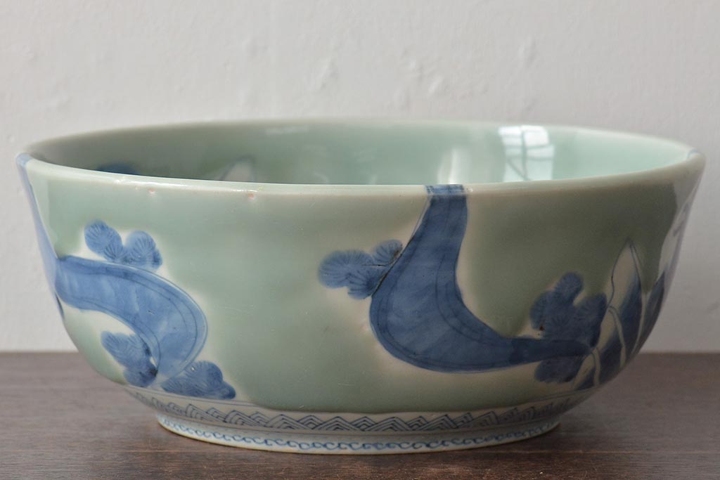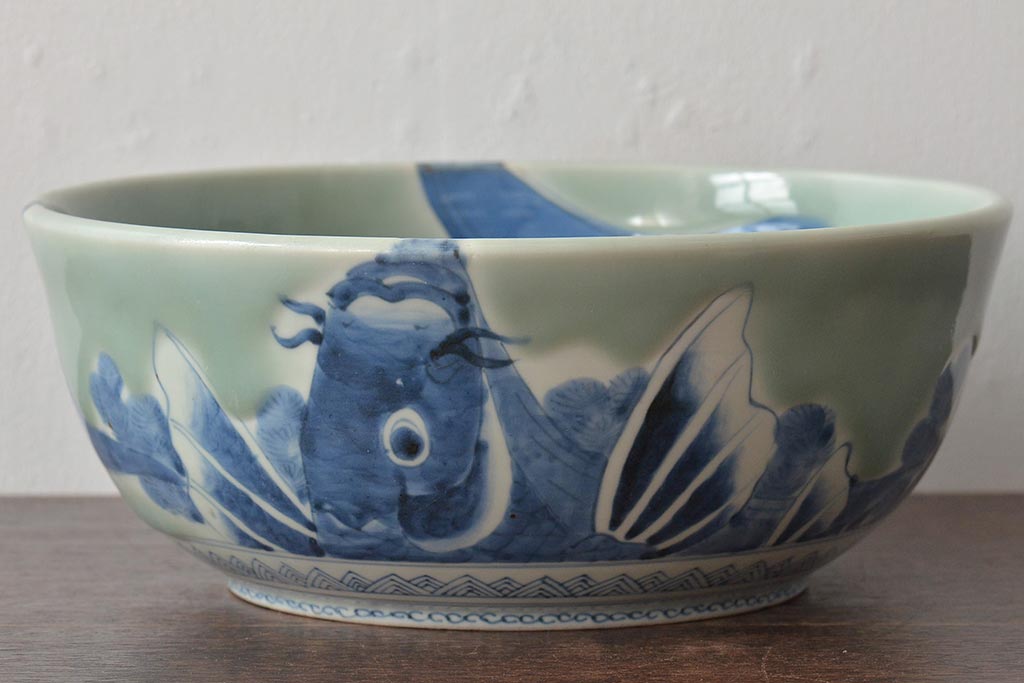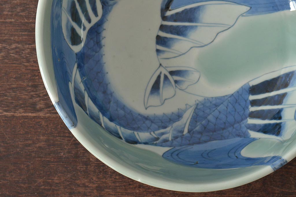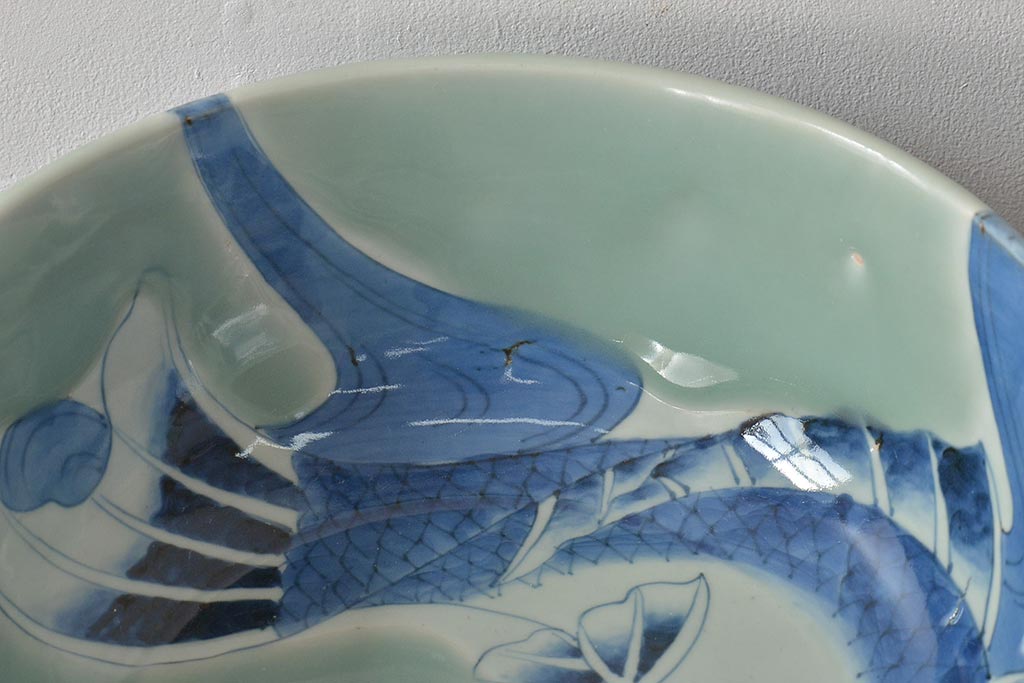 ラフジュ工房> 和食器・茶道具> 鉢 > 江戸期 古伊万里 染付 呉祥瑞銘 鯉の図 青磁 深皿(深鉢、和食器)(R-044863)