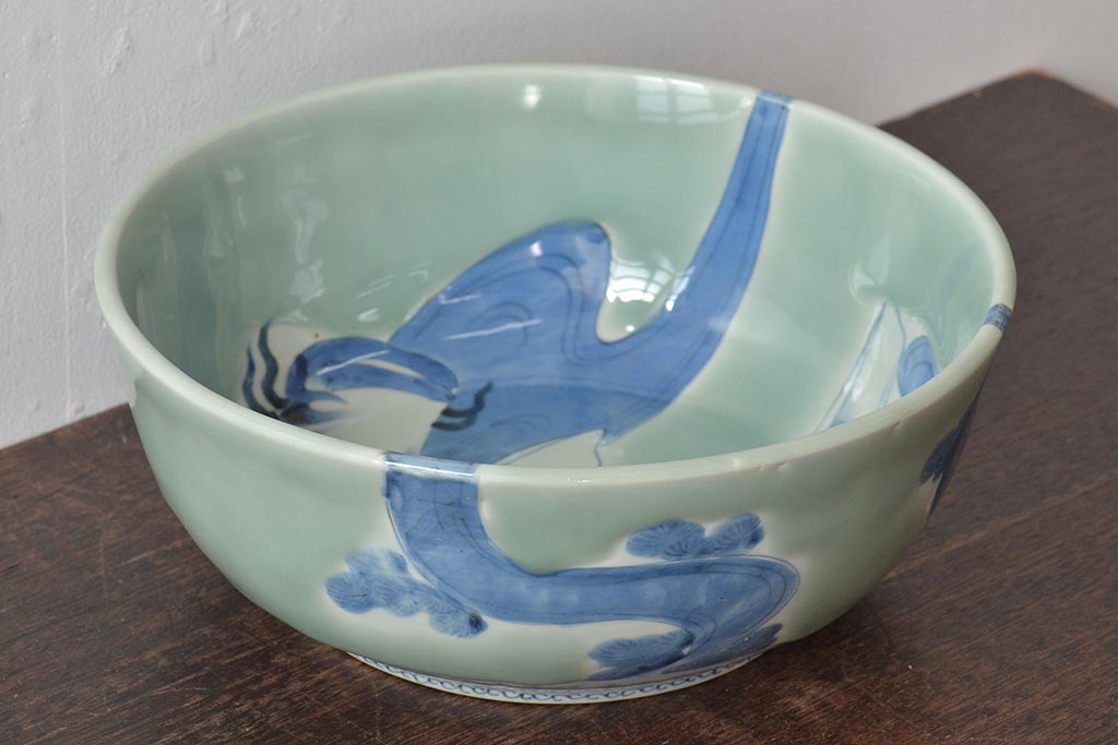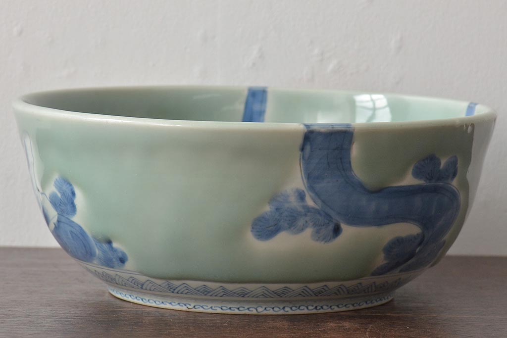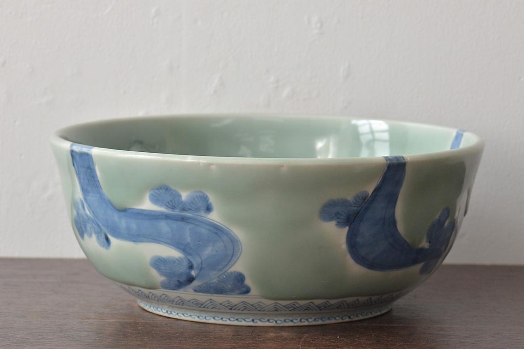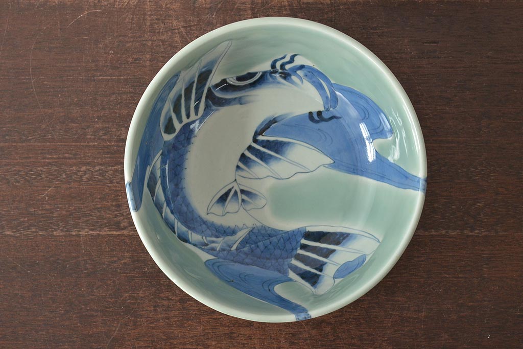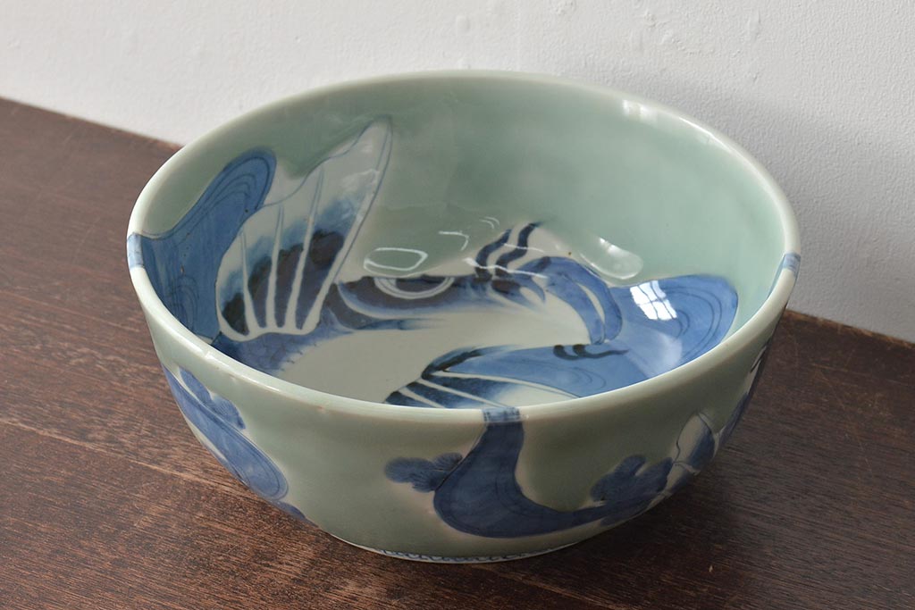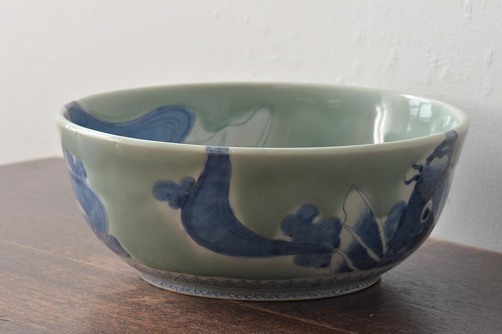 ラフジュ工房> 和食器・茶道具> 鉢 > 江戸期 古伊万里 染付 呉祥瑞銘 鯉の図 青磁 深皿(深鉢、和食器)(R-044863)