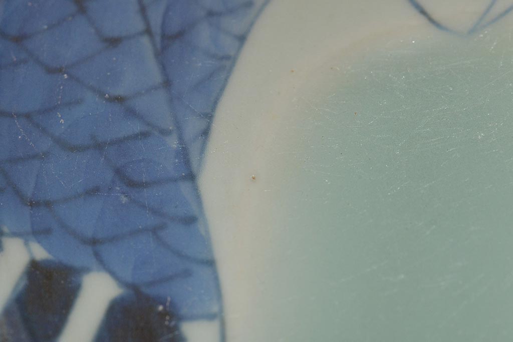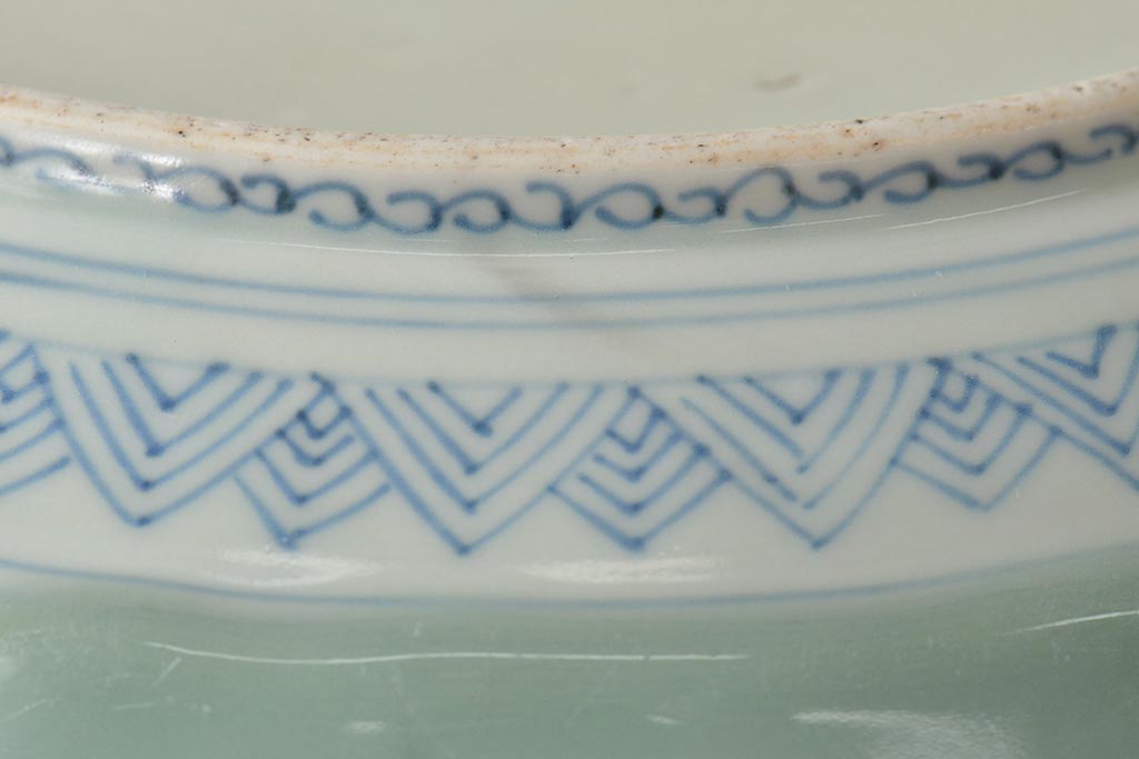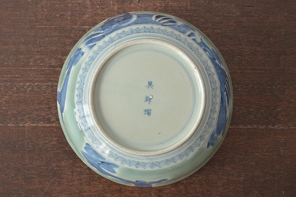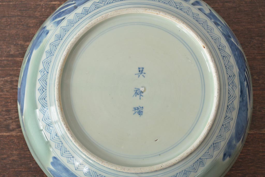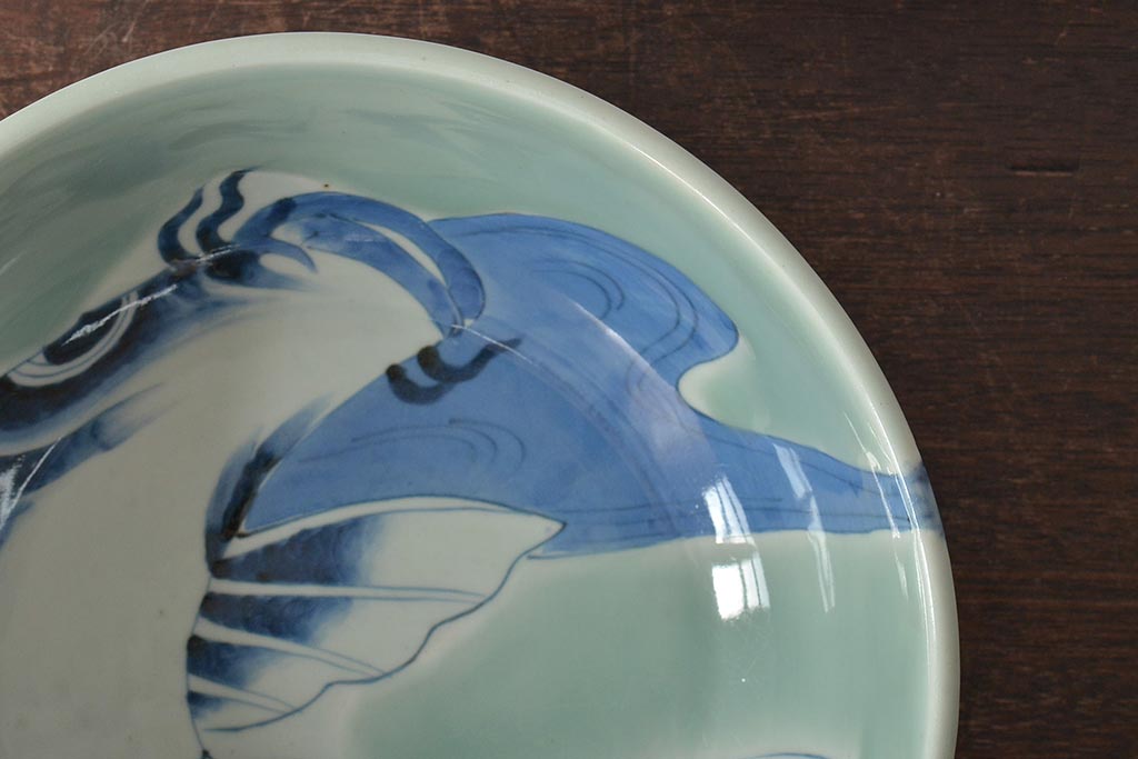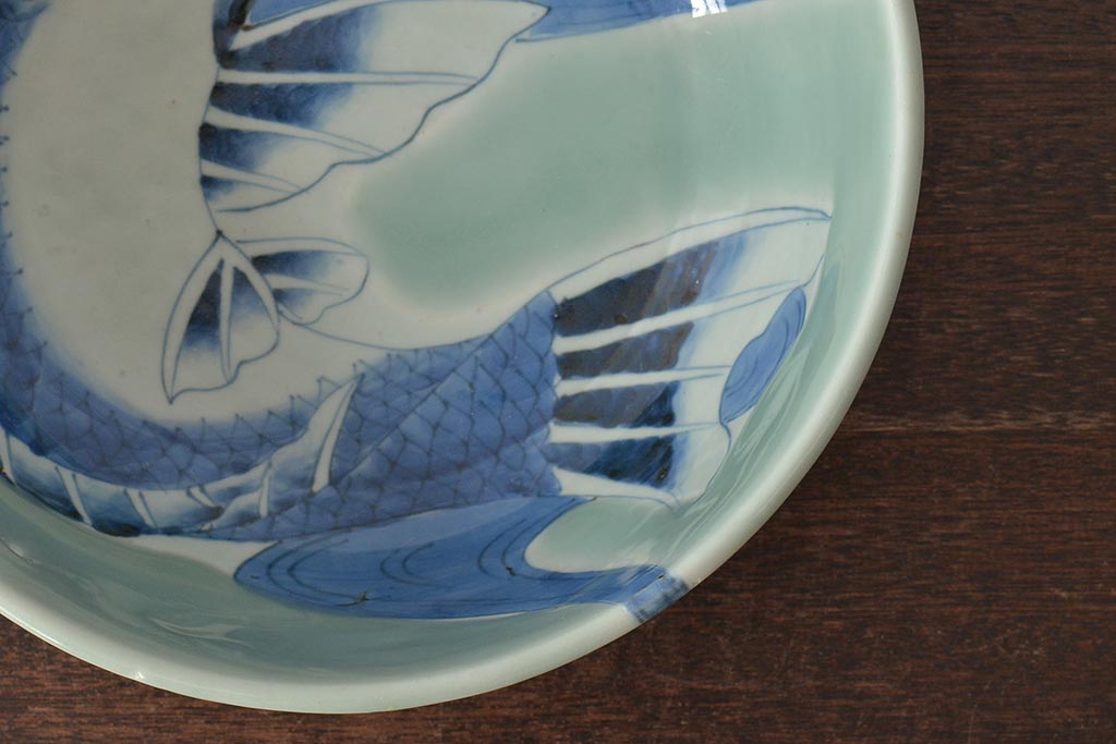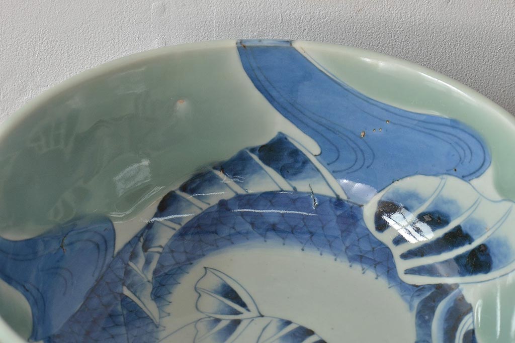 ラフジュ工房> 骨董・美術品> 骨董-陶磁器 > 江戸期 古伊万里 染付 呉祥瑞銘 鯉の図 青磁 深皿(深鉢、和食器)(R-044863)