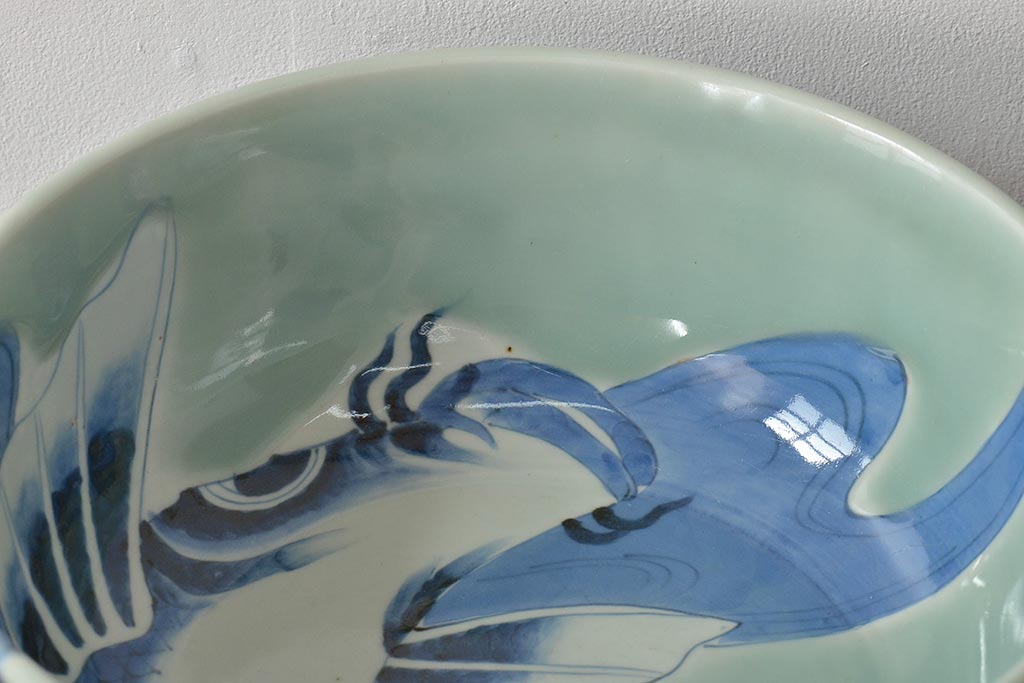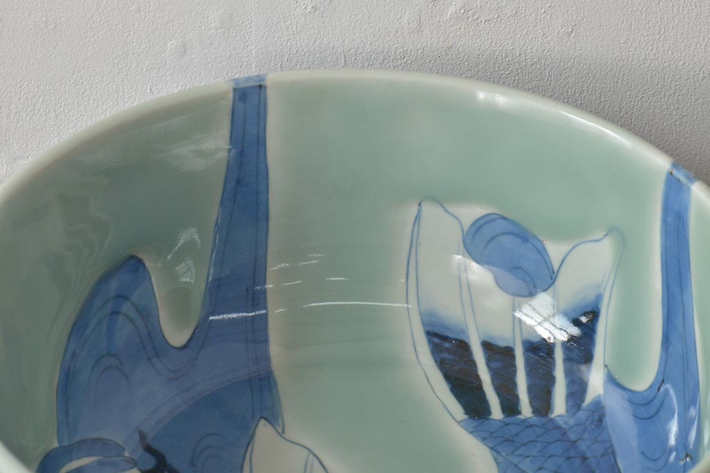 江戸期 古伊万里 染付 呉祥瑞銘 鯉の図 青磁 深皿(深鉢、和食器)(R-044863)