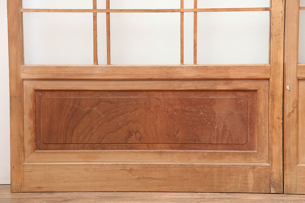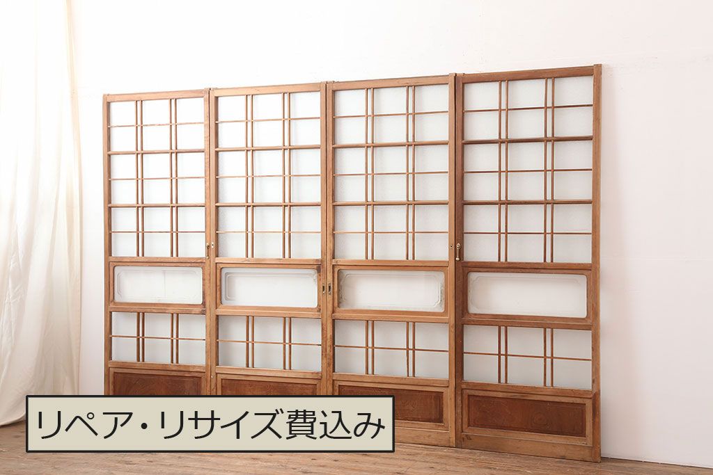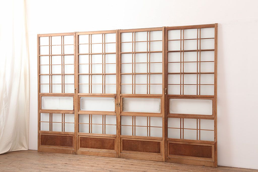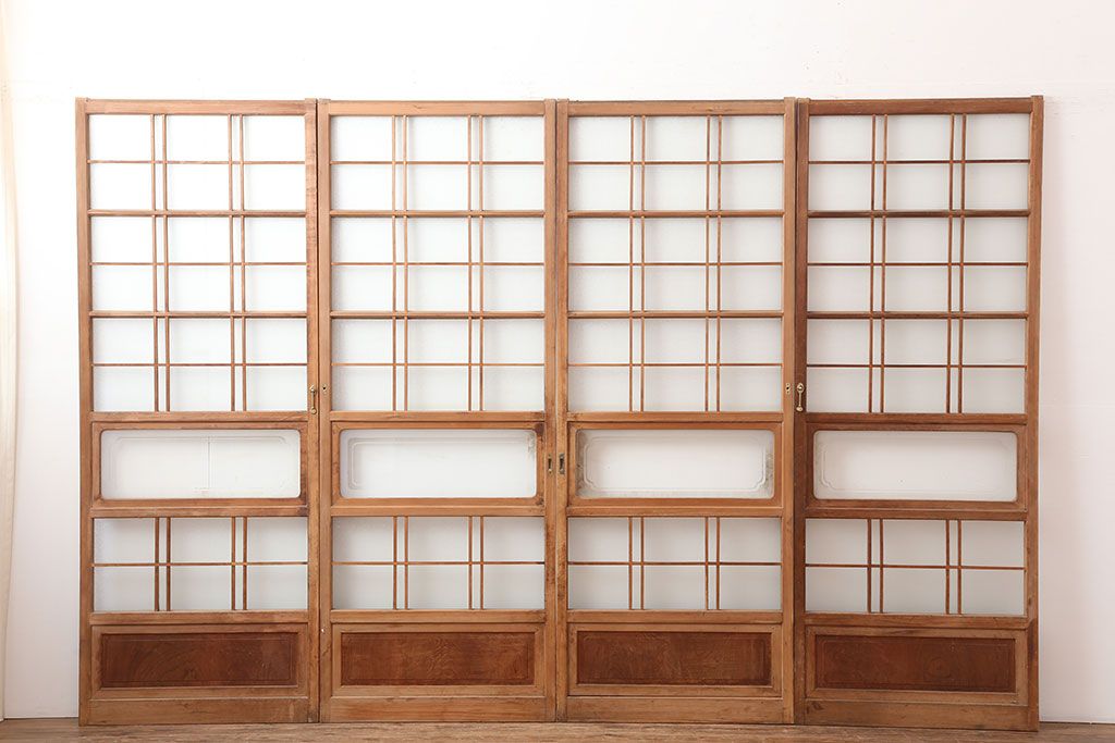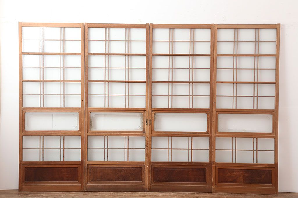 ラフジュ工房> ドア・建具> 4枚〜セット > アンティーク建具 昭和中期 腰板ケヤキ材 レトロなガラス戸4枚セット(引き戸、帯戸、建具)(R-045055)