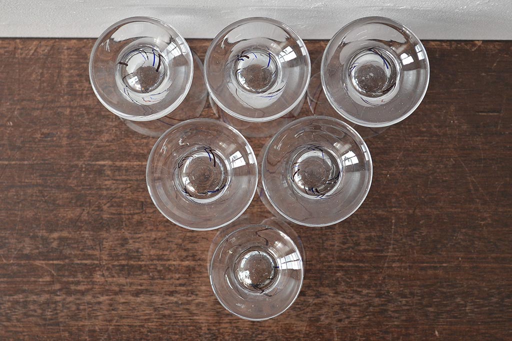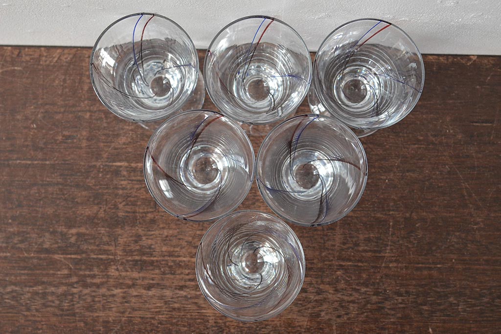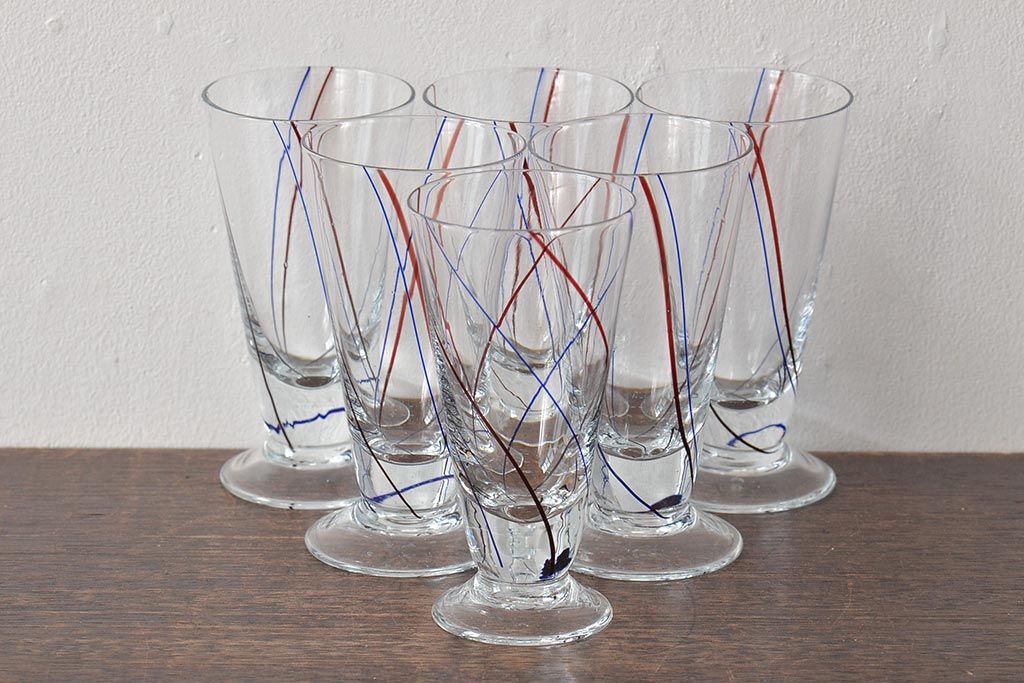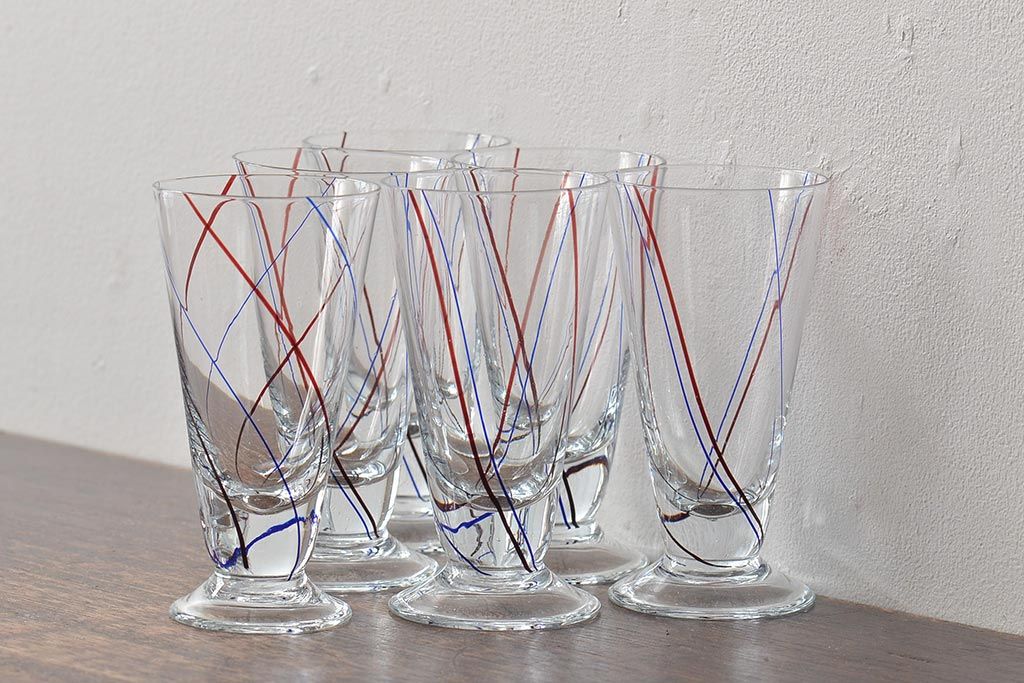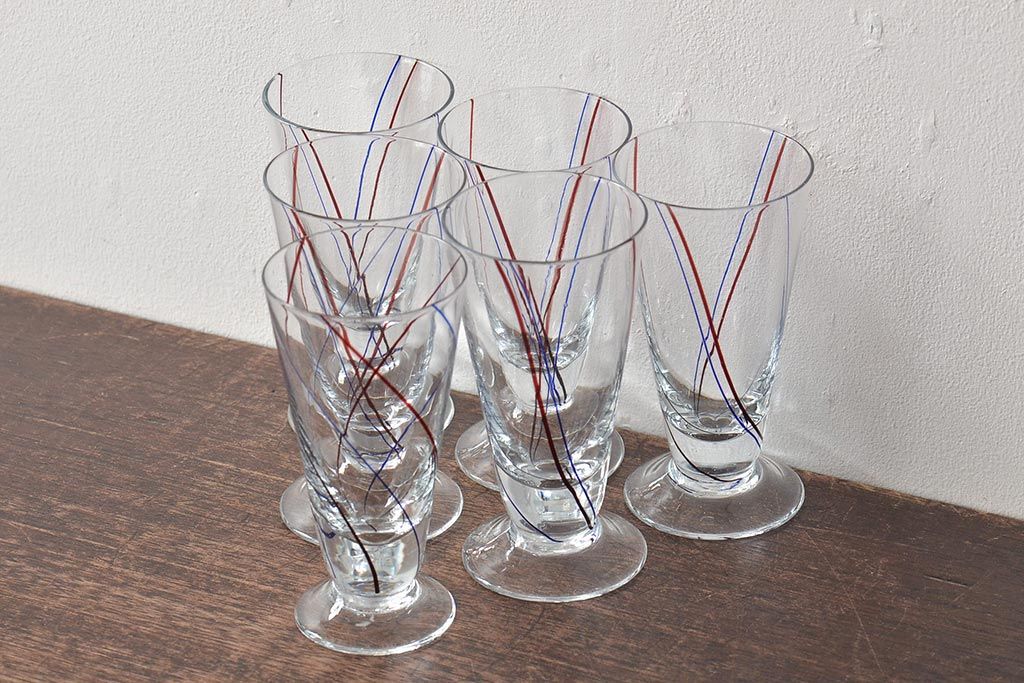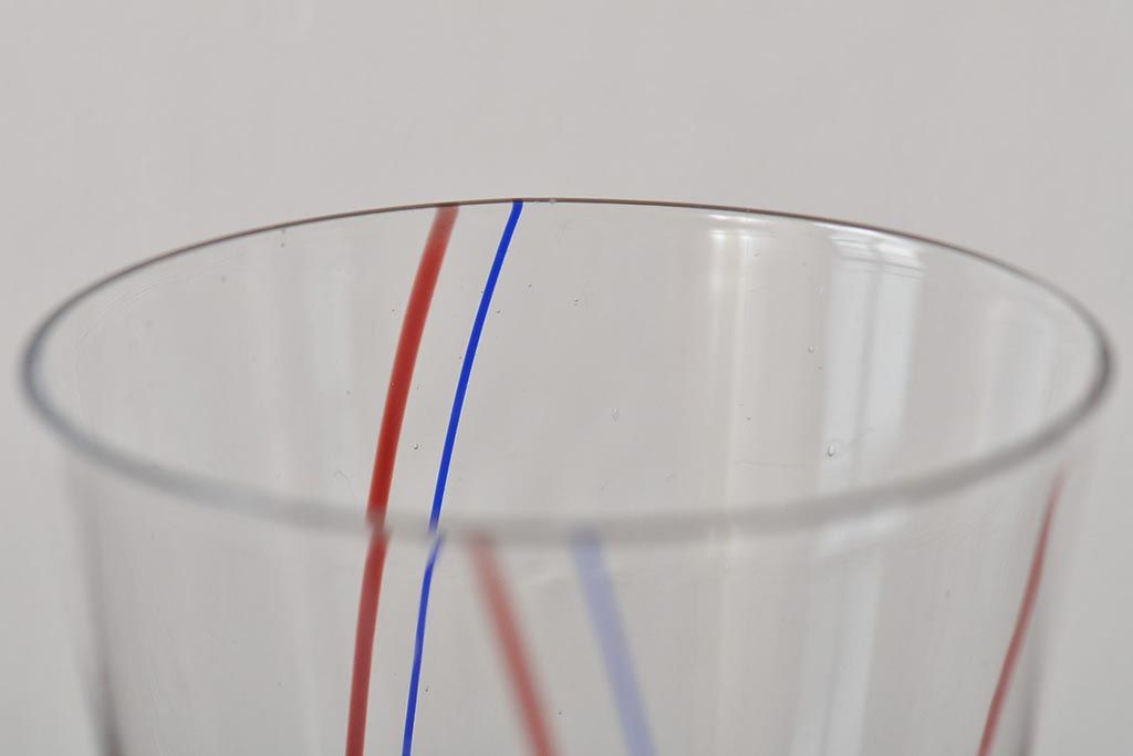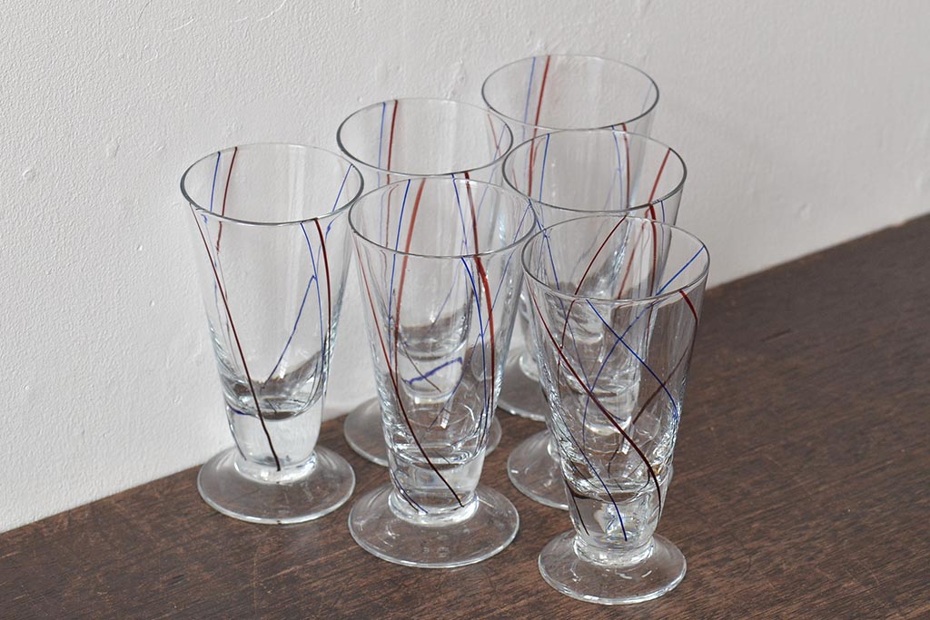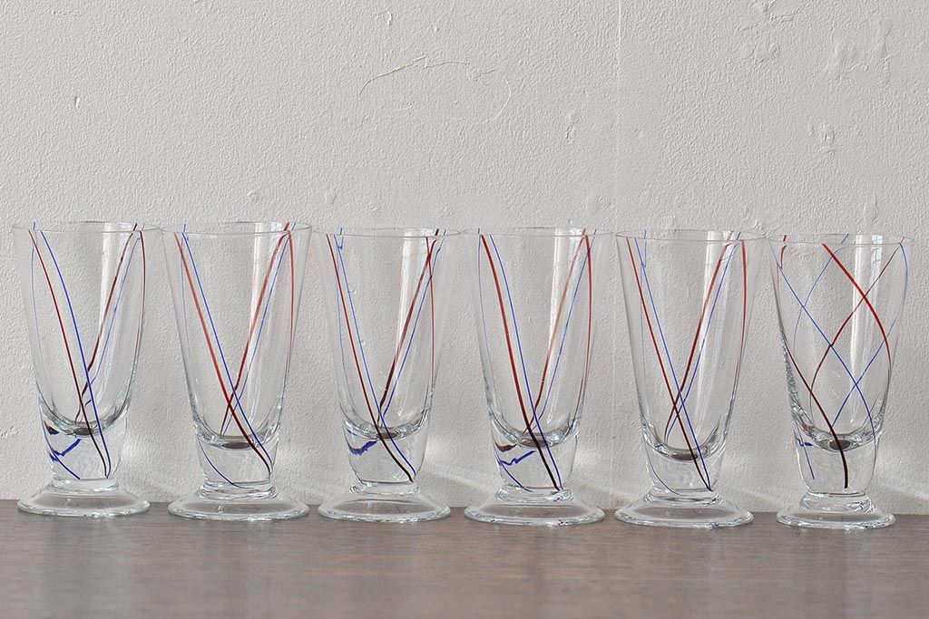 ラフジュ工房> 洋食器・キッチン用品 > 昭和初期 赤青ストライプ ガラスコップ6個セット(レトログラス、和ガラス)(R-044977)