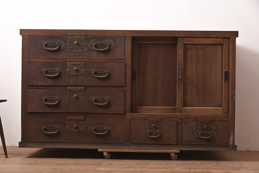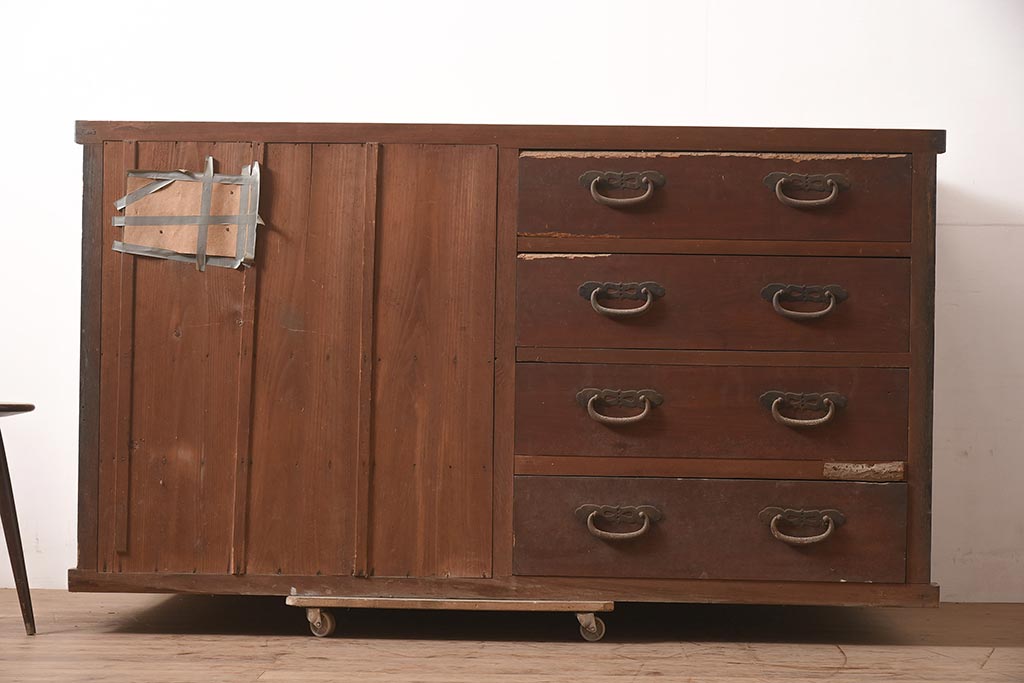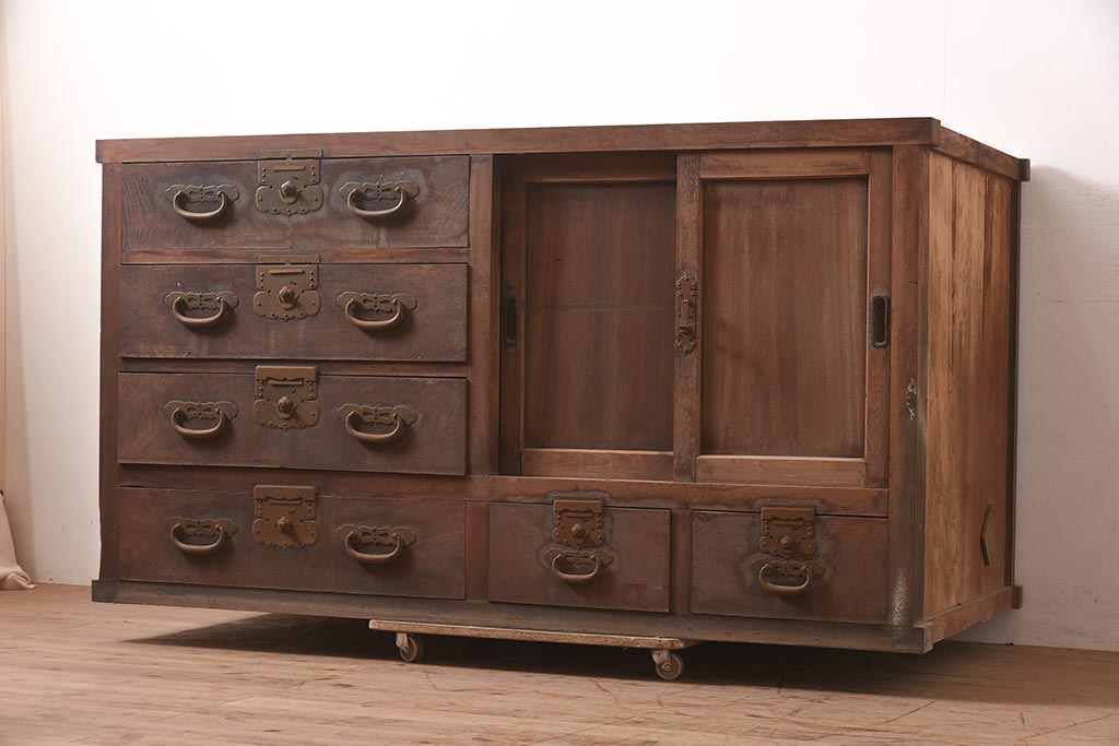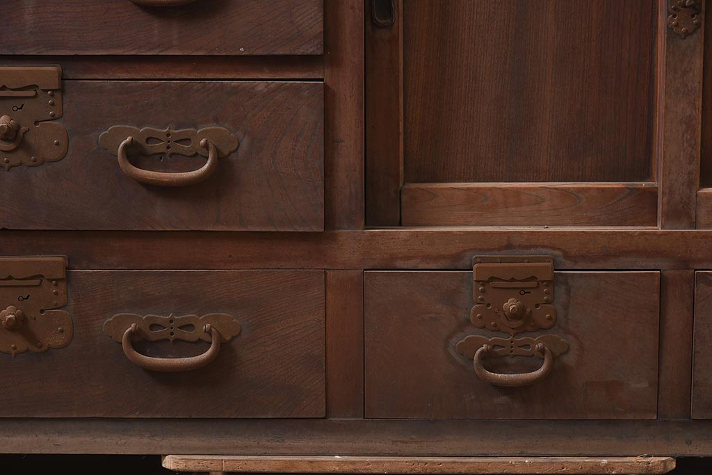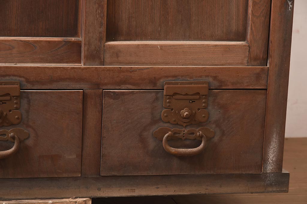 和製アンティーク 明治期 前面ケヤキ材・サクラ材 古い木の温もりを感じる重ね水屋箪笥・下段(収納棚、戸棚、ローボード)(R-036340)
