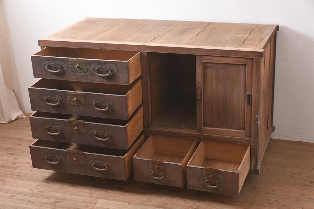 ラフジュ工房> キャビネット・戸棚> テレビ台・ローボード > 和製アンティーク 明治期 前面ケヤキ材・サクラ材 古い木の温もりを感じる重ね水屋箪笥・下段(収納棚、戸棚、ローボード)(R-036340)