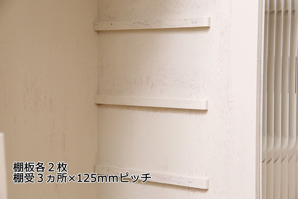 棚板は取り外しできます。棚板は各2枚あります。棚受けは3ヶ所、125mmピッチで調整できます。棚幅サイズのものが1枚の作りです。
