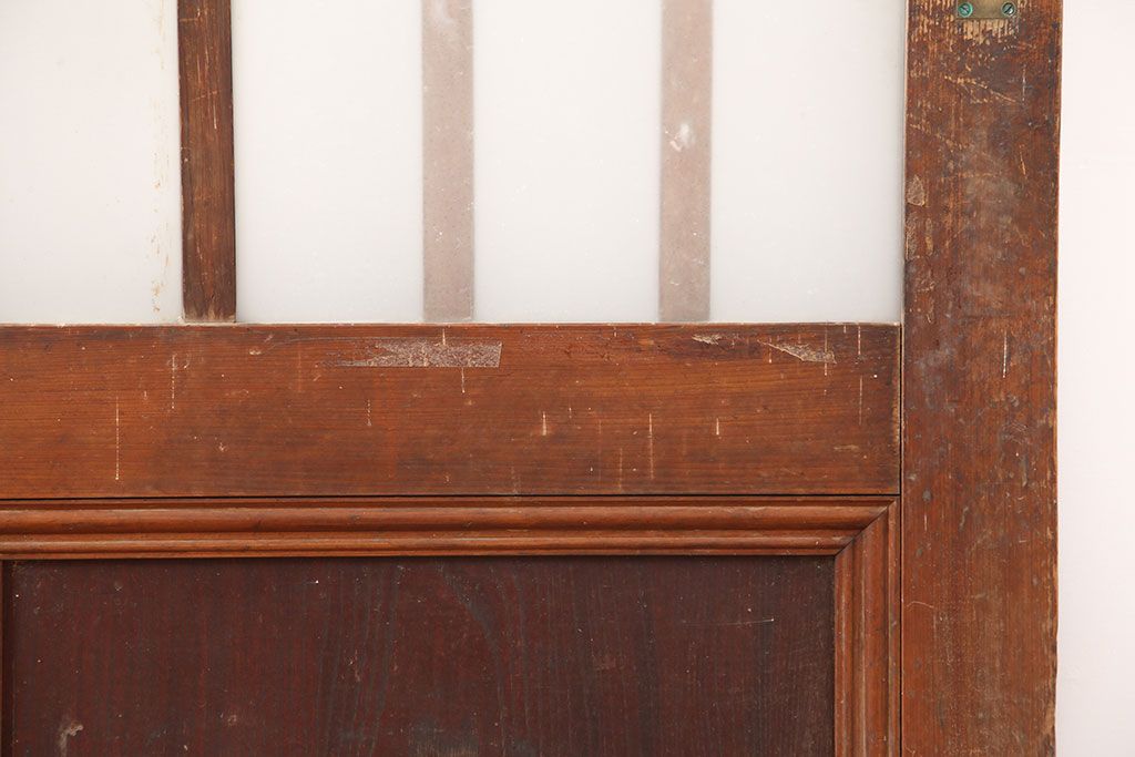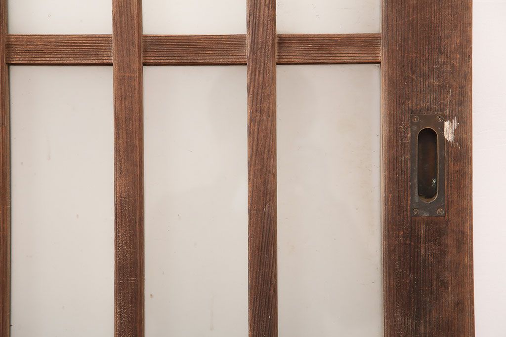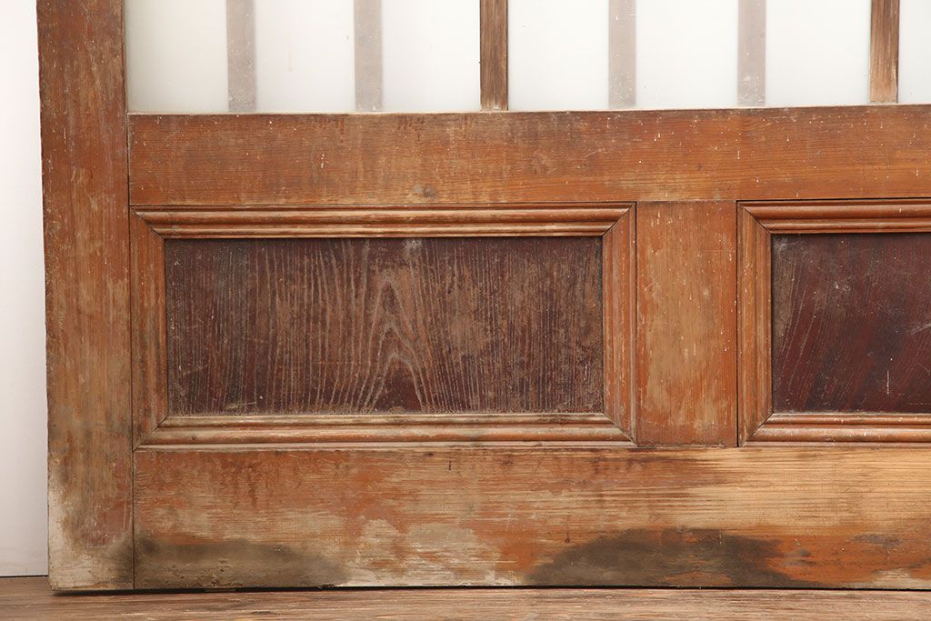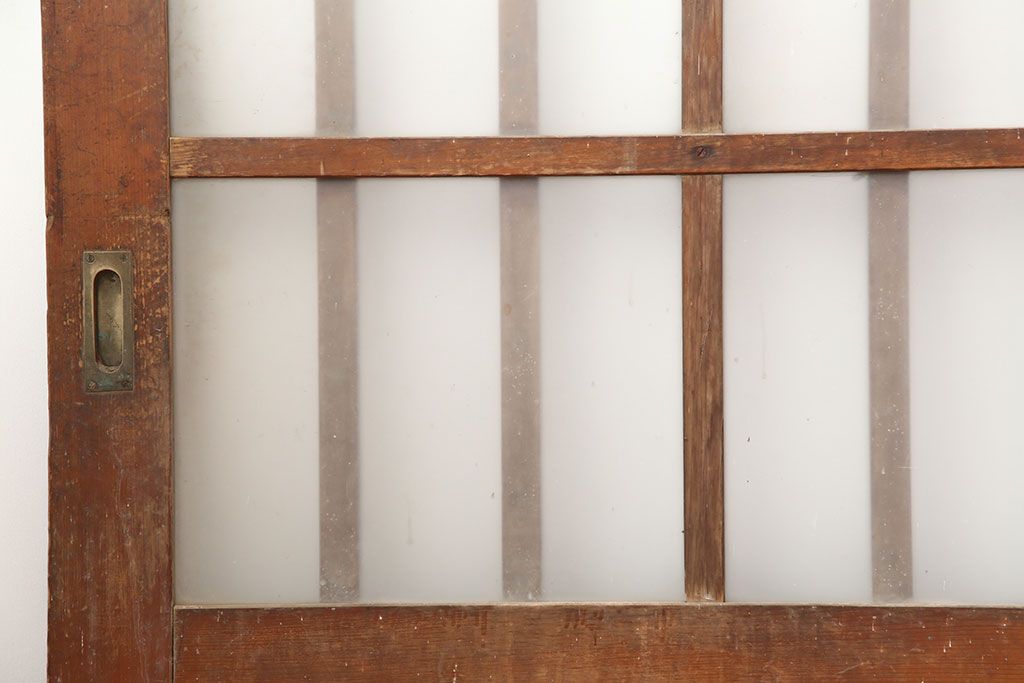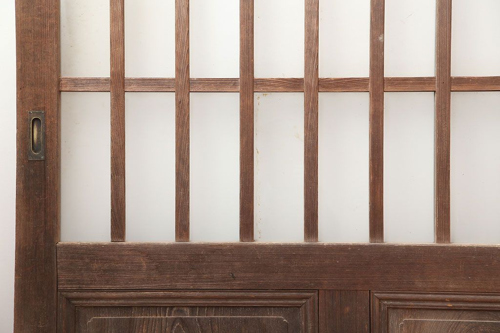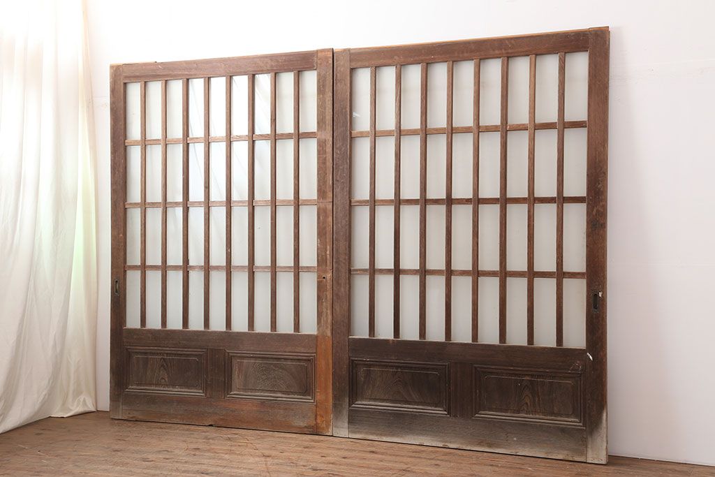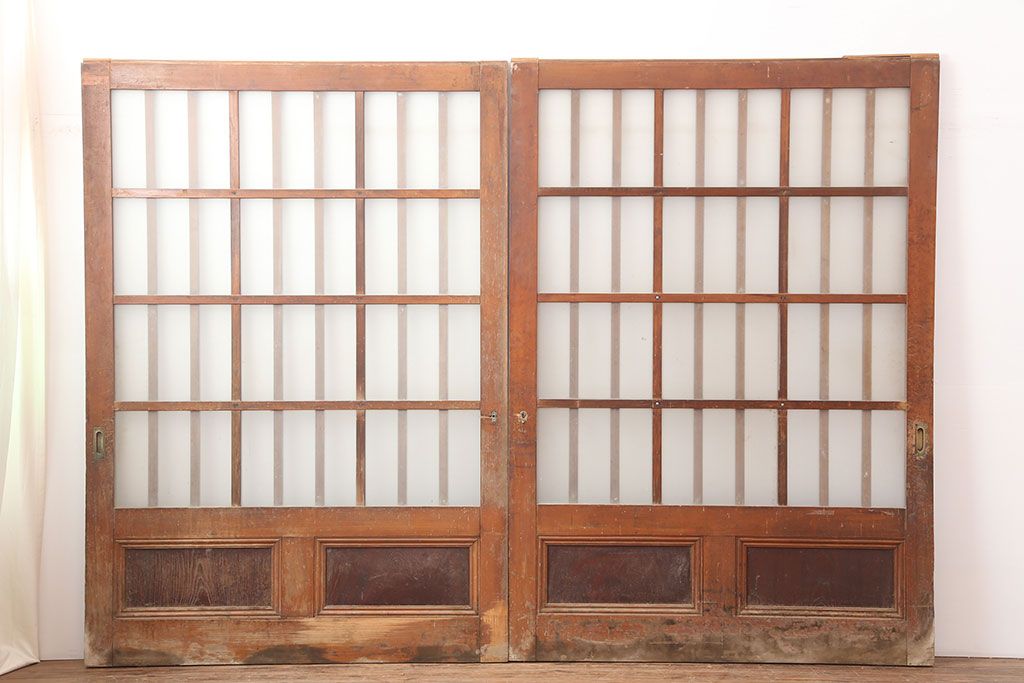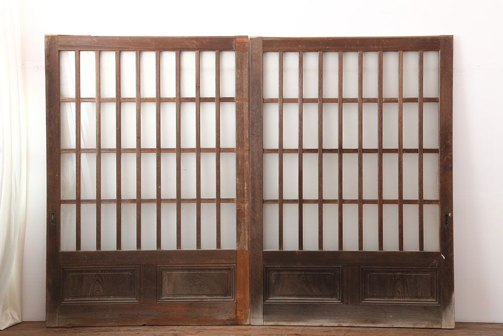 ラフジュ工房> ドア・建具> 引き戸 > アンティーク建具 昭和初期 ヒノキ材・腰板ケヤキ材 背高サイズの格子ガラス戸2枚セット(引き戸、建具、蔵戸、玄関戸)(R-044887)