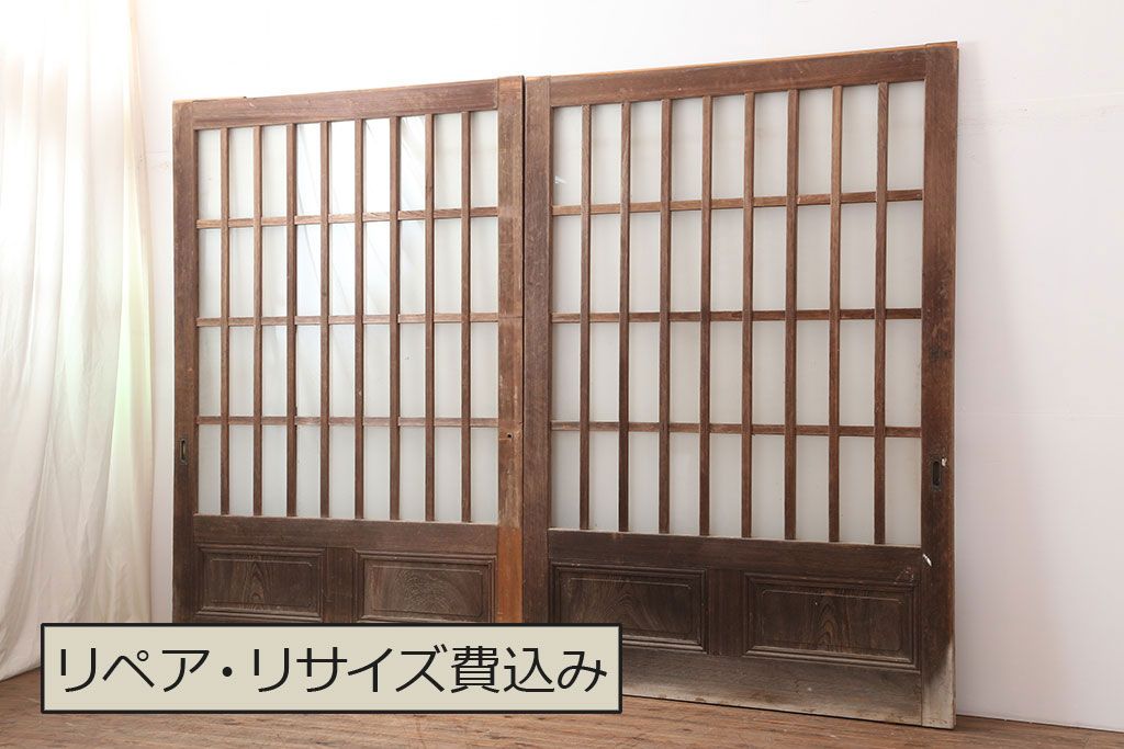 ラフジュ工房> ドア・建具> 2枚・3枚セット > アンティーク建具 昭和初期 ヒノキ材・腰板ケヤキ材 背高サイズの格子ガラス戸2枚セット(引き戸、建具、蔵戸、玄関戸)(R-044887)