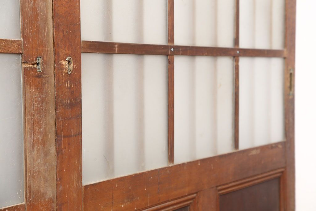 ラフジュ工房> ドア・建具> ガラス戸 > アンティーク建具 昭和初期 ヒノキ材・腰板ケヤキ材 背高サイズの格子ガラス戸2枚セット(引き戸、建具、蔵戸、玄関戸)(R-044887)
