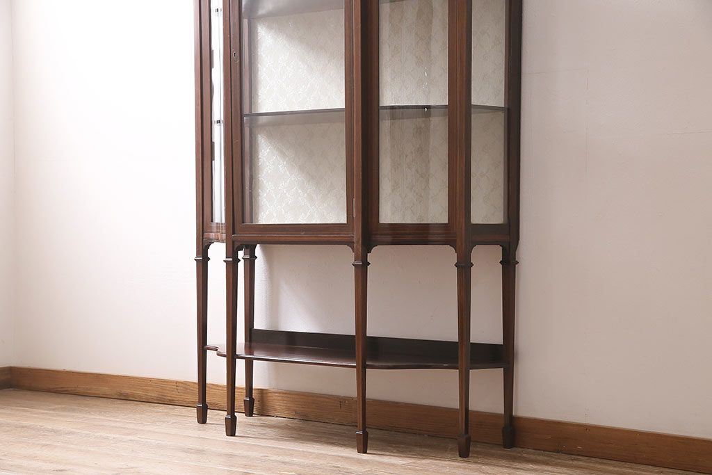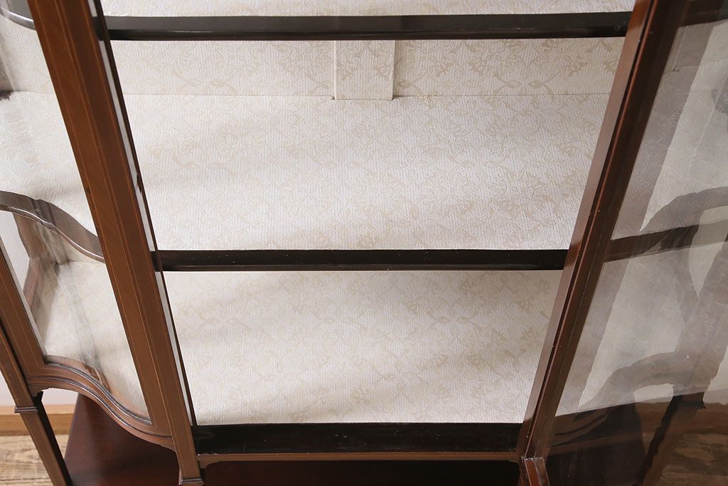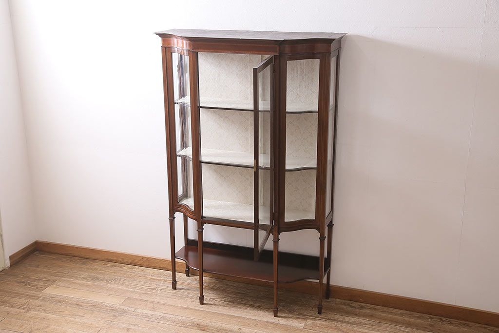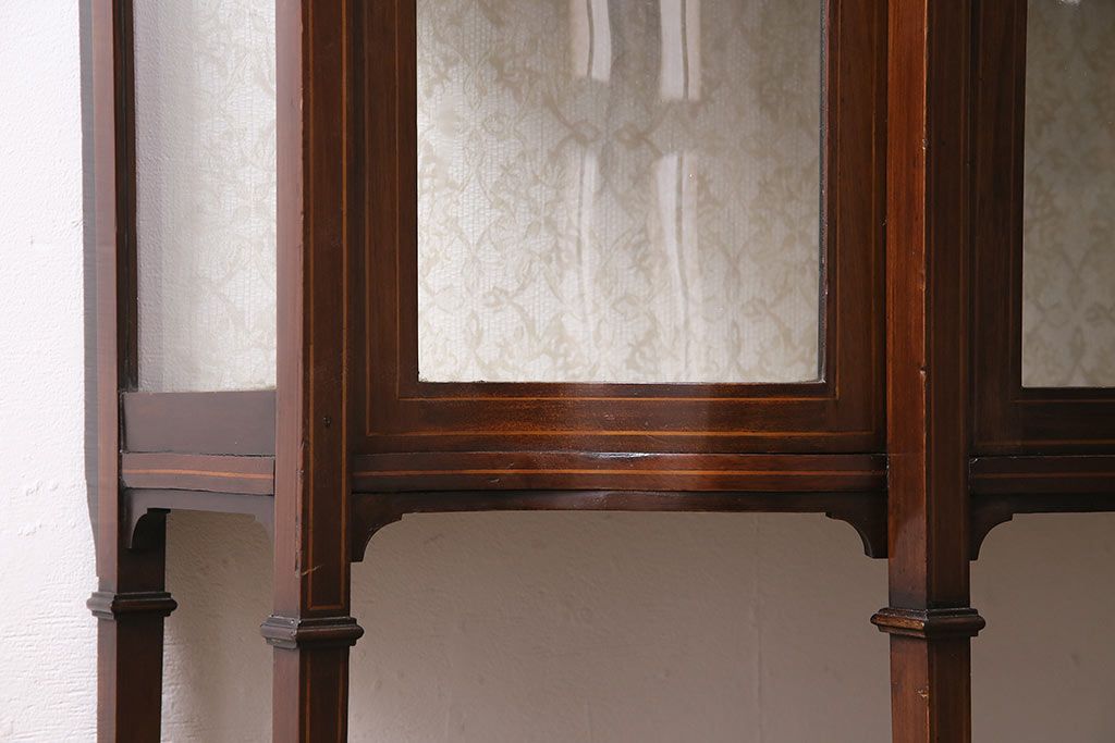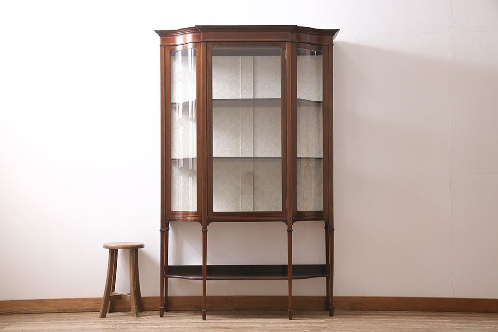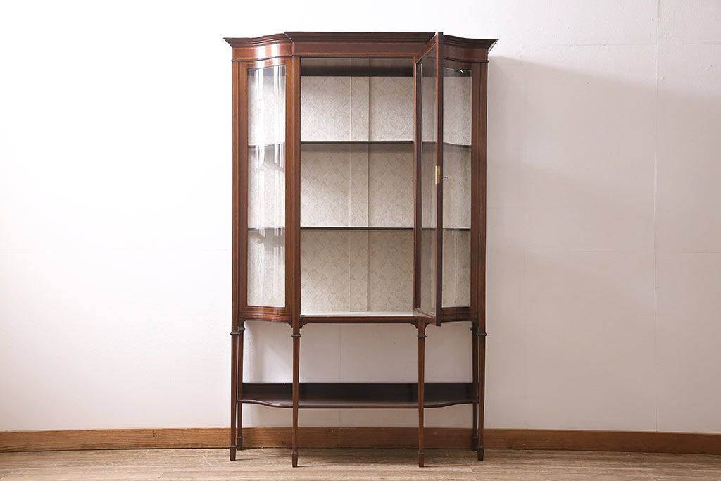 店舗什器 > イギリスアンティーク マホガニー材 象嵌の装飾が高級感を漂わせるガラスキャビネット(チャイナキャビナット、ガラスケース、ショーケース、陳列棚)(R-045352)