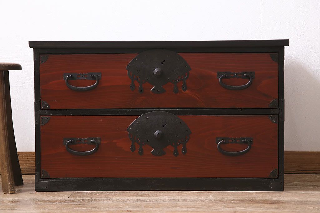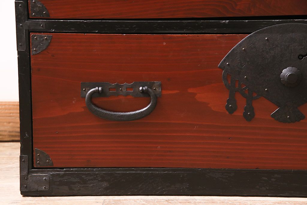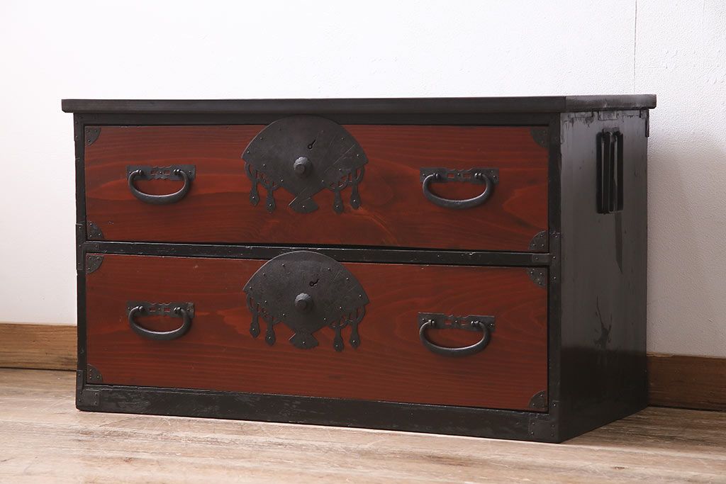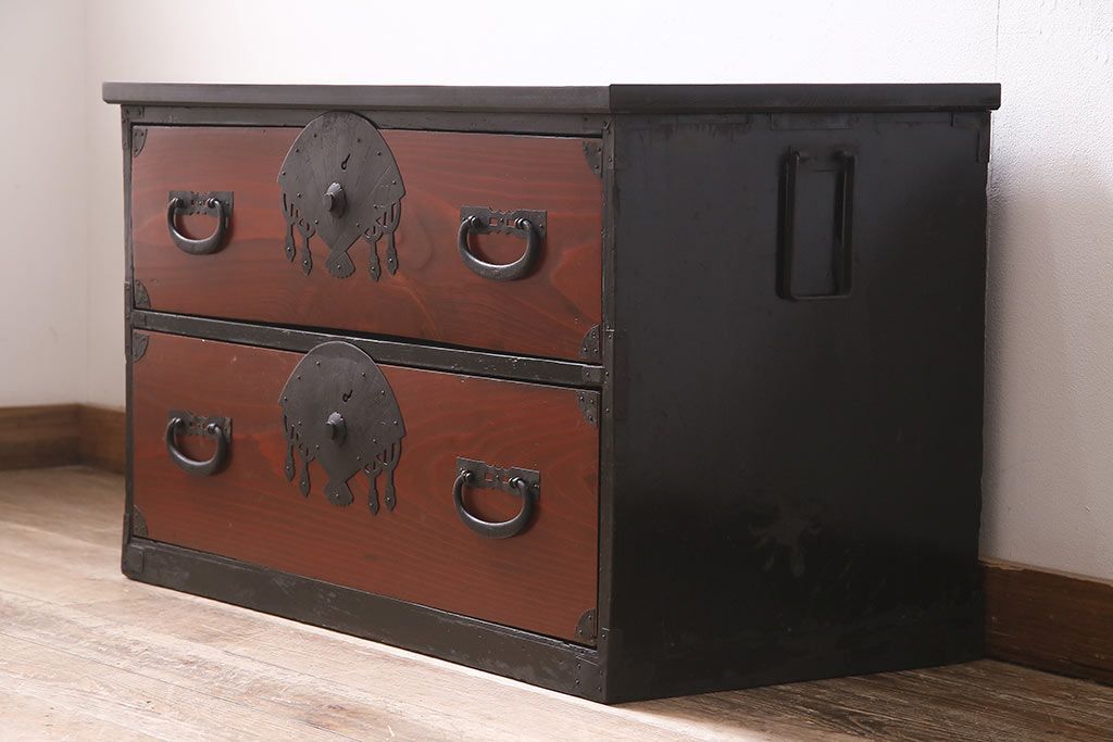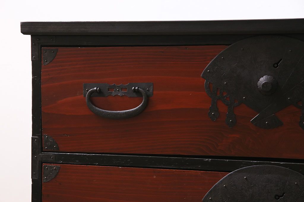 アンティーク家具 明治大正期 扇の飾り金具が存在感を引き立てる箪笥ローボード(衣装箪笥、引き出し)(R-039864)です。