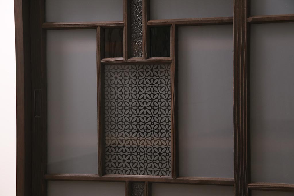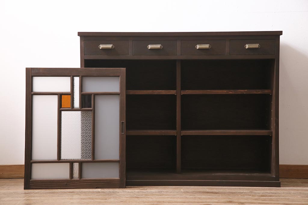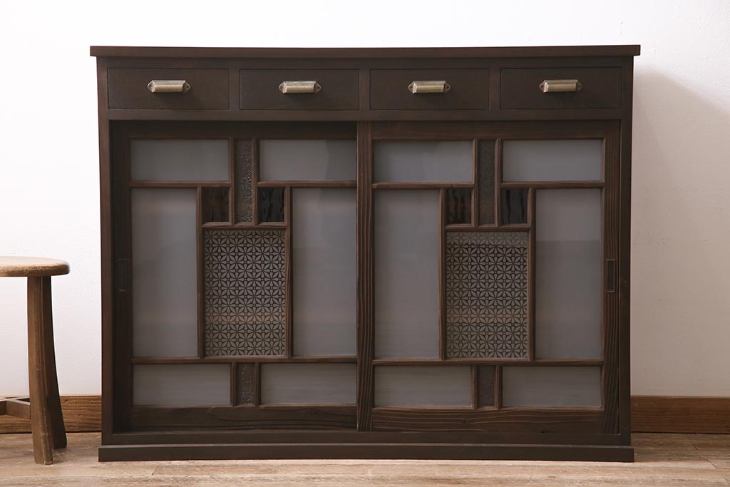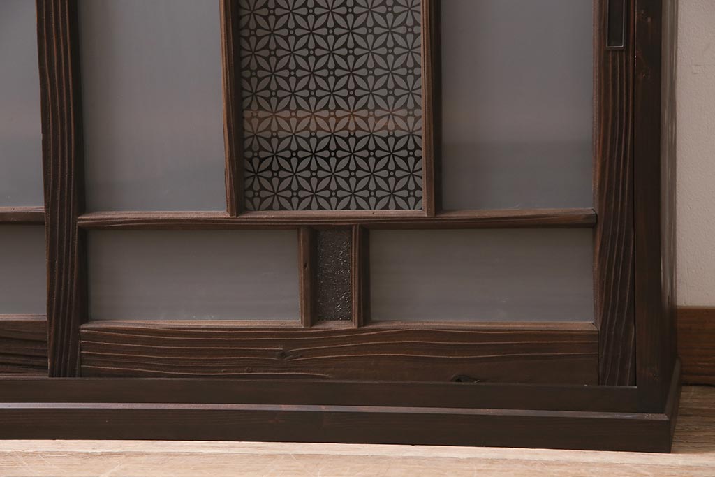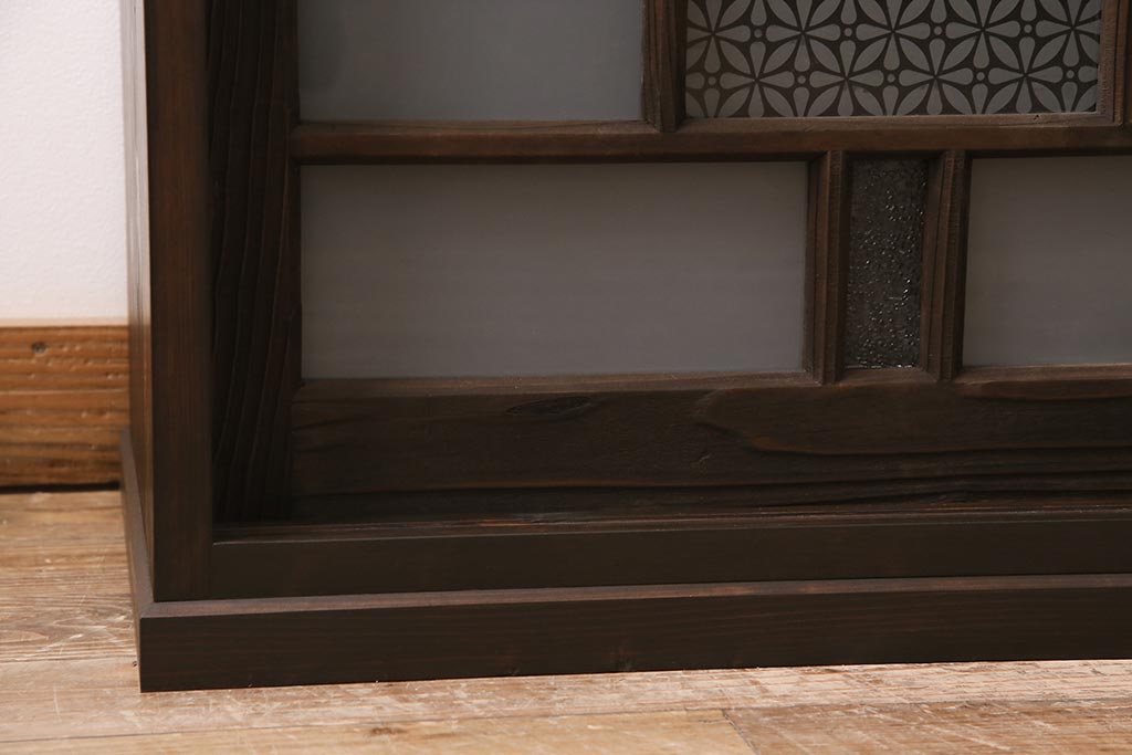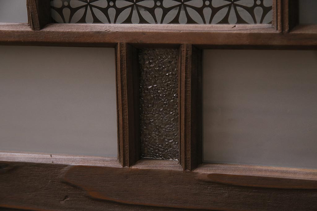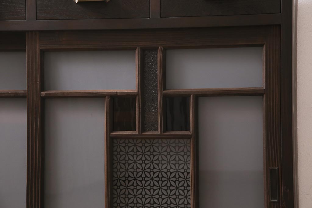 ラフジュ工房オリジナル 古建具リメイク ダイヤガラス・すりガラス・花菱文様ガラス 大正ロマン薫るキャビネット(ガラス戸棚、収納棚)(R-045559)