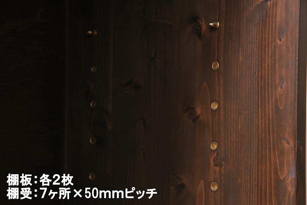 棚板は取り外しできます。棚板は各2枚あります。棚受けは7ヶ所、50mmピッチで調整できます。棚幅サイズのものが1枚の作りです。