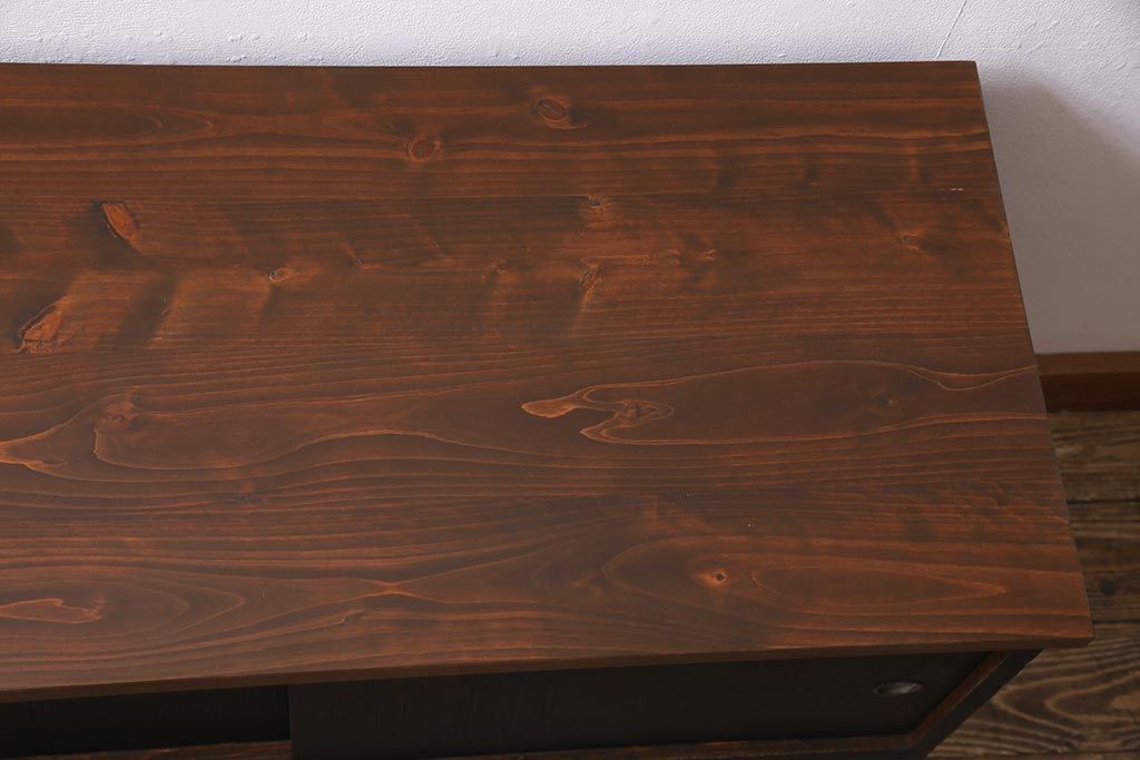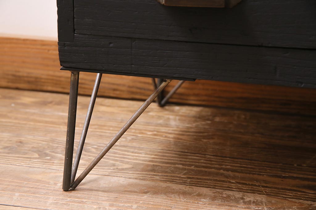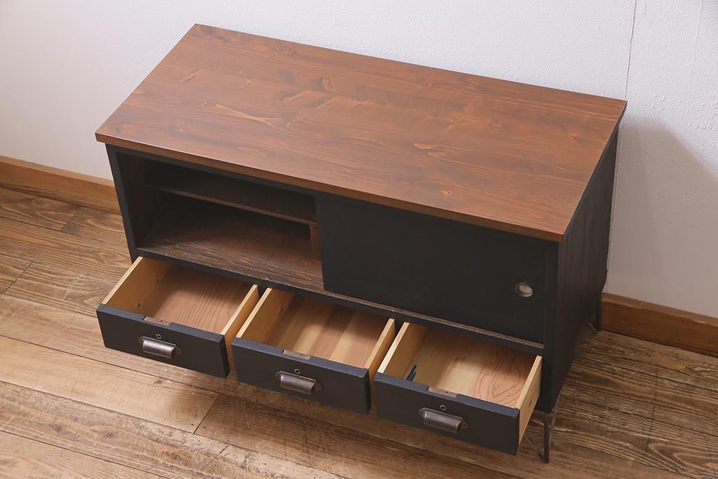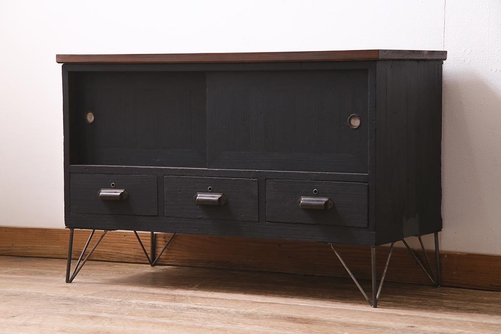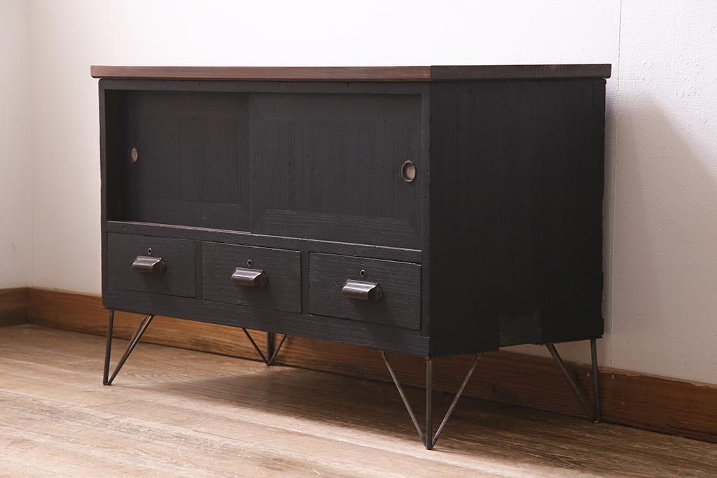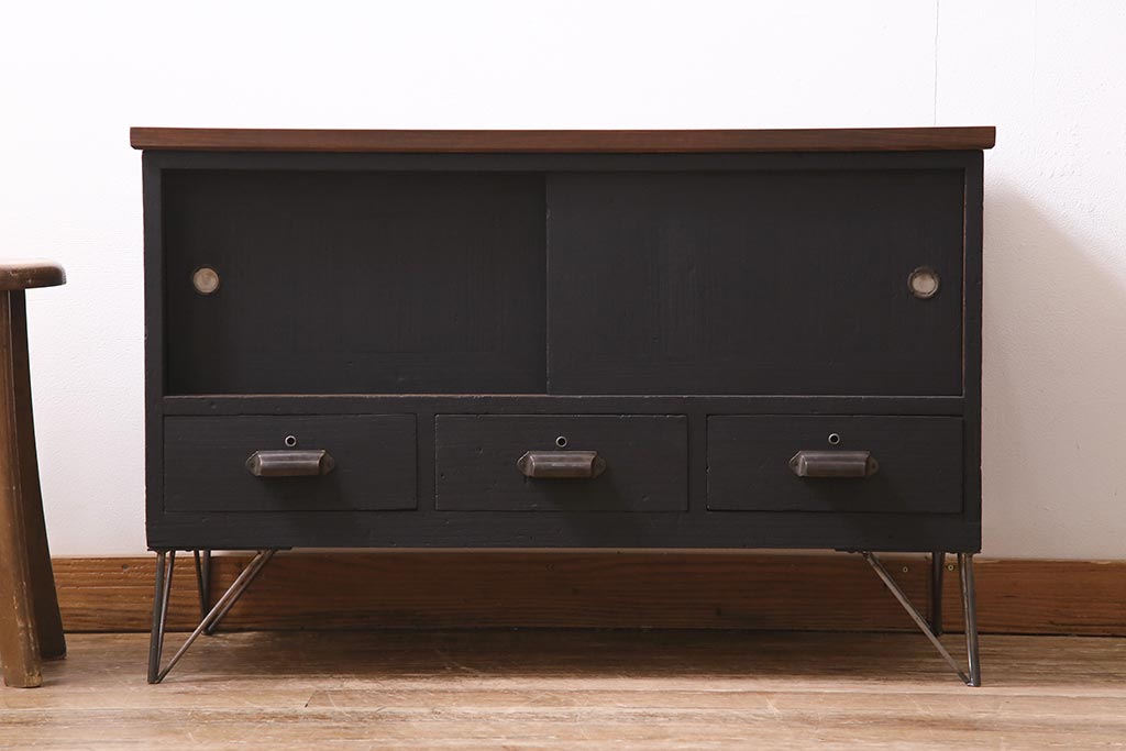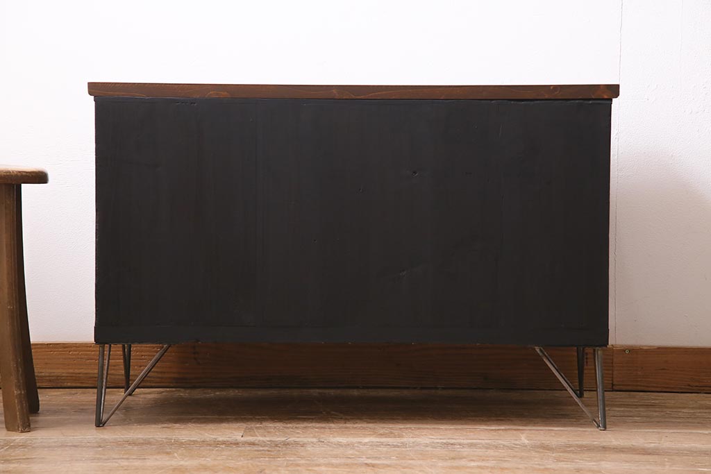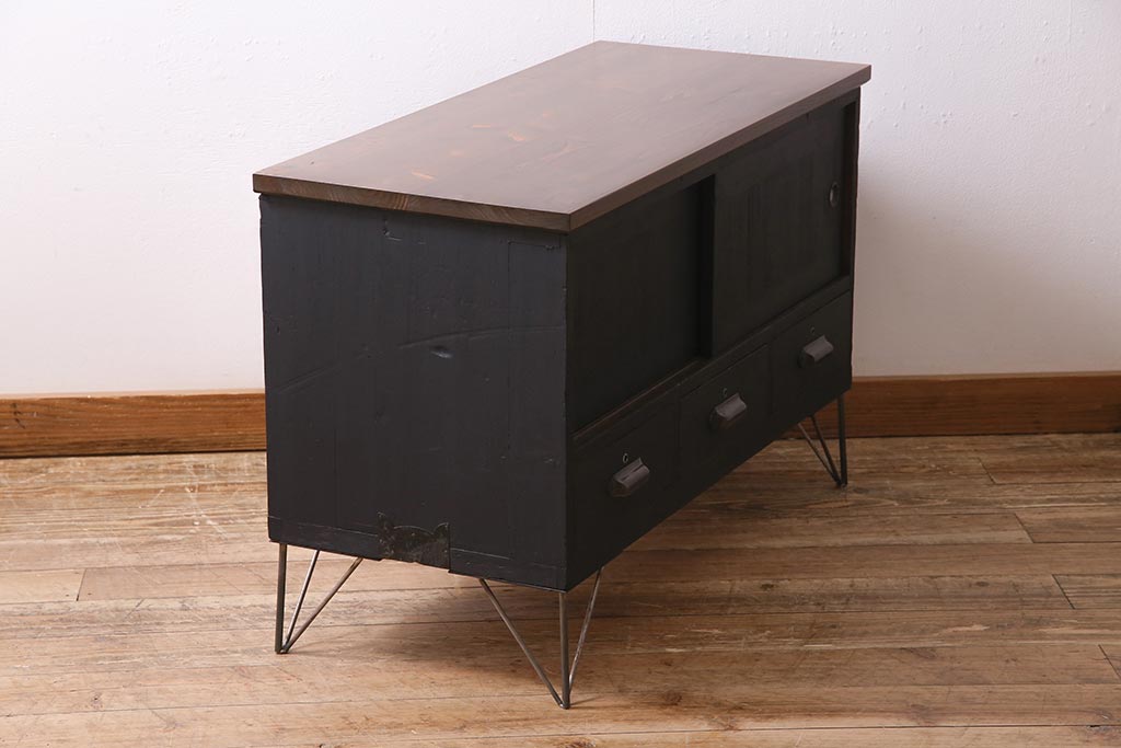 アンティーク家具 和製 昭和中期 天板リメイク 前面桐材 ツートンカラーがおしゃれな鉄脚付きローボード(戸棚、収納棚)(R-045302)