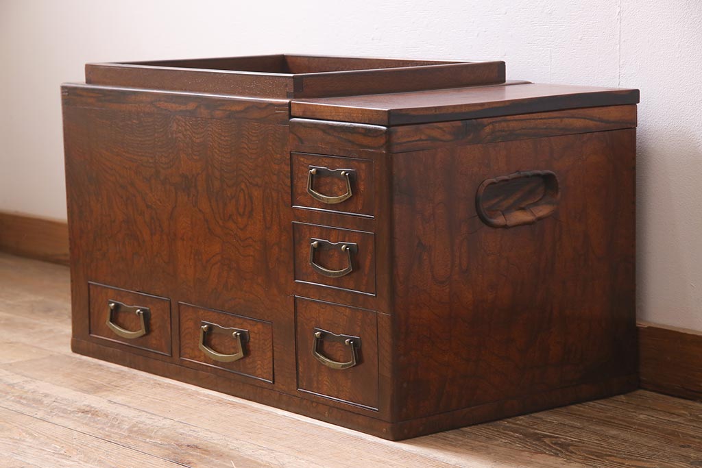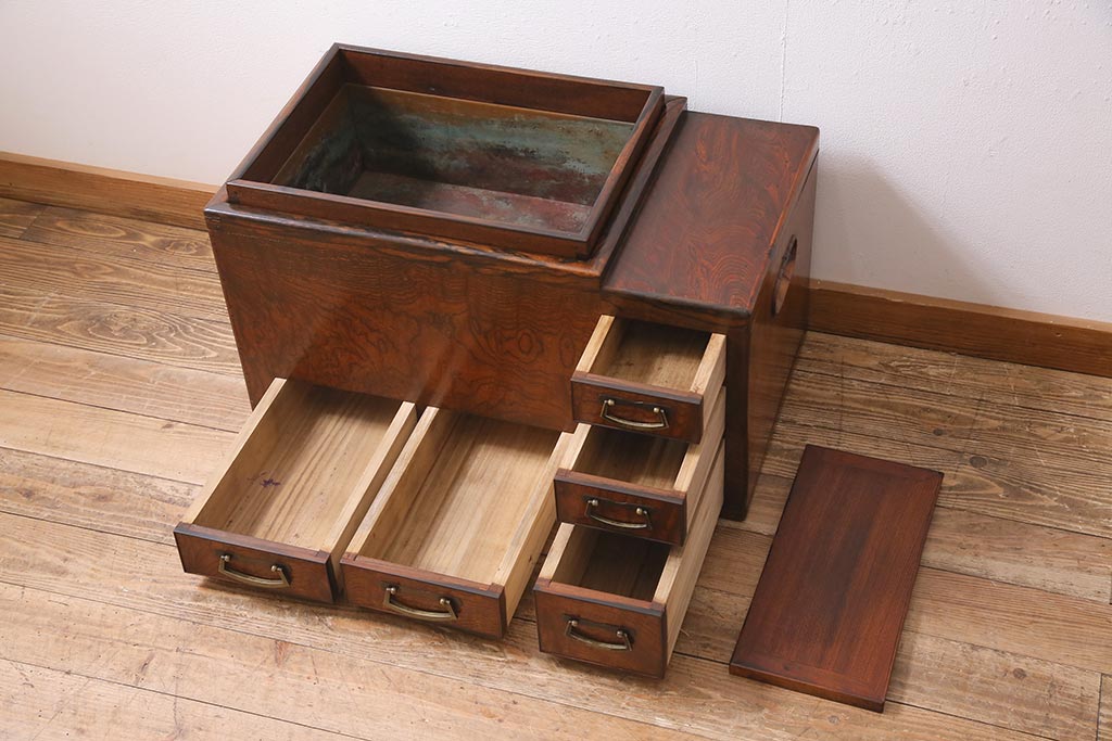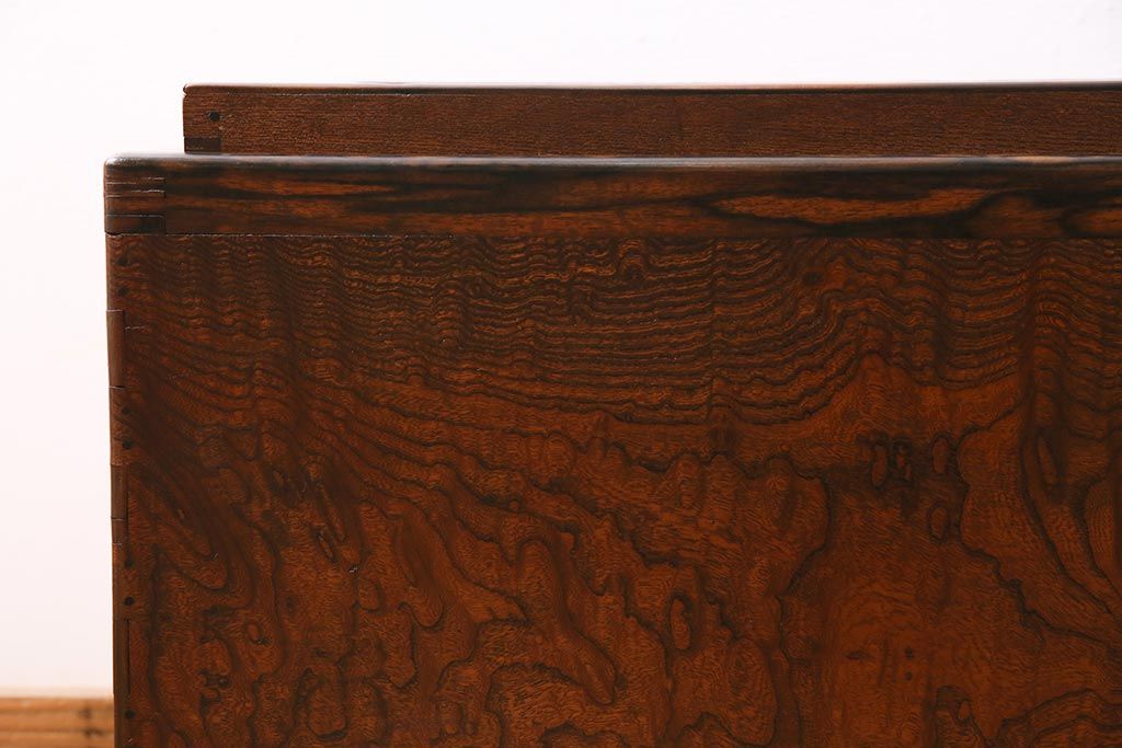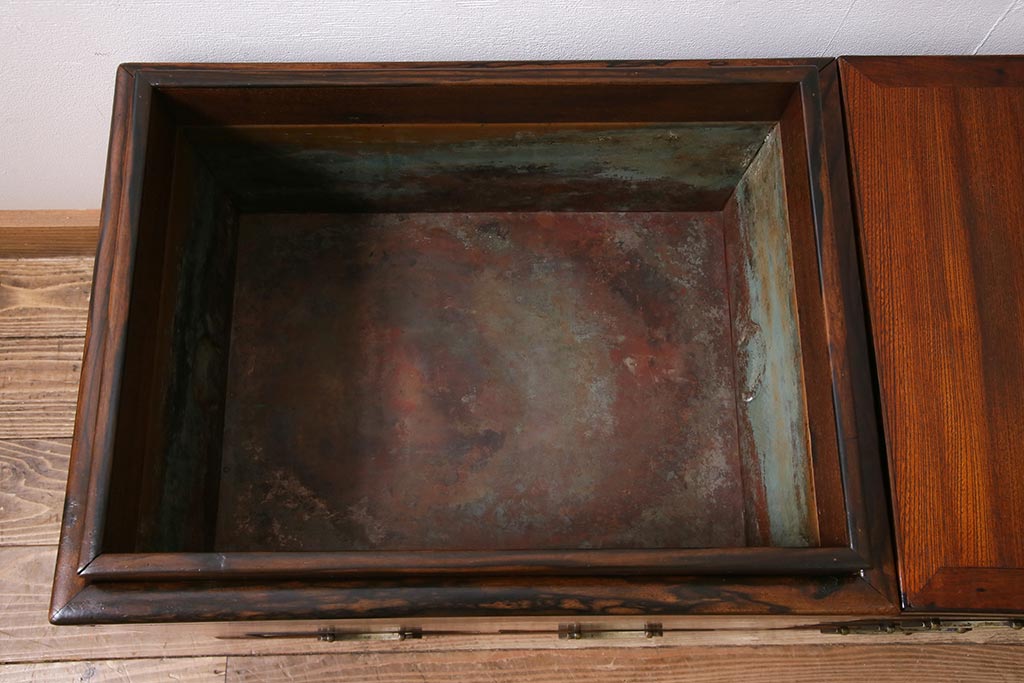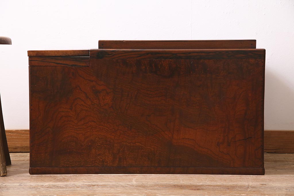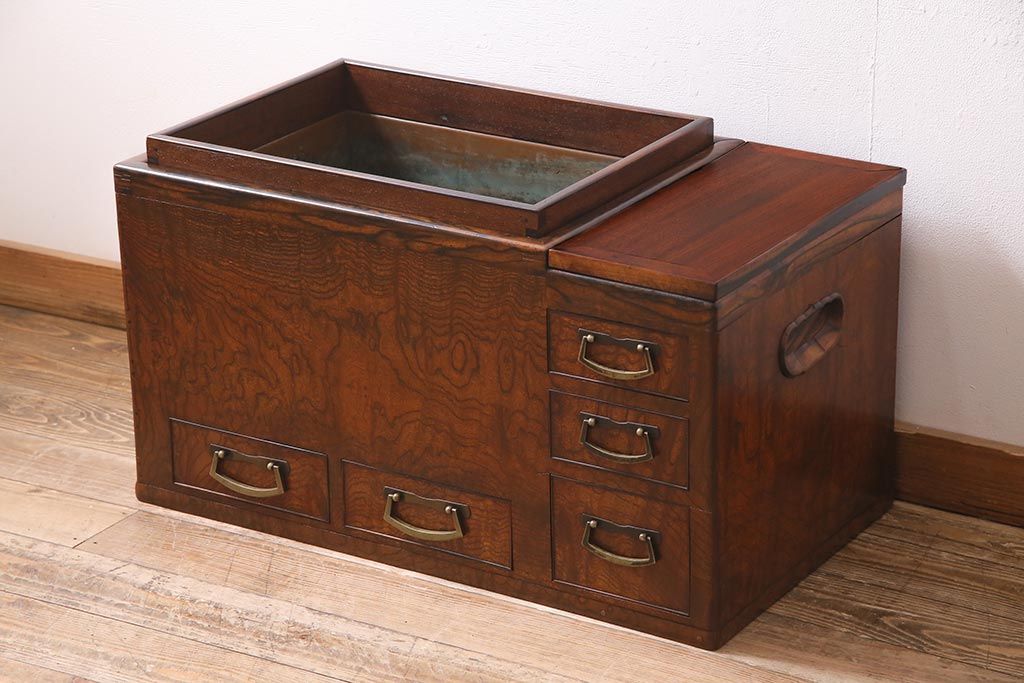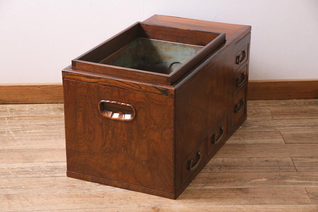 火鉢> 木製火鉢 > アンティーク雑貨 昭和初期 ケヤキ材・縁黒柿材 和の高級感漂う長火鉢(木製火鉢)(R-045515)