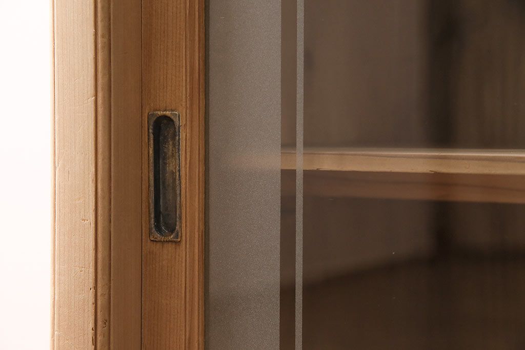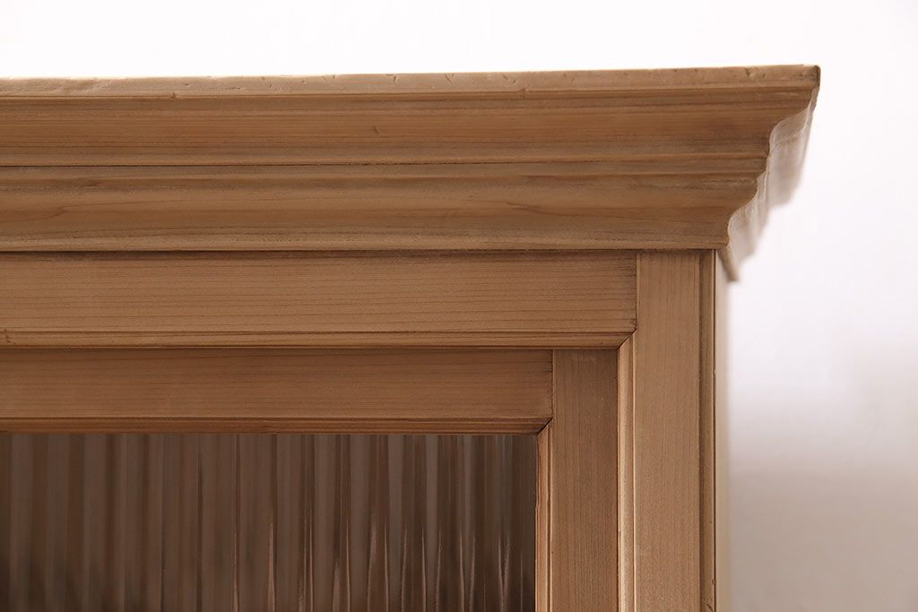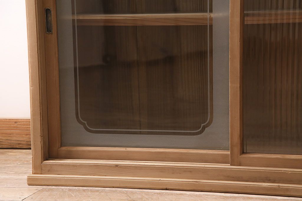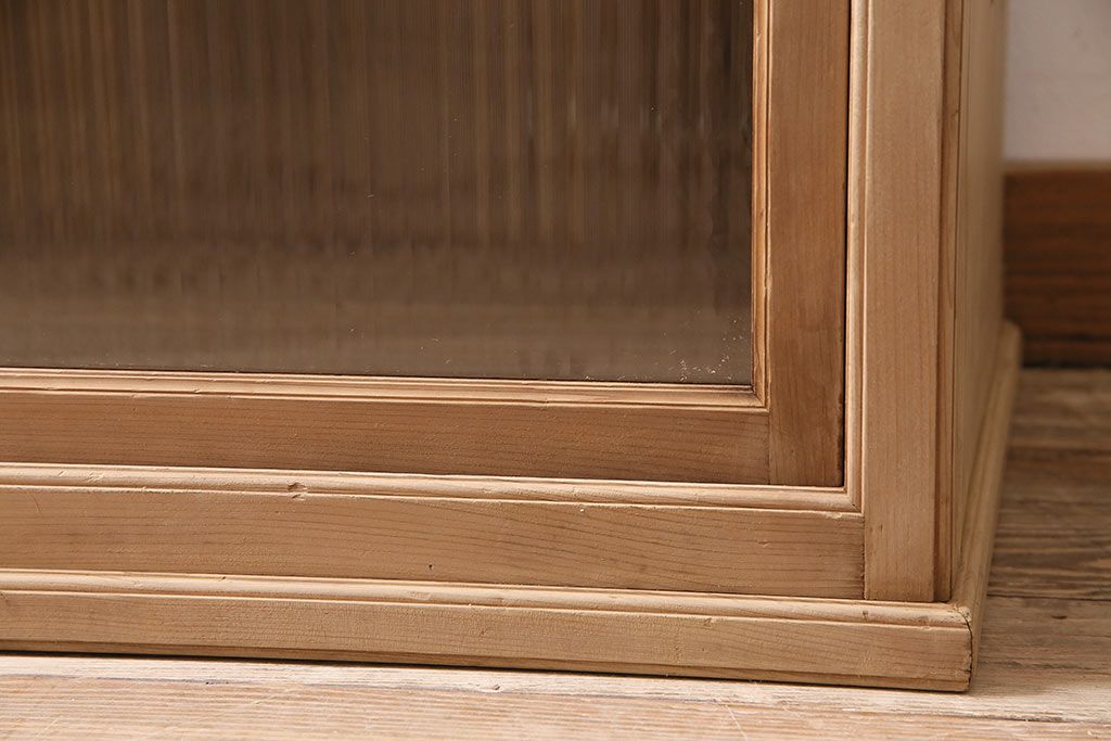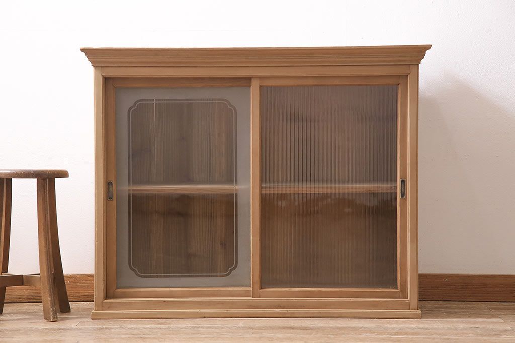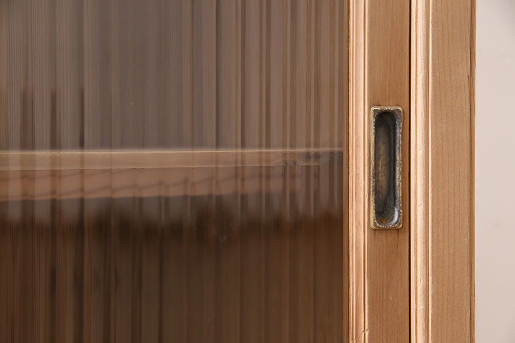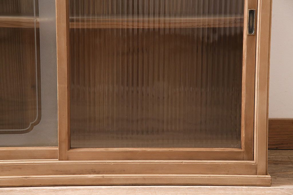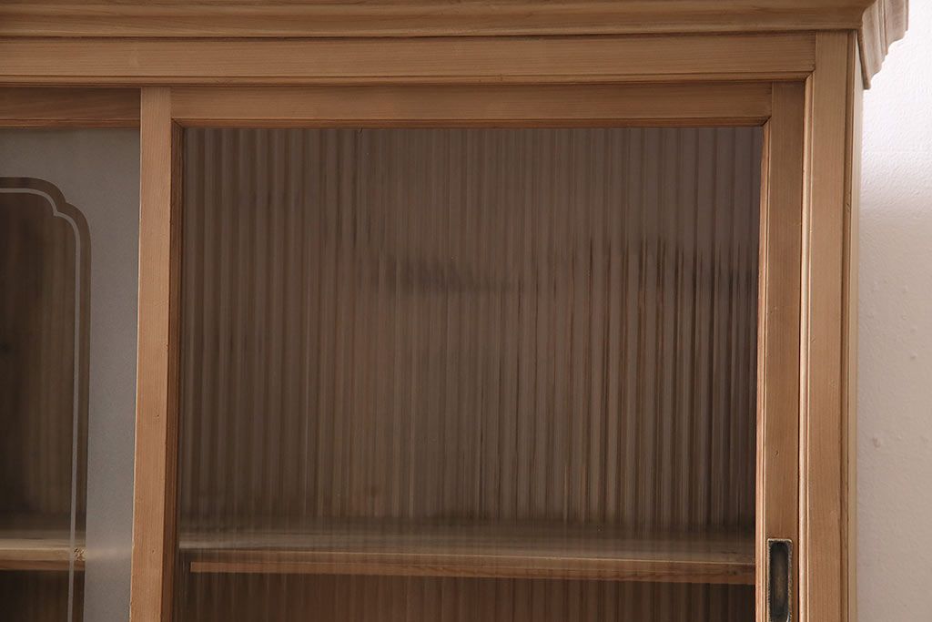 ストリップド(剥離)家具 > レトロ家具 和製アンティーク ストリップド(剥離) レトロガラスとモールガラスが目を惹く戸棚(ガラス戸棚、キャビネット、収納棚)(R-045356)