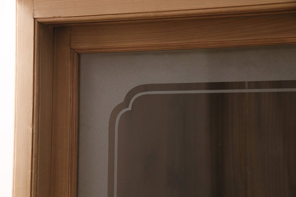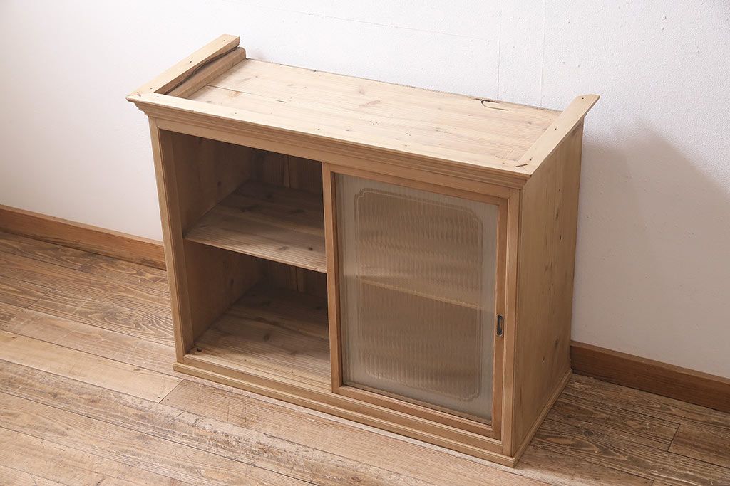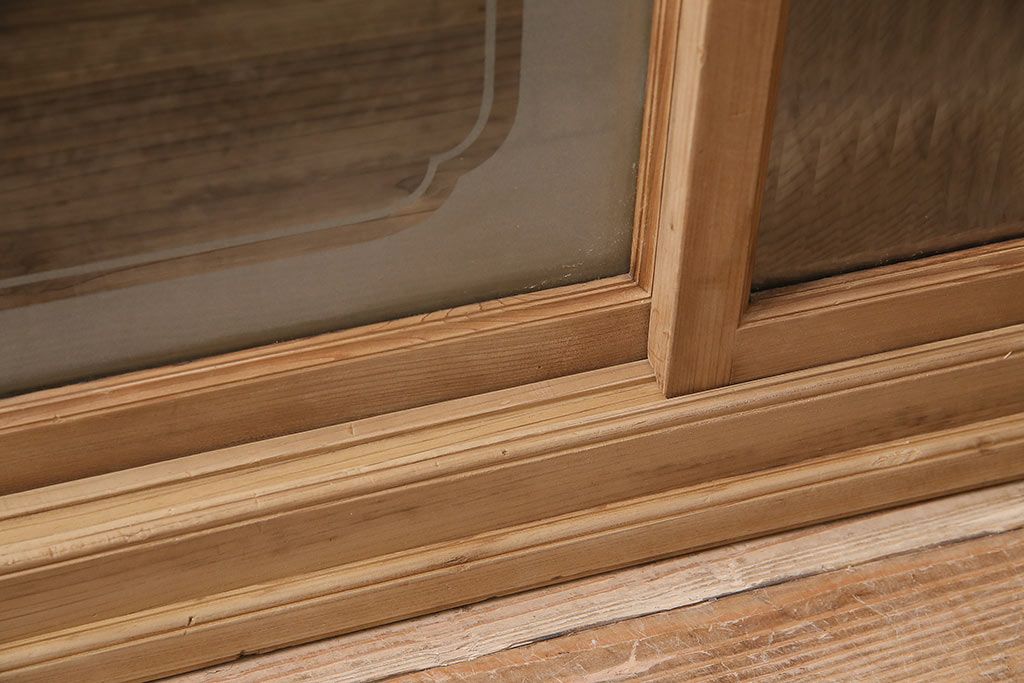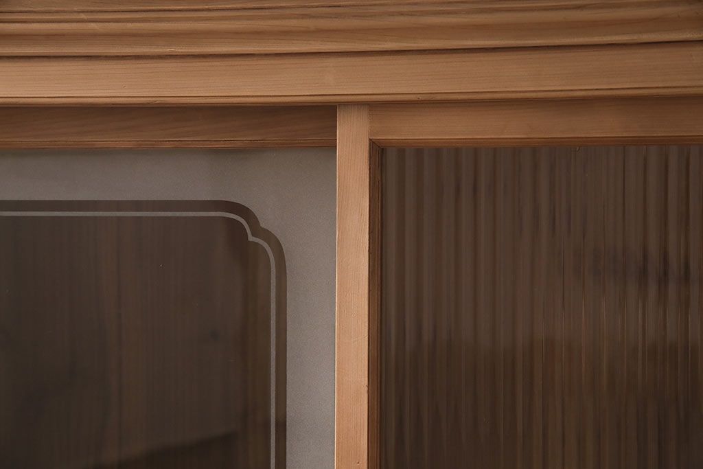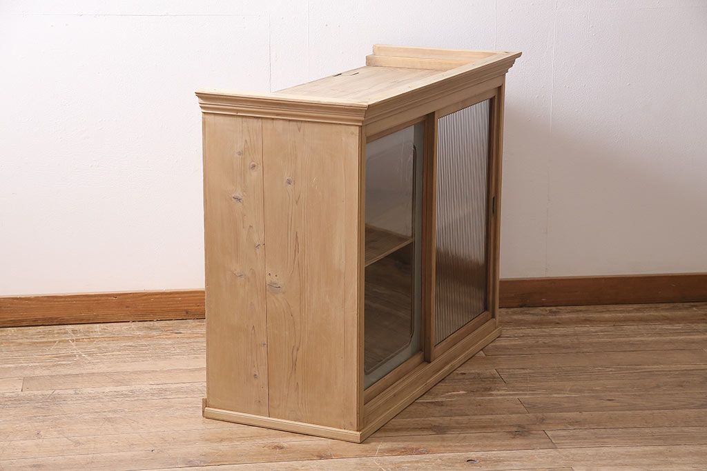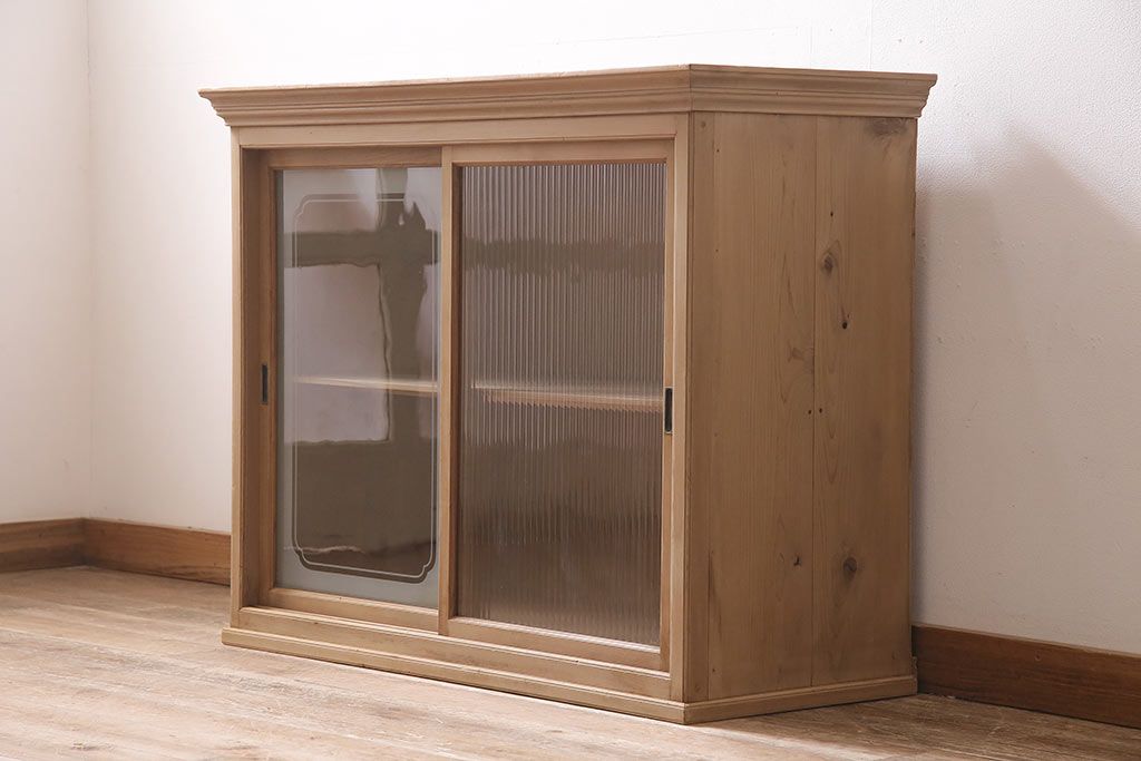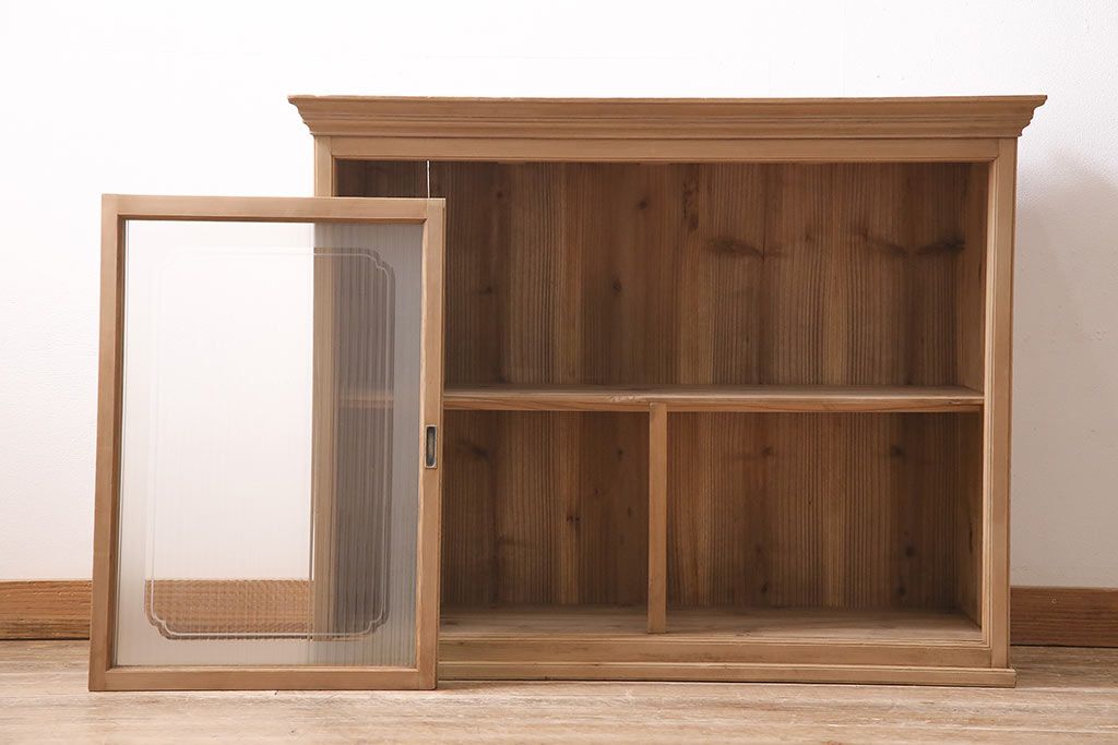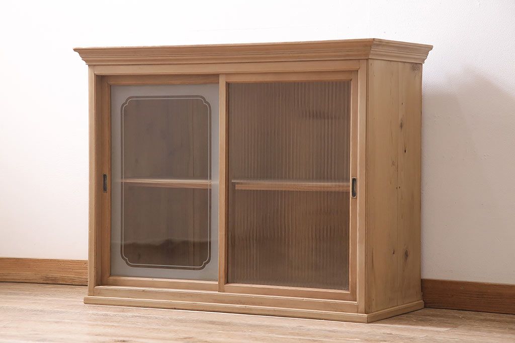 ストリップド(剥離)家具 > レトロ家具 和製アンティーク ストリップド(剥離) レトロガラスとモールガラスが目を惹く戸棚(ガラス戸棚、キャビネット、収納棚)(R-045356)