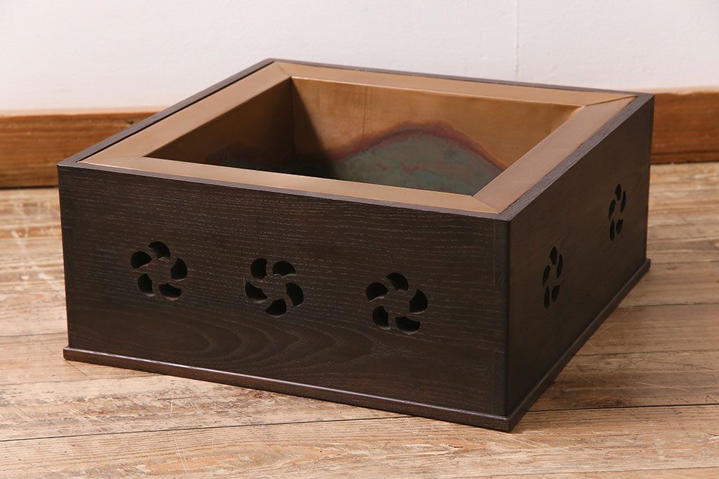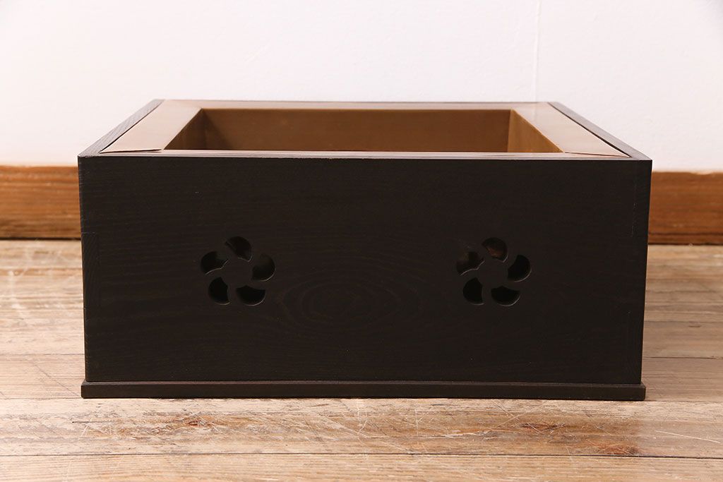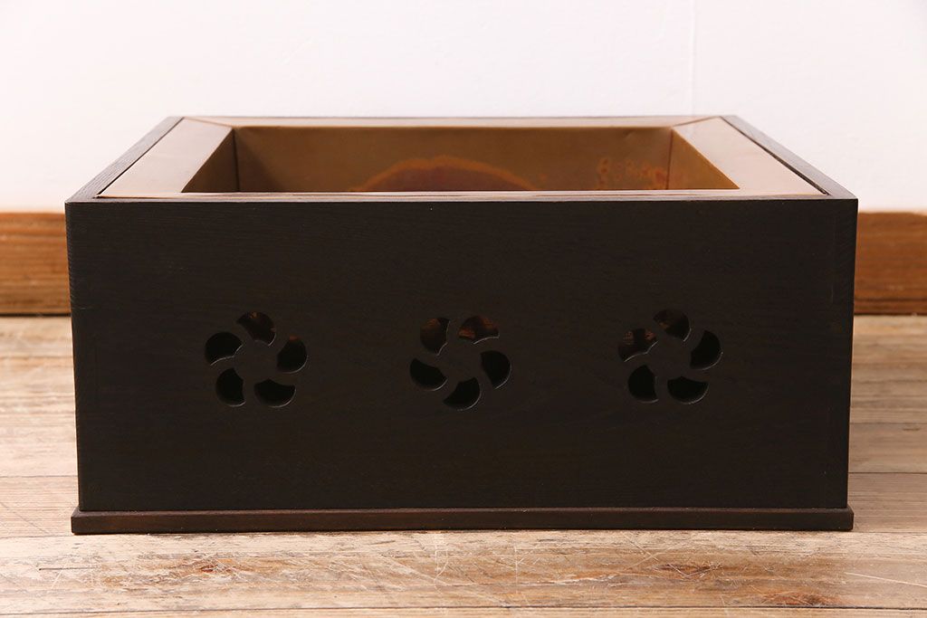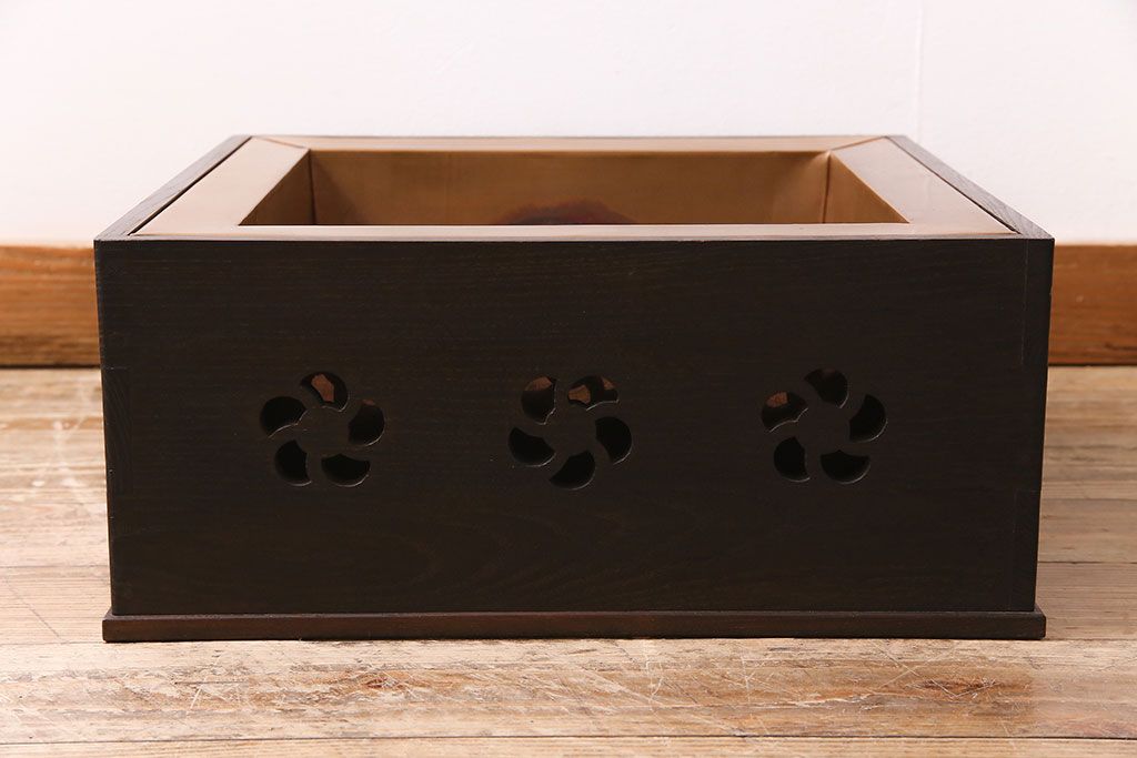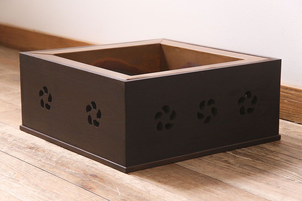 アンティーク雑貨 昭和中期 桑材 透かし彫り入りの小さな角火鉢(木製火鉢、箱火鉢)(R-045567)