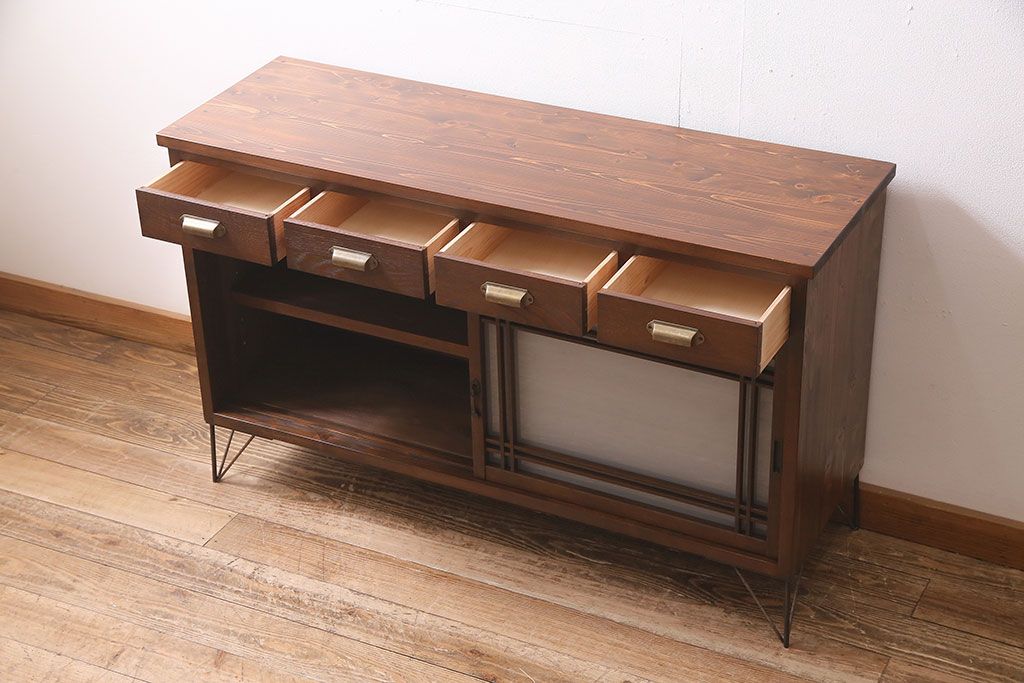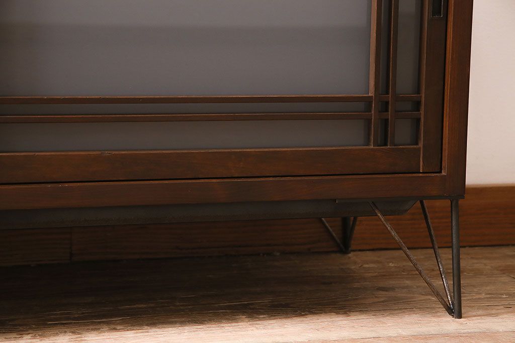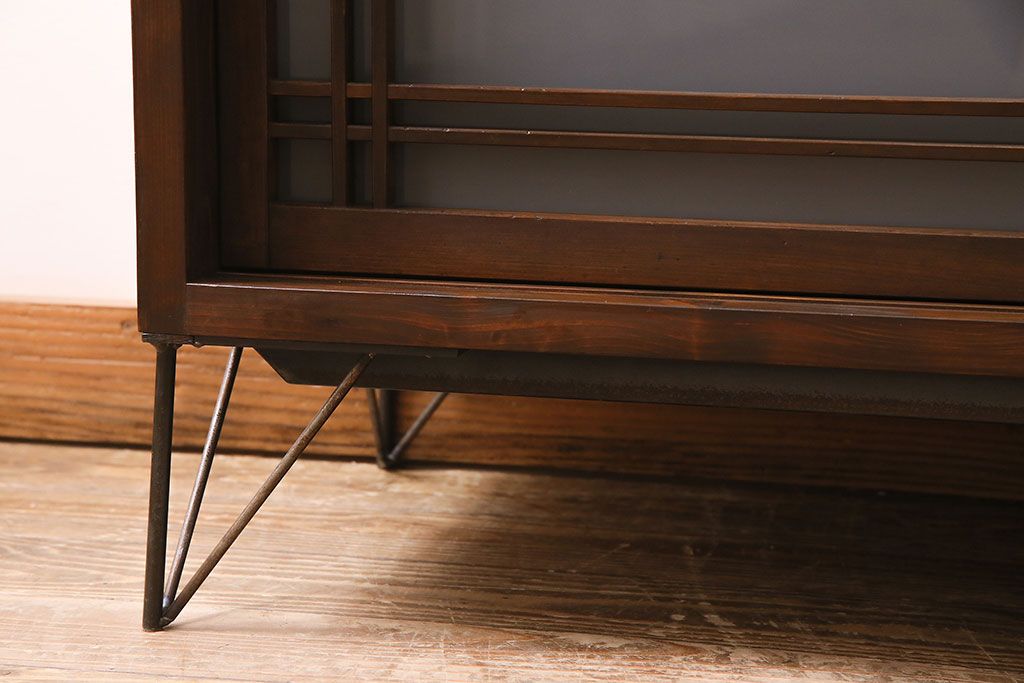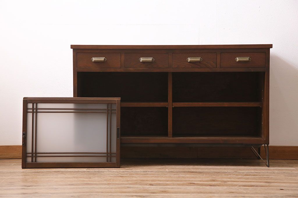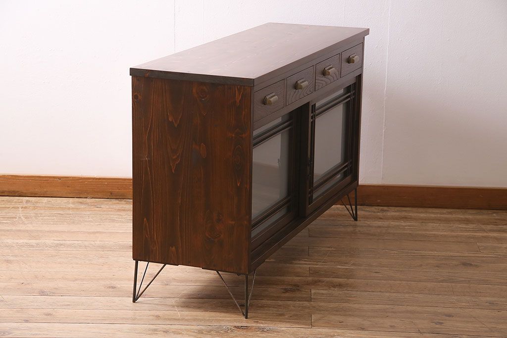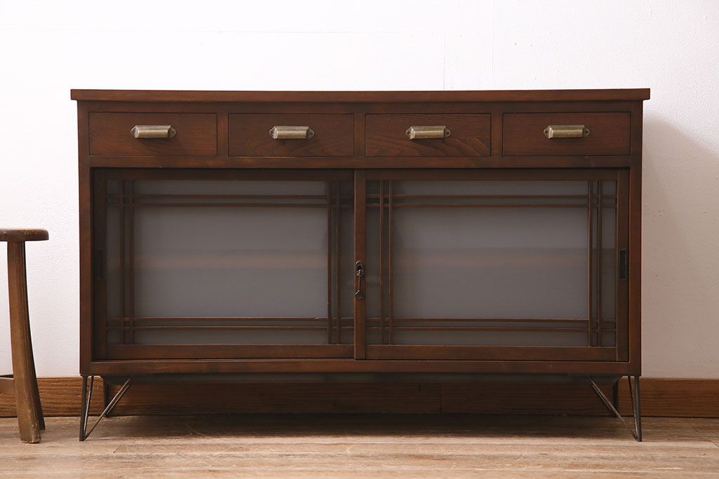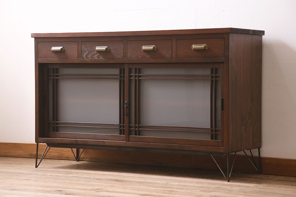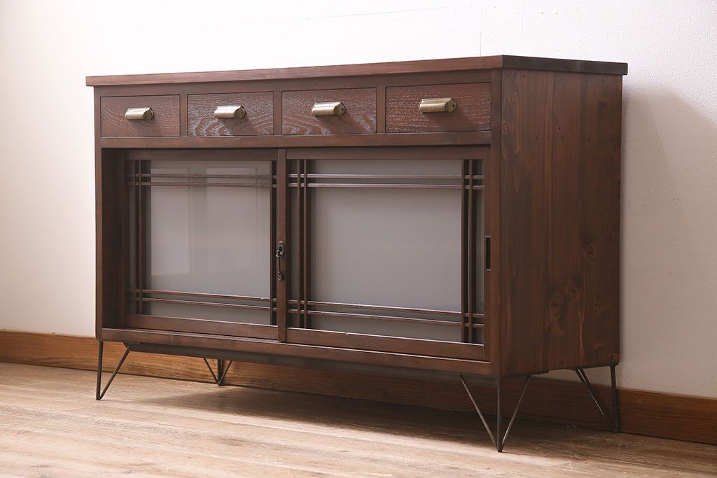 ラフジュ工房オリジナル 昭和初期 古建具リメイク すりガラス 引き出し付き レトロな雰囲気の鉄脚付リビングボード(収納棚、戸棚、テレビ台、キャビネット)(R-045581)