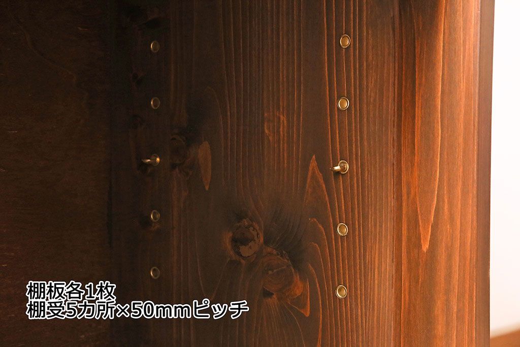 棚板は取り外しできます。棚板は各1枚あります。棚受けは5ヶ所、50mmピッチで調整できます。棚幅サイズのものが1枚の作りです。