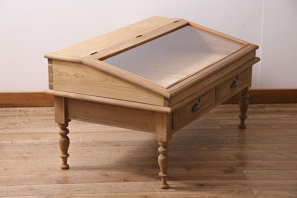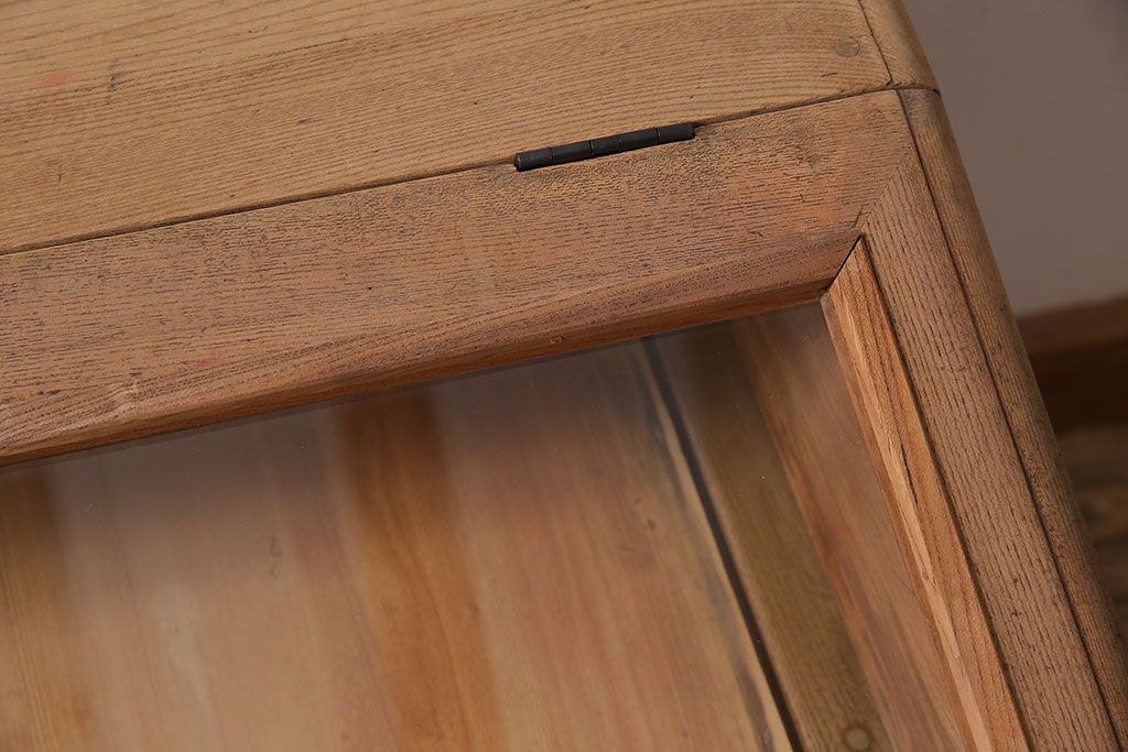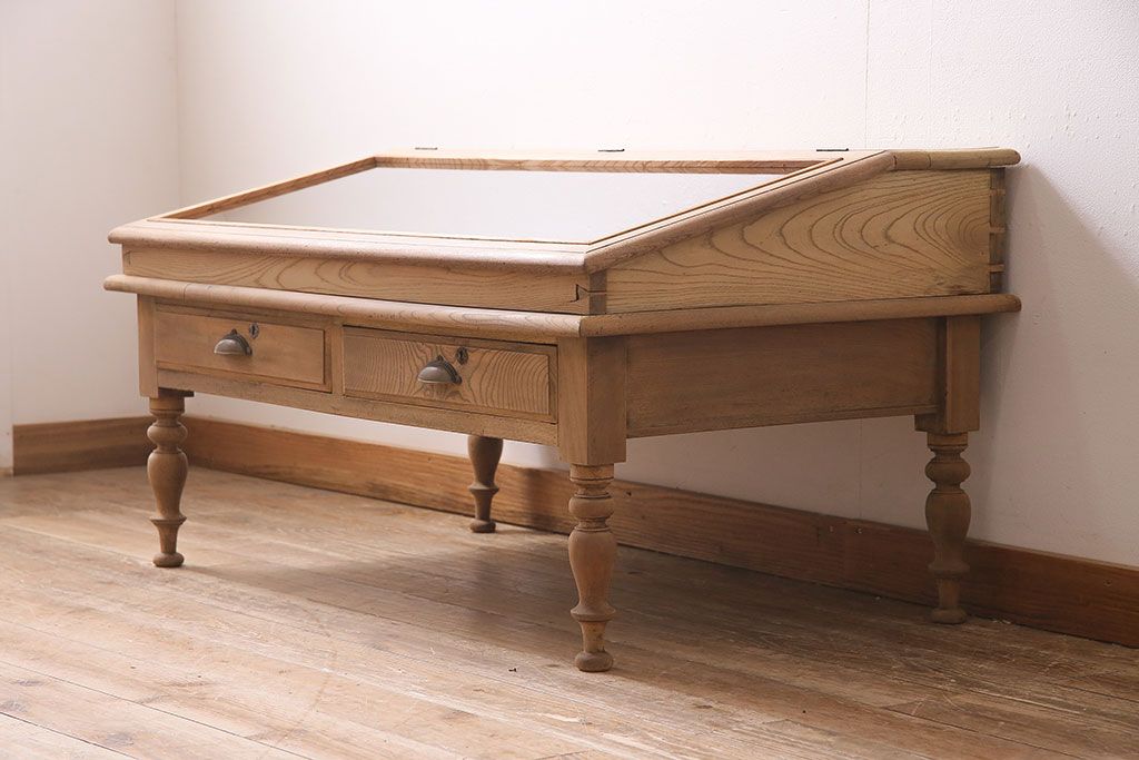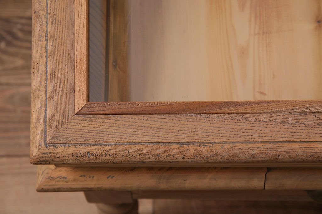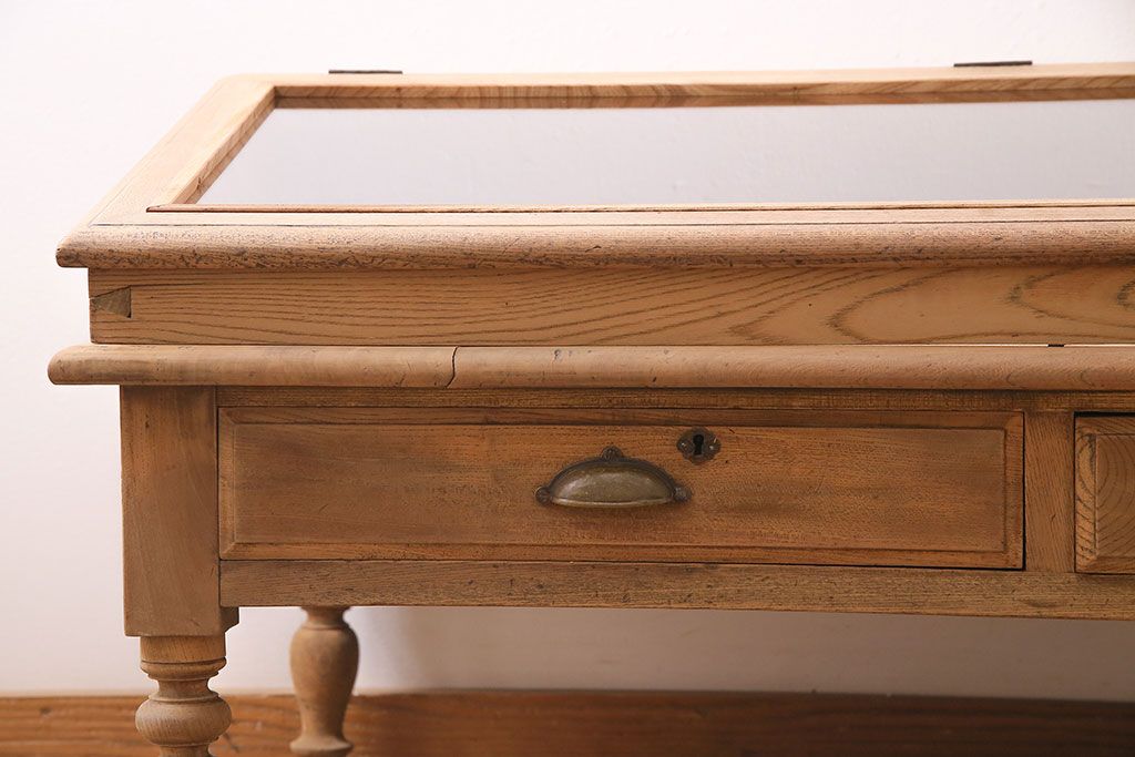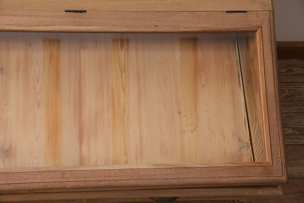 ガラスケース・ショーケース > アンティーク家具 大正昭和初期 ストリップド(剥離) 総ケヤキ材・内部ヒノキ材 文机型のショーケース(コレクションケース、ライティングデスク、在宅ワーク、在宅用簿記机)(R-045639)