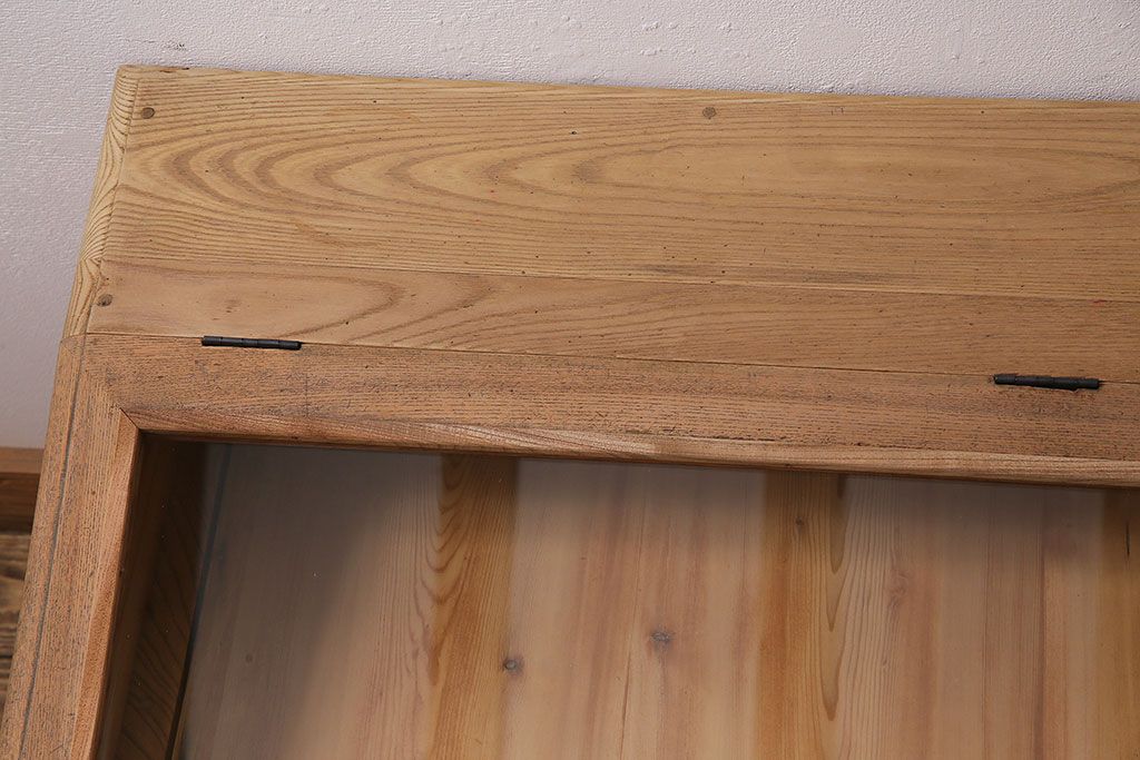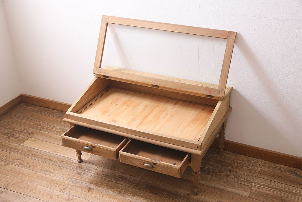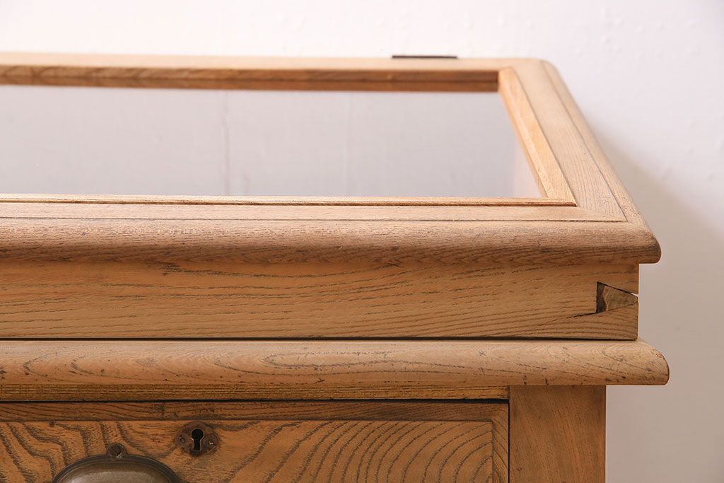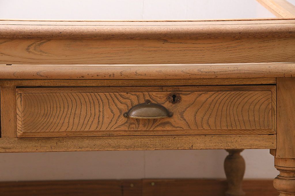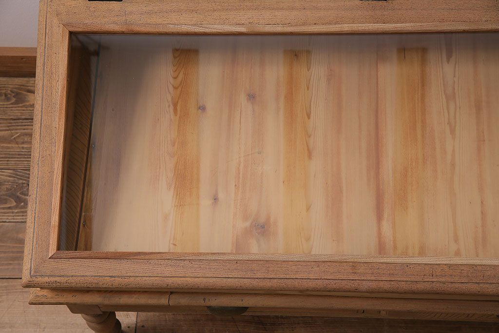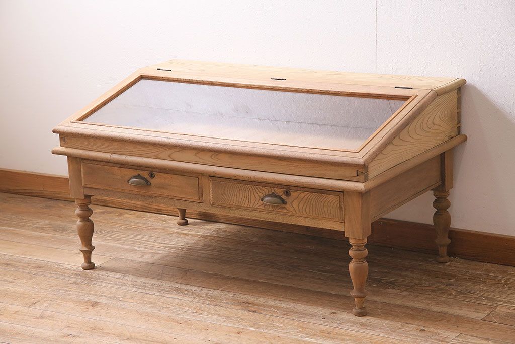 ガラスケース・ショーケース > アンティーク家具 大正昭和初期 ストリップド(剥離) 総ケヤキ材・内部ヒノキ材 文机型のショーケース(コレクションケース、ライティングデスク、在宅ワーク、在宅用簿記机)(R-045639)