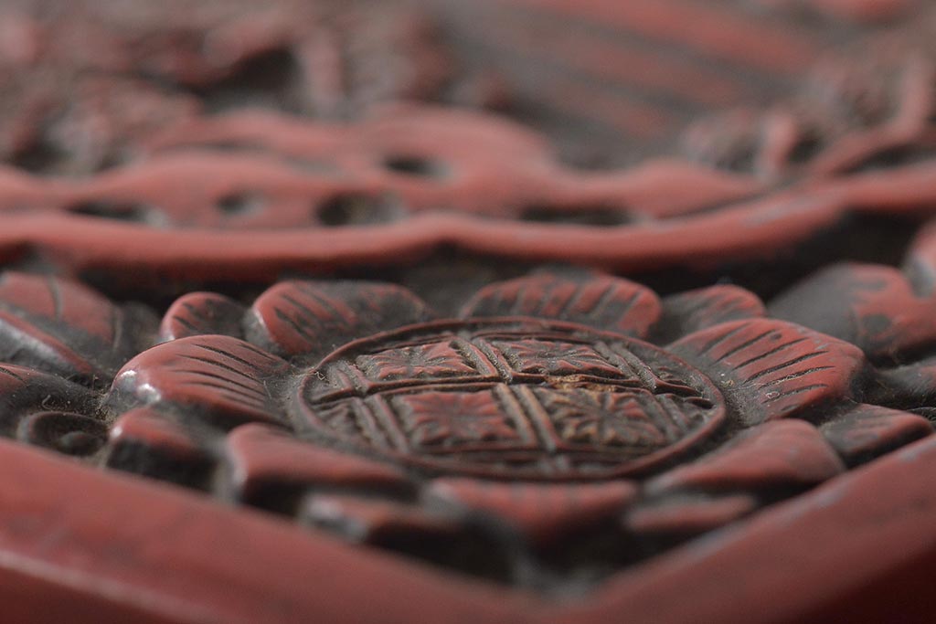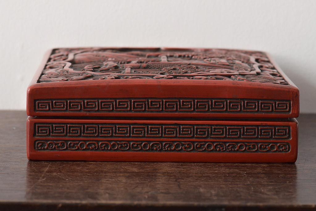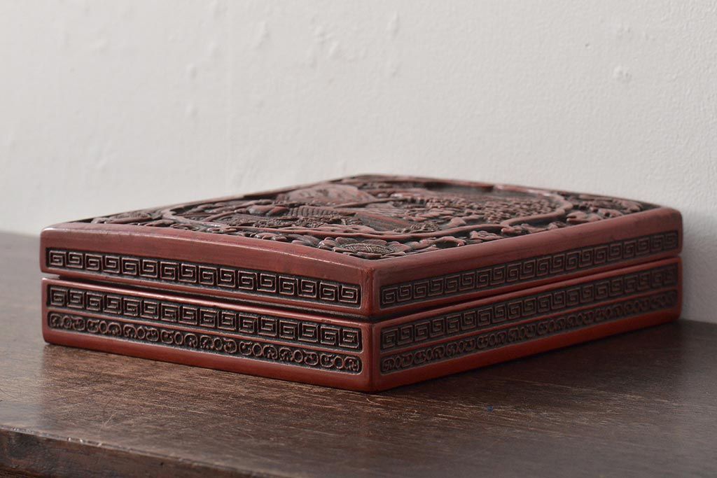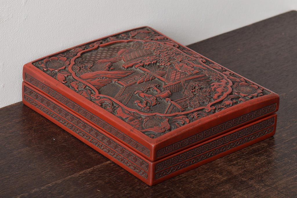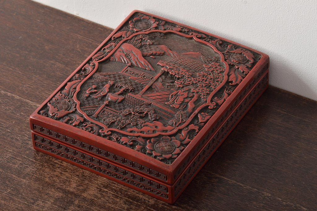 ラフジュ工房> 小物収納・トランク > 明治〜大正 古い硯箱(堆朱?、木製、彫刻、楼閣、山水)(R-045484)