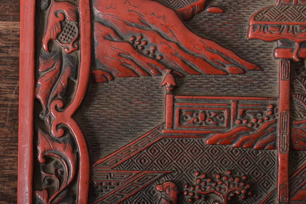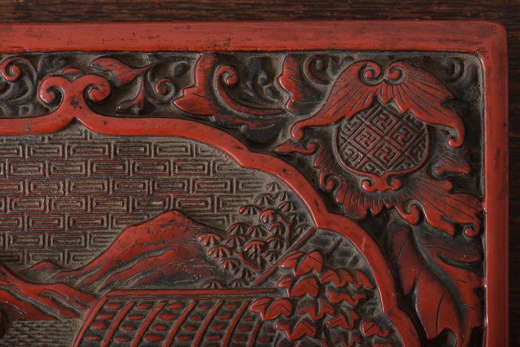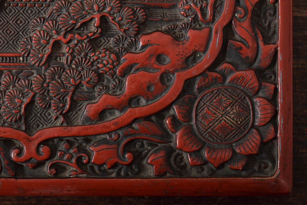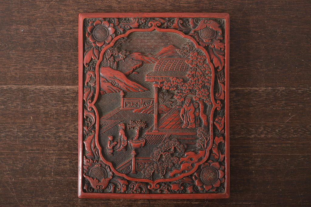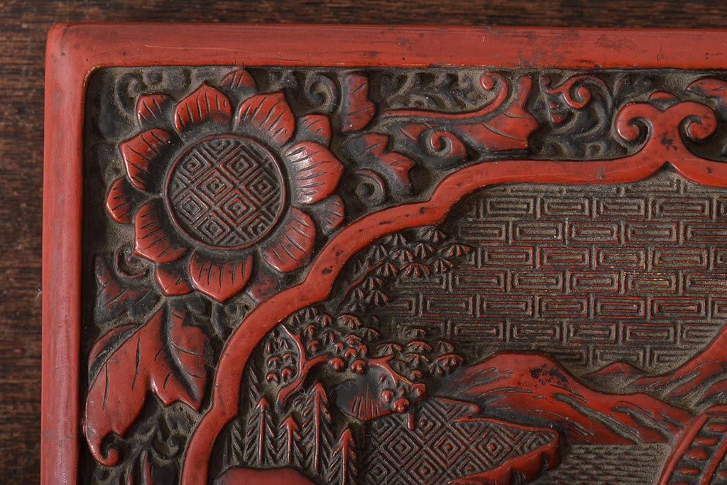 明治〜大正 古い硯箱(堆朱?、木製、彫刻、楼閣、山水)(R-045484)