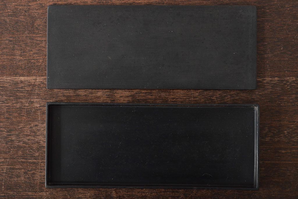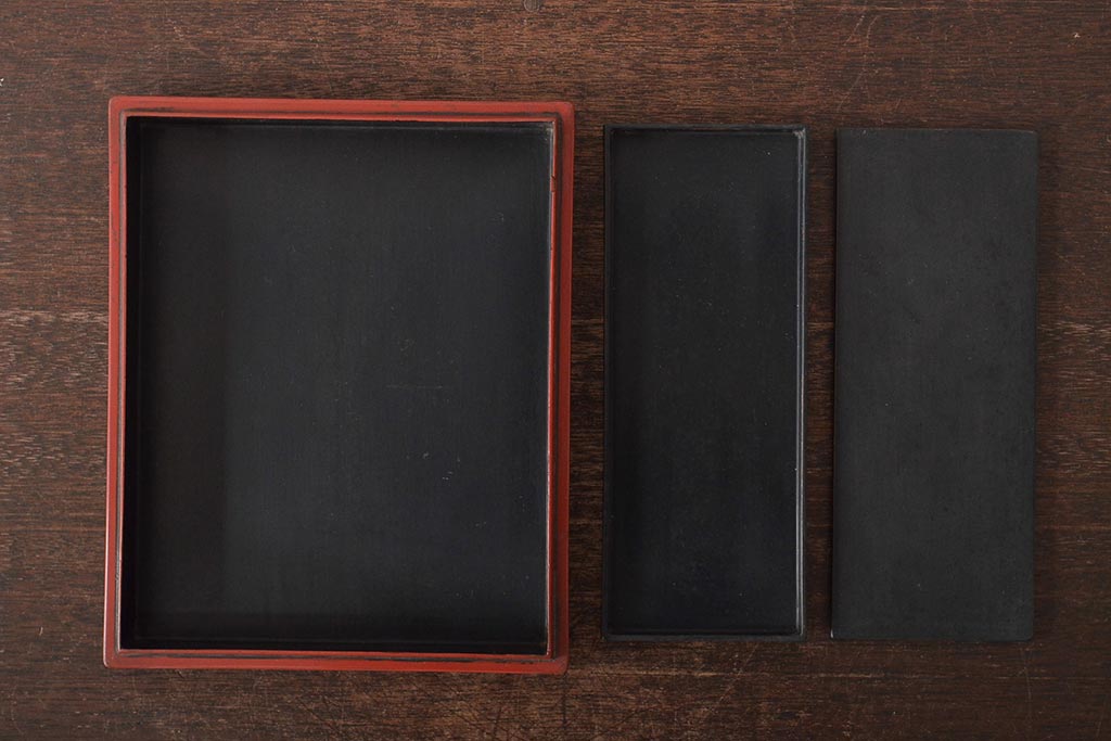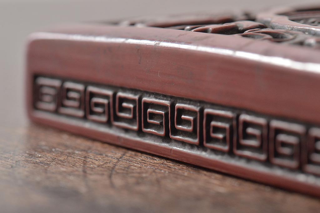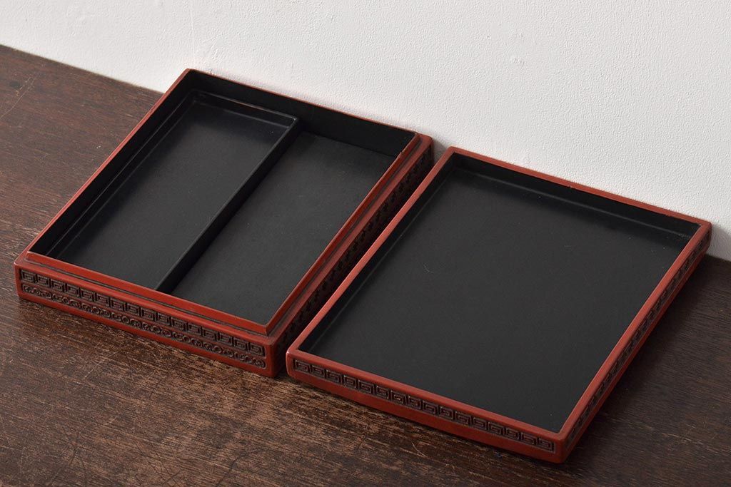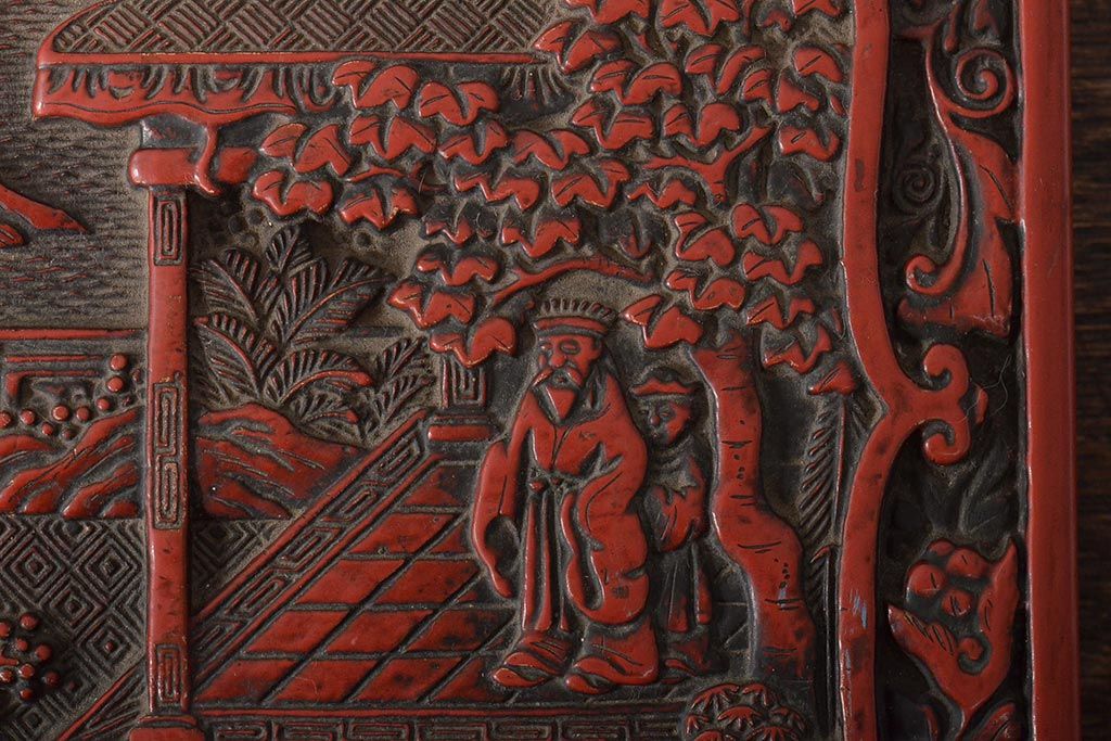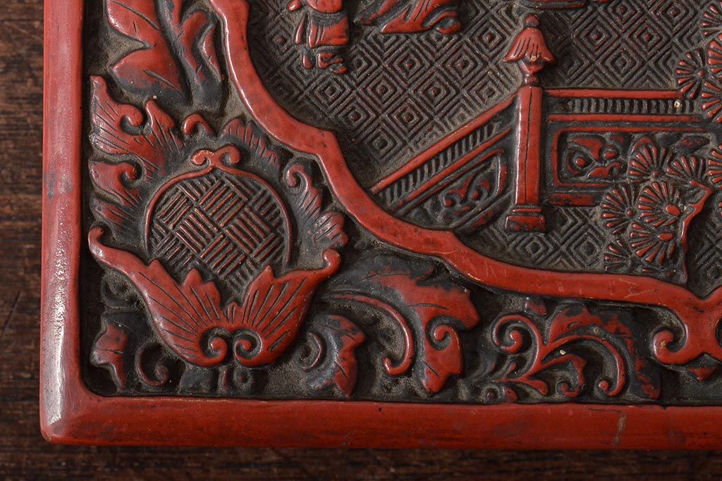 明治〜大正 古い硯箱(堆朱?、木製、彫刻、楼閣、山水)(R-045484)