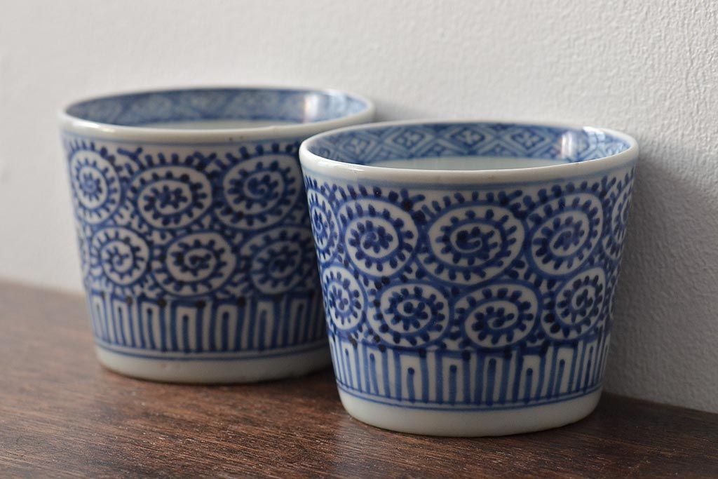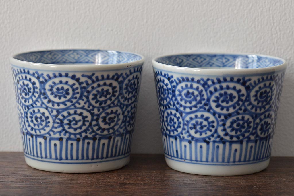 江戸〜明治期 古伊万里 蛸唐草文染付 蕎麦猪口2客(和食器)(R-045522)