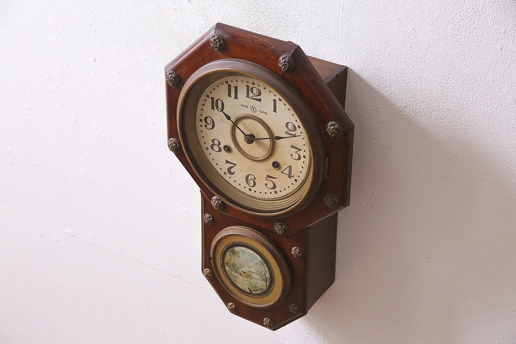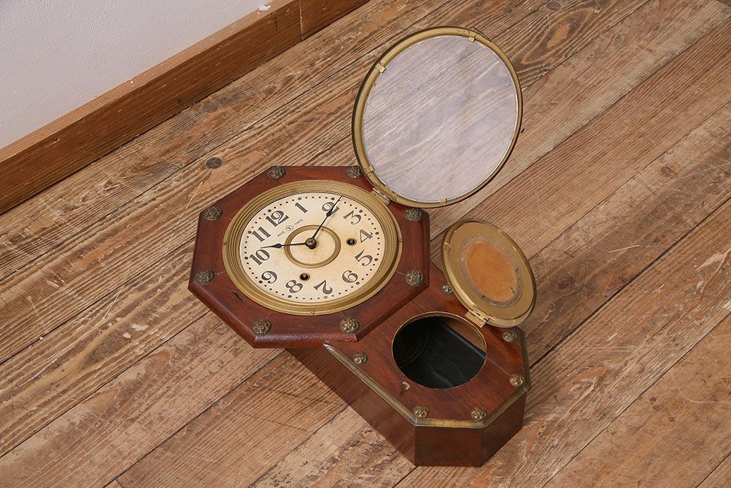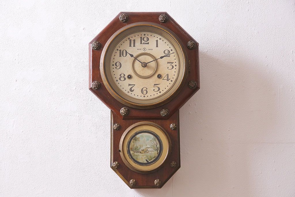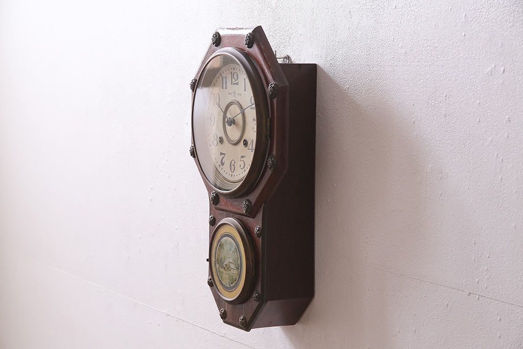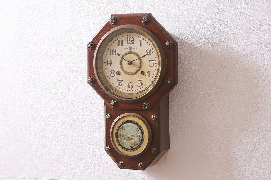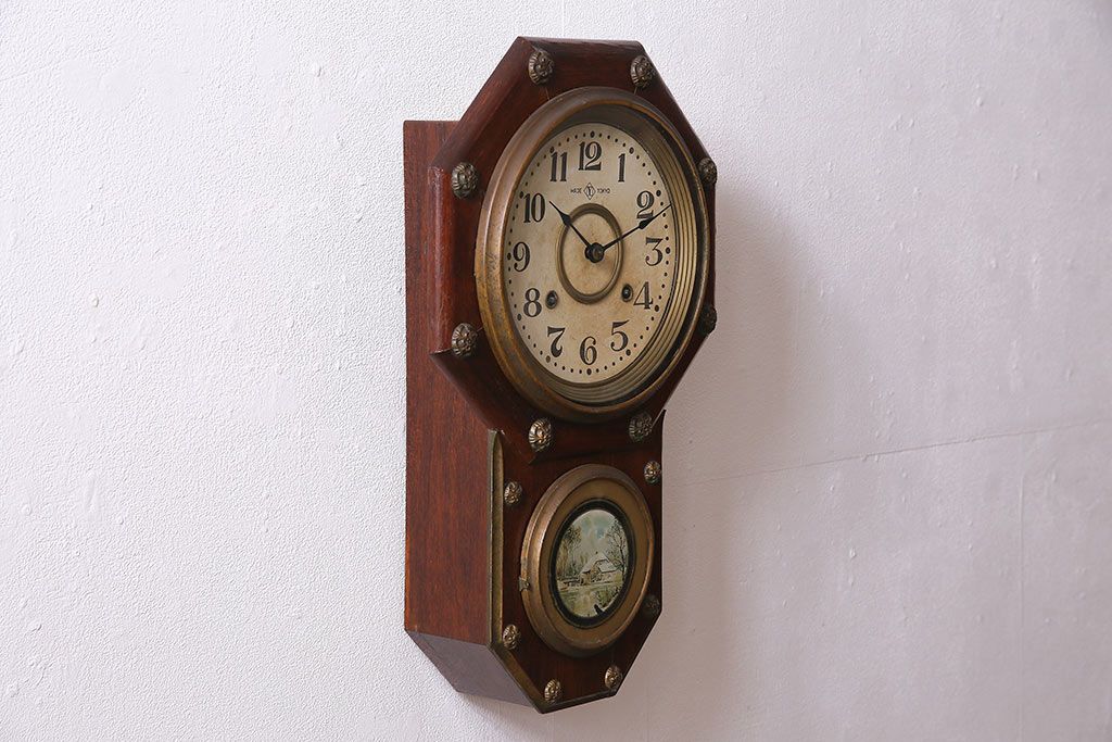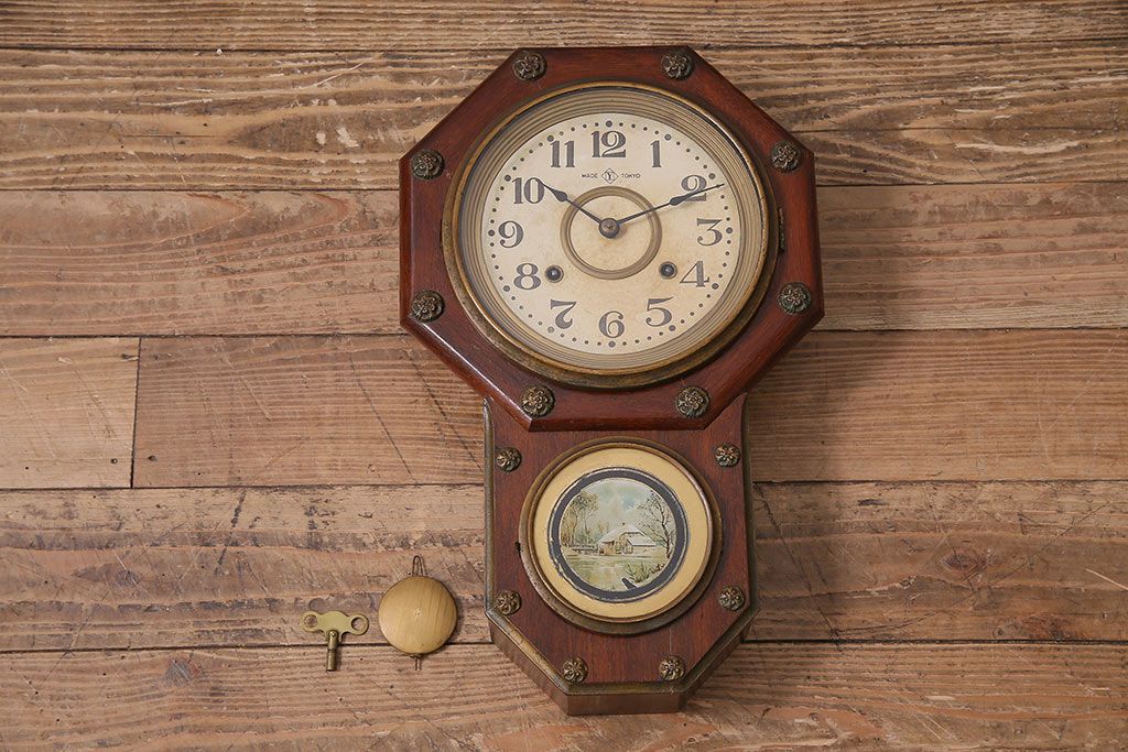 アンティーク時計 大正昭和初期 精工舎(SEIKOSHA、セイコー) ゼンマイ式 珍しいガラス絵の八角柱時計(掛け時計)(R-045349)