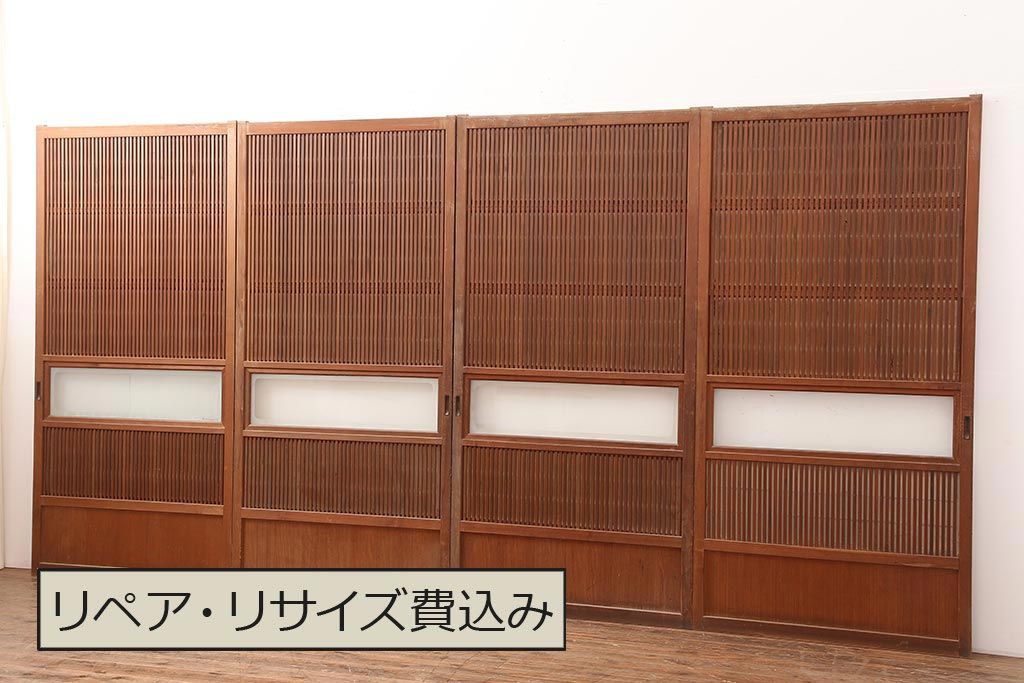 ドア・建具> 4枚〜セット > アンティーク建具 昭和中期 裏障子付き 赤みがかった色合いの帯格子戸4枚セット(障子戸、引き戸、建具)(R-045691)