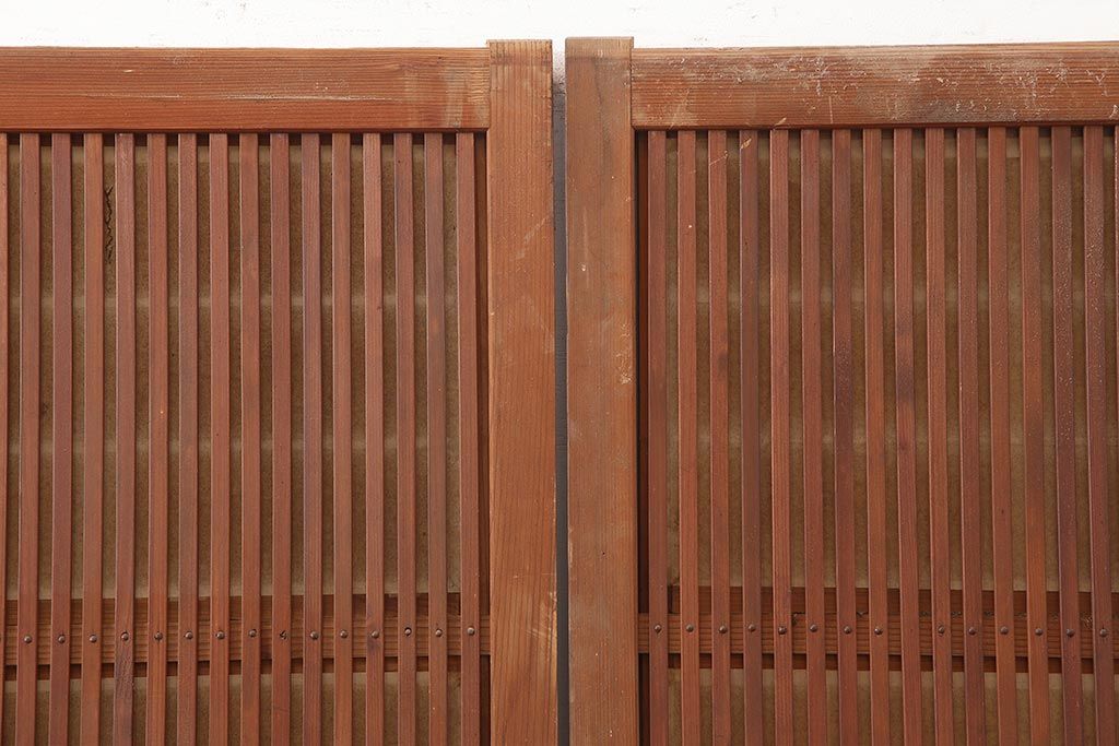 ドア・建具> 板戸・帯戸 > アンティーク建具 昭和中期 裏障子付き 赤みがかった色合いの帯格子戸4枚セット(障子戸、引き戸、建具)(R-045691)