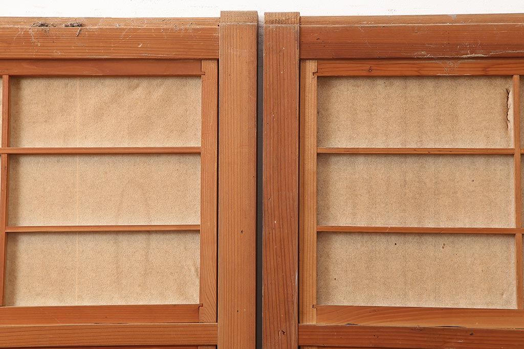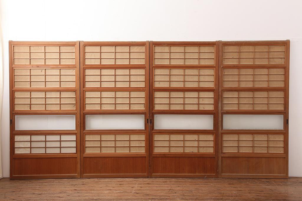 アンティーク建具 昭和中期 裏障子付き 赤みがかった色合いの帯格子戸4枚セット(障子戸、引き戸、建具)(R-045691)