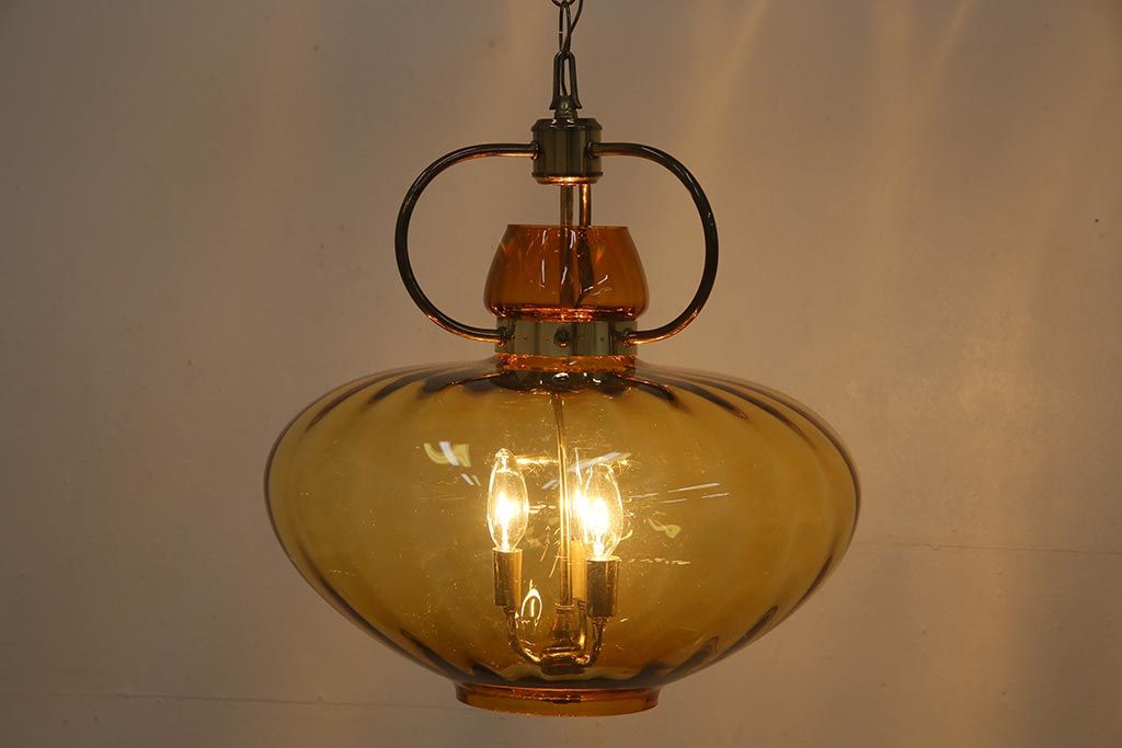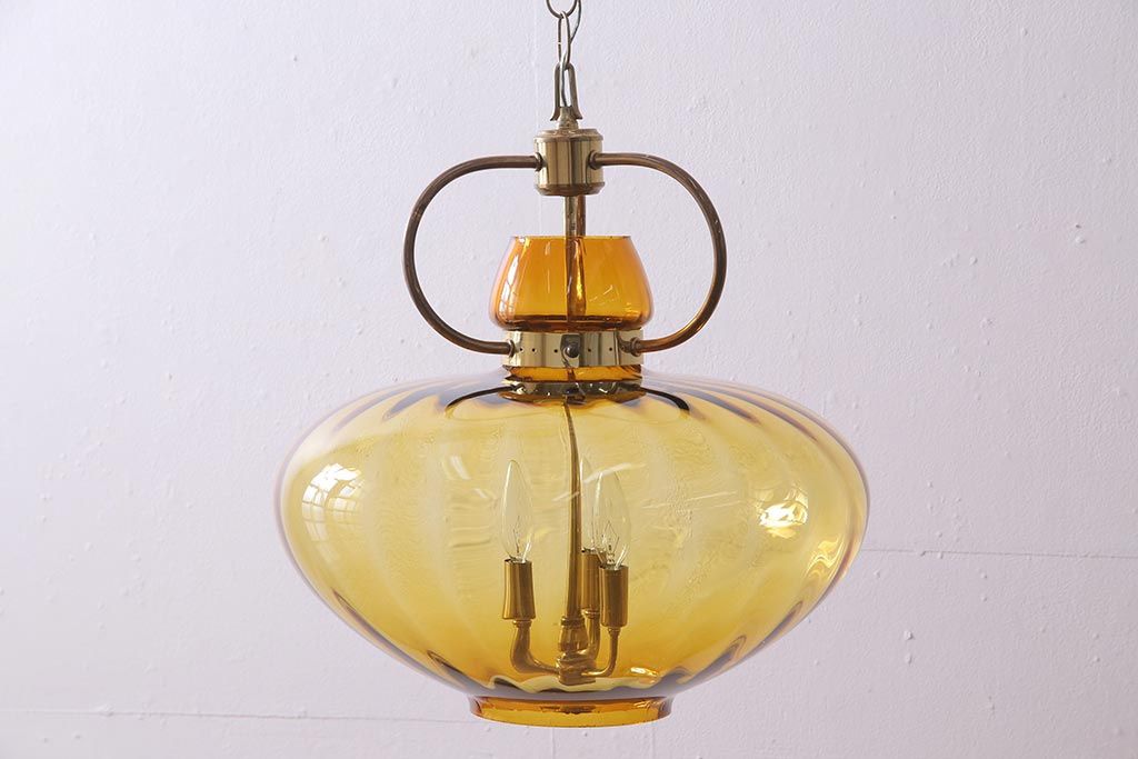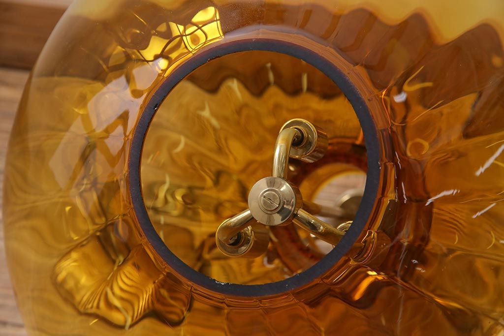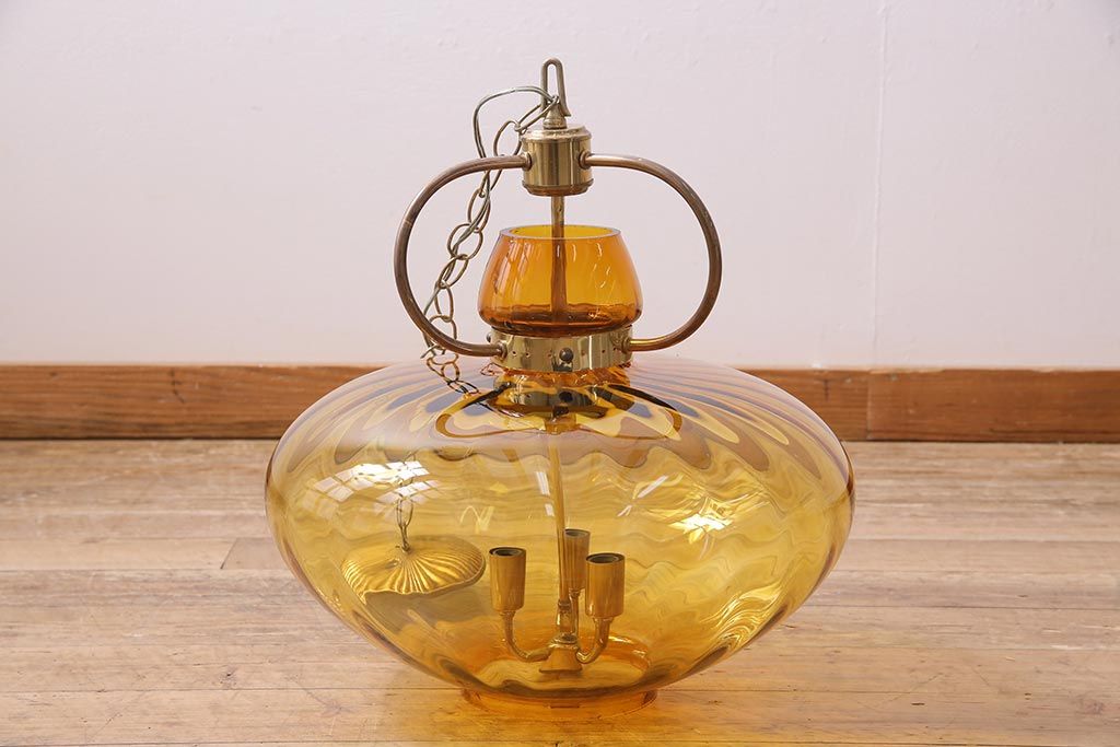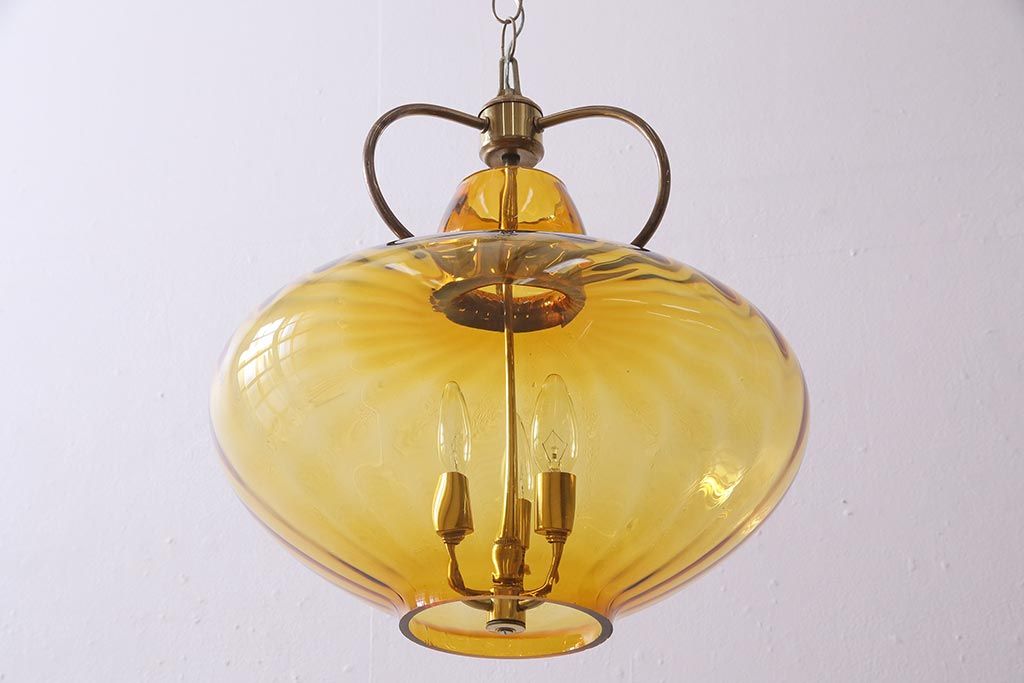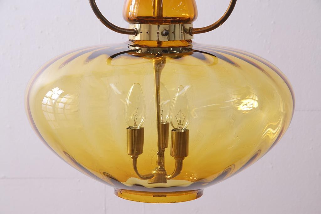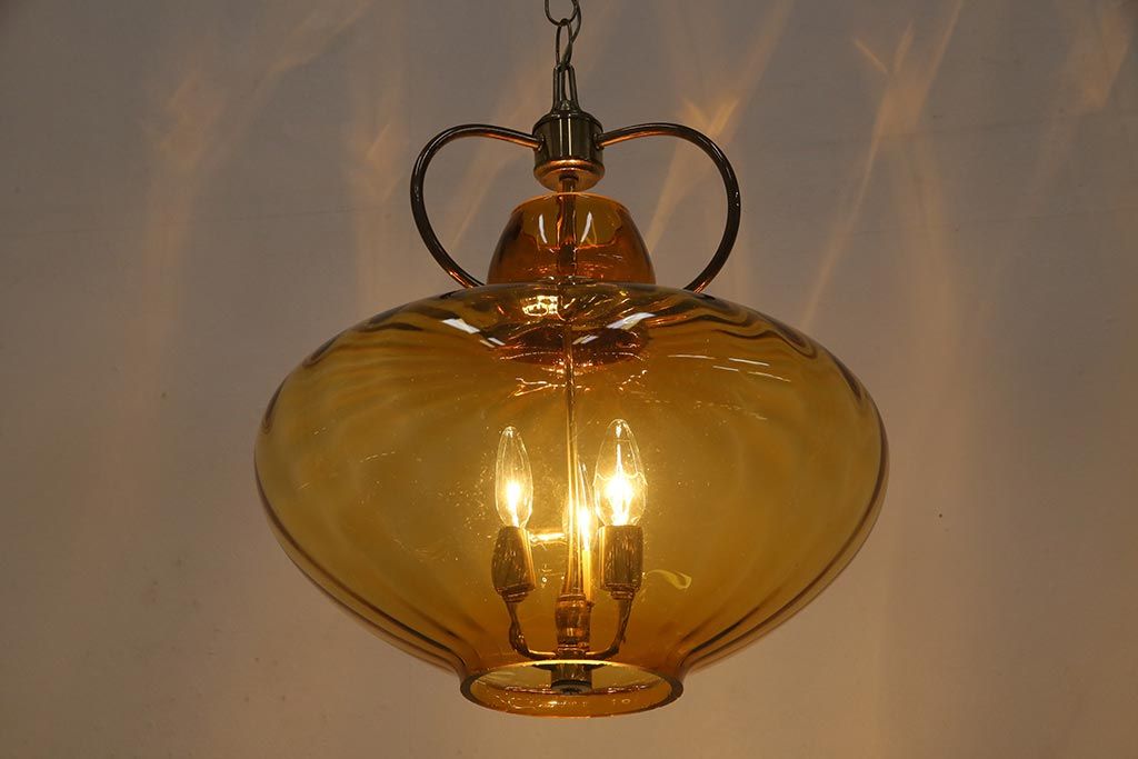 アンティーク照明 アメリカビンテージ アンバーガラス 3灯 玉ねぎ型のレトロなライト(天井照明、吊り下げ照明、ペンダントライト、ガラスシェード)(R-045144)