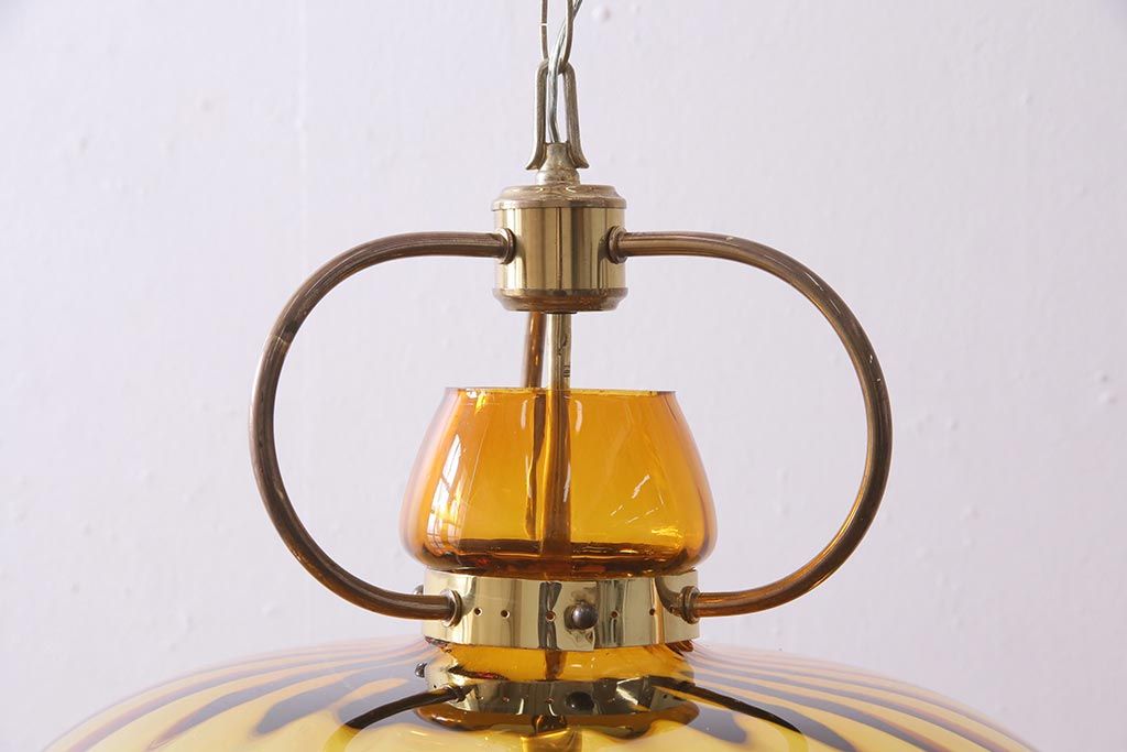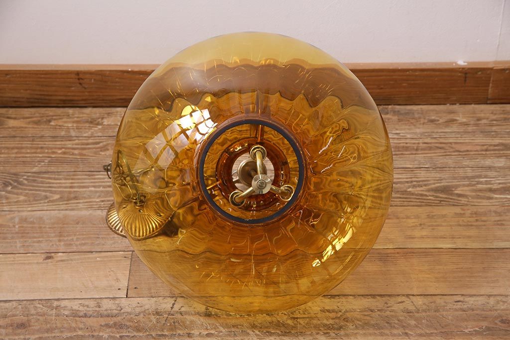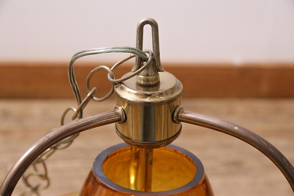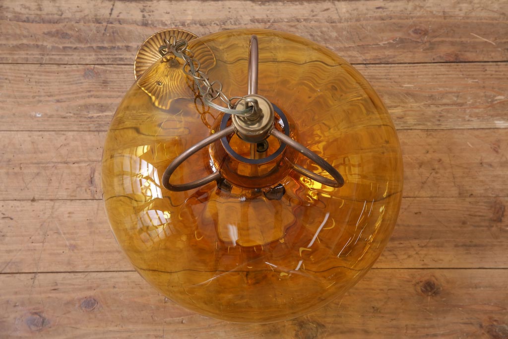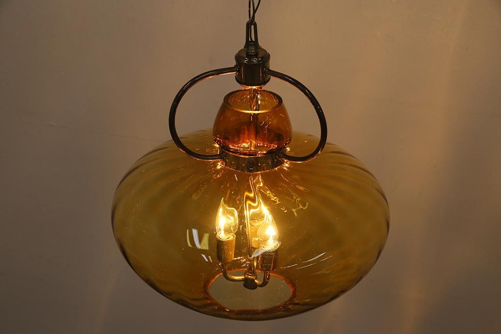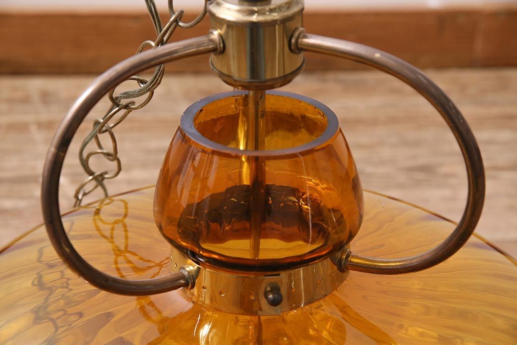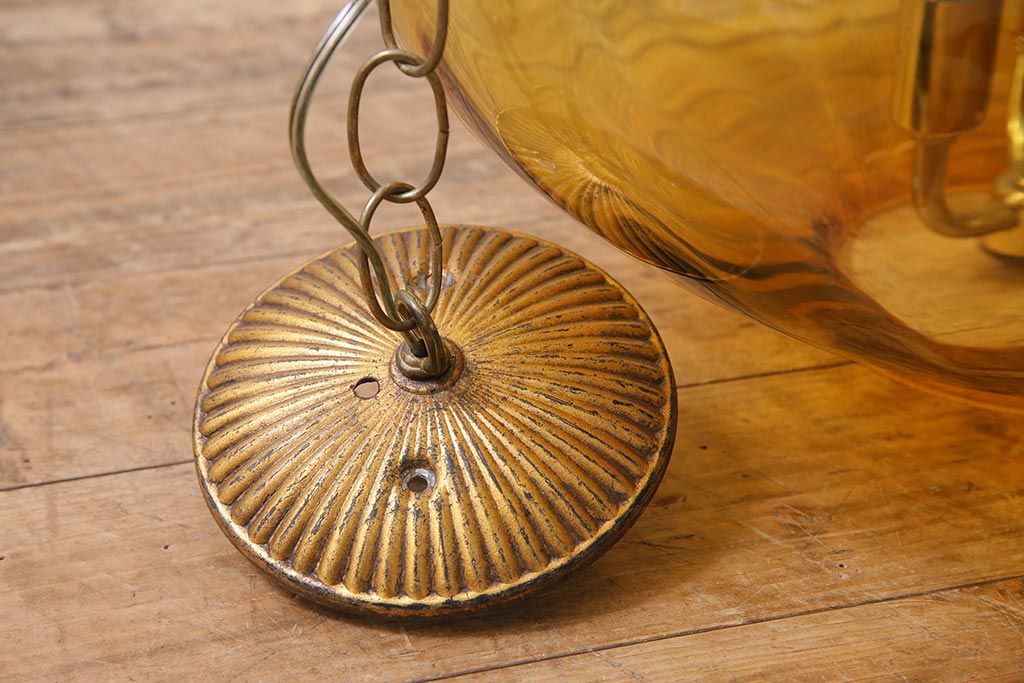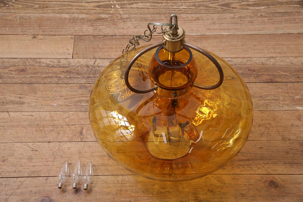 アンティーク照明 アメリカビンテージ アンバーガラス 3灯 玉ねぎ型のレトロなライト(天井照明、吊り下げ照明、ペンダントライト、ガラスシェード)(R-045144)