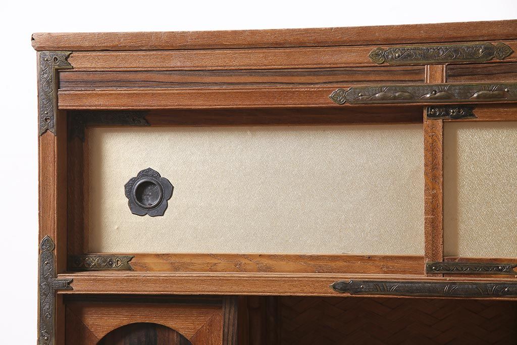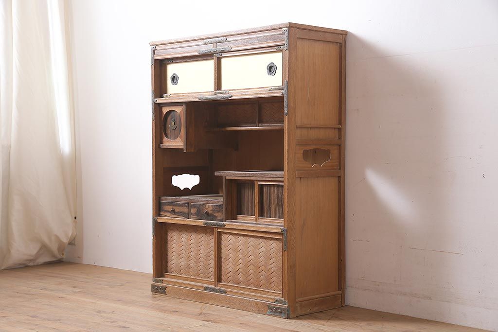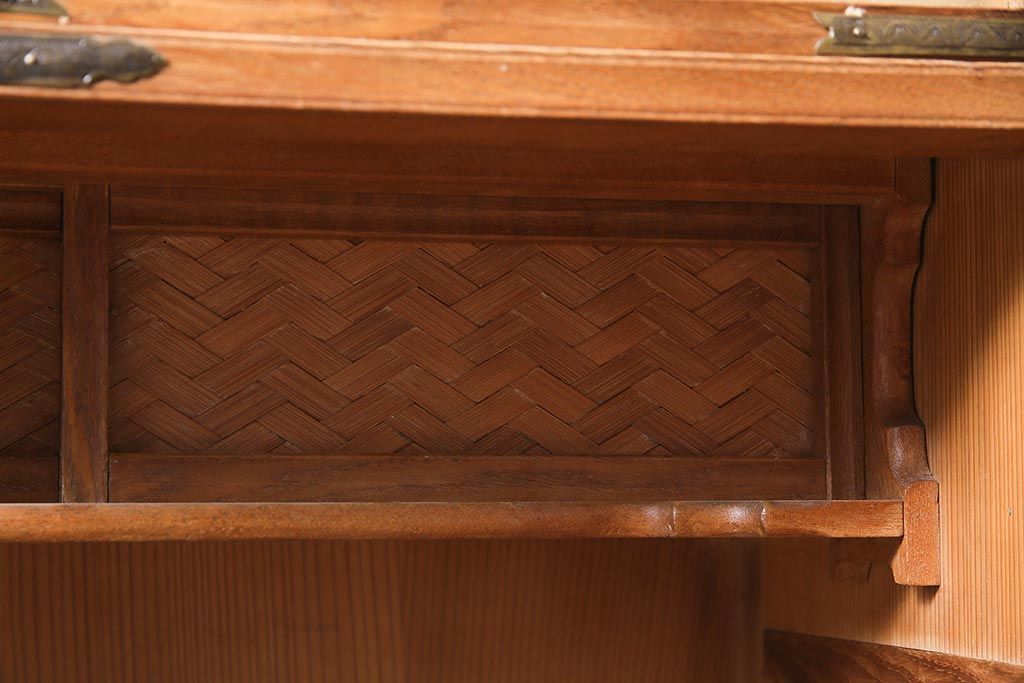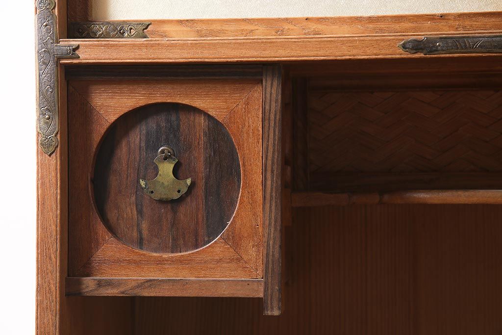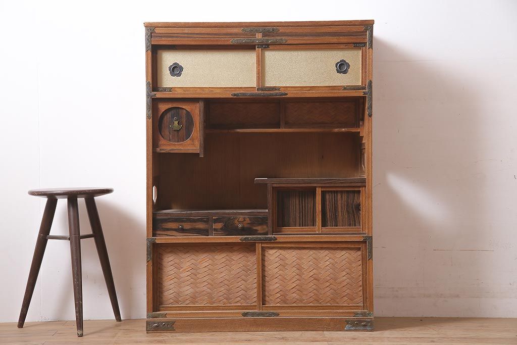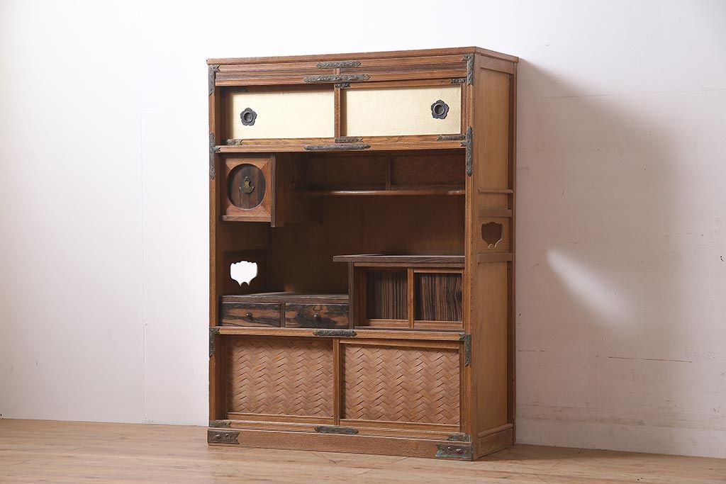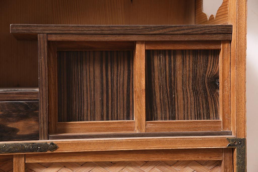 アンティーク家具 昭和中期 桑材・黒檀 網代編み 上品な和を感じさせる凝った造りの茶箪笥(飾り棚、茶棚)(R-045708)です。