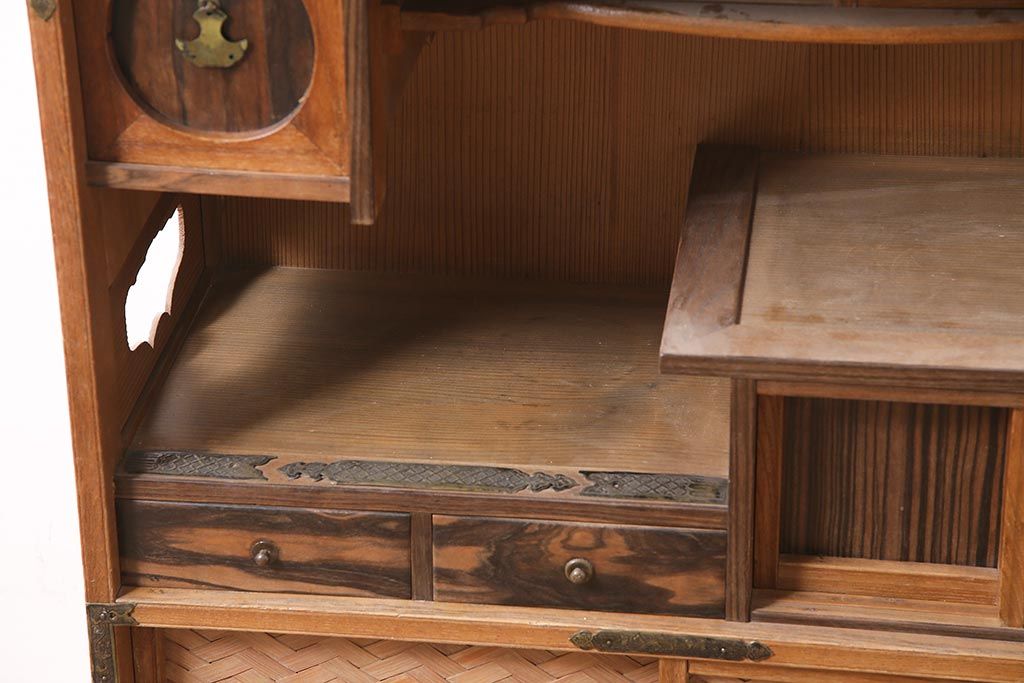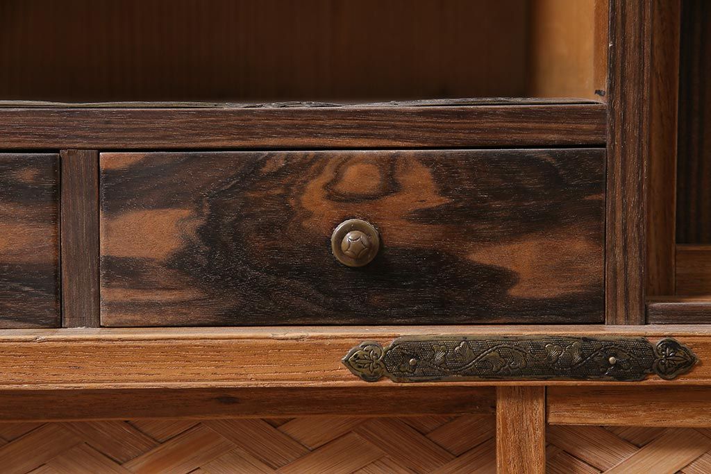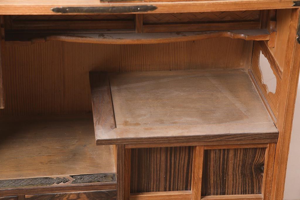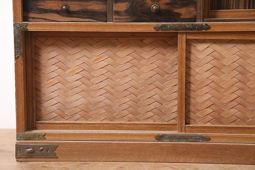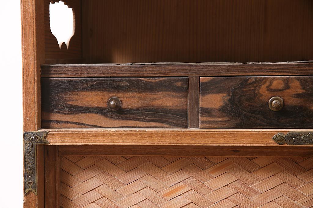 アンティーク家具 昭和中期 桑材・黒檀 網代編み 上品な和を感じさせる凝った造りの茶箪笥(飾り棚、茶棚)(R-045708)