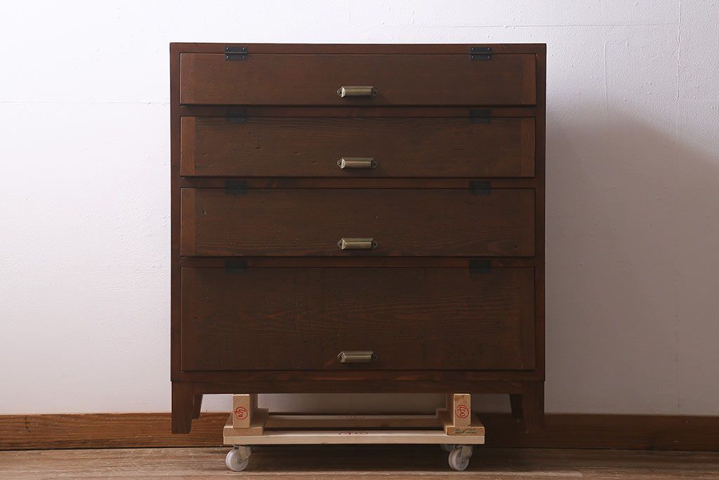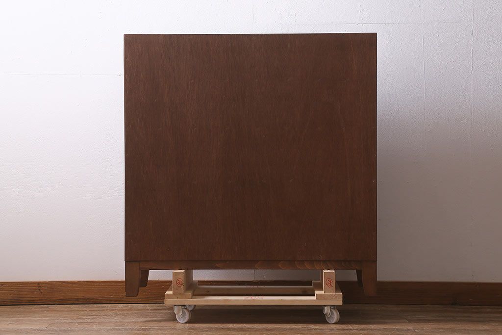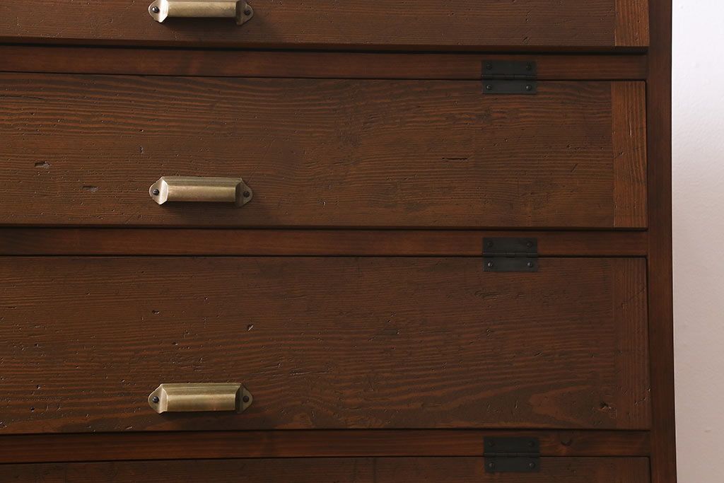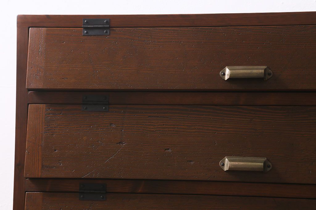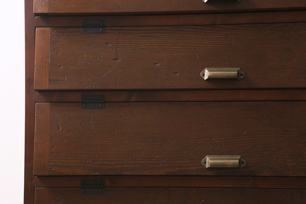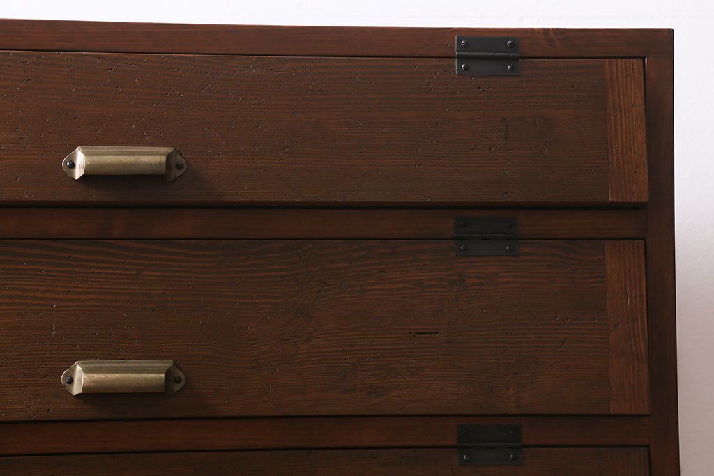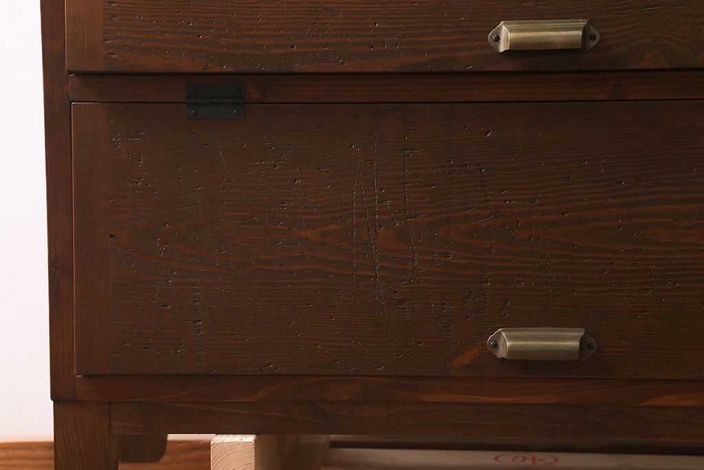 フルオーダー家具実績 > パタパタ扉の下駄箱を新規製作!本体はヒノキ無垢材、前板は古材を使用。木製脚と取っ手を取り付け。濃い茶色で着色し仕上げ。(戸棚、キャビネット、ロッカー)