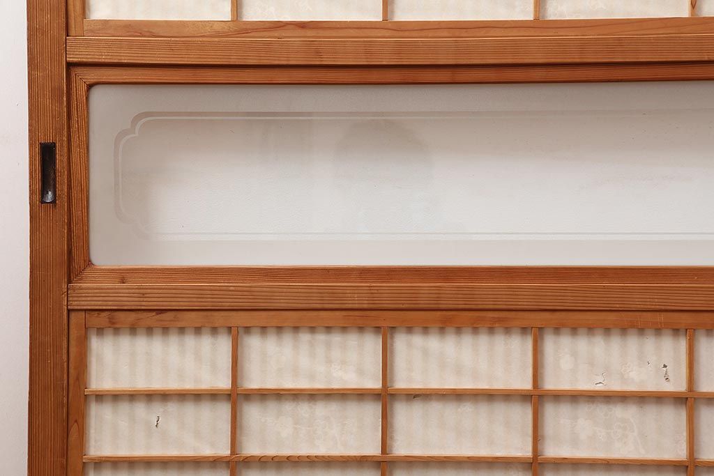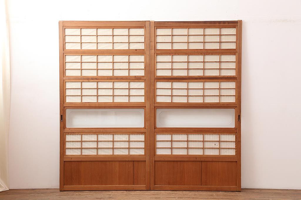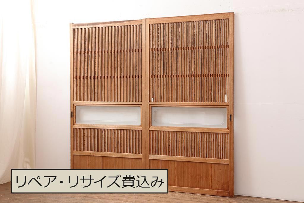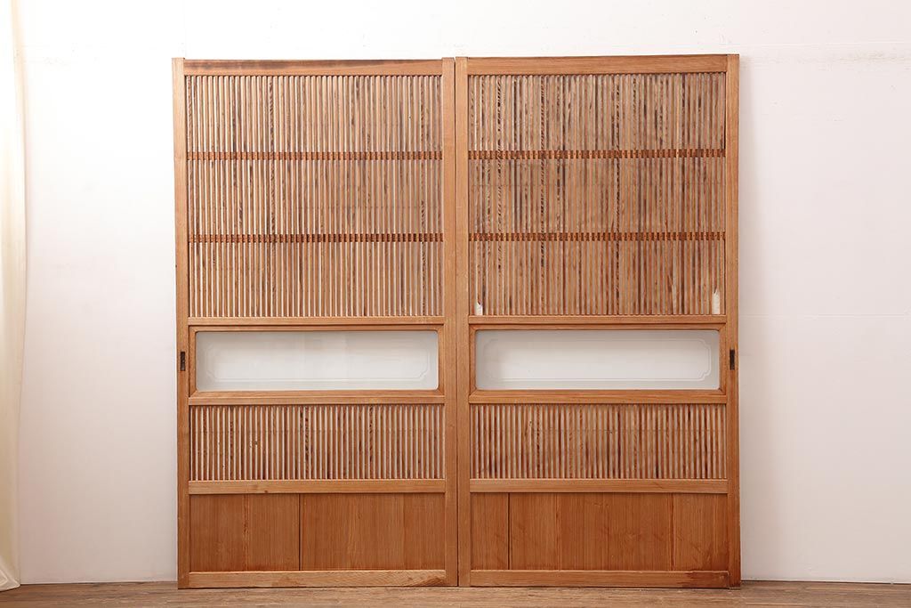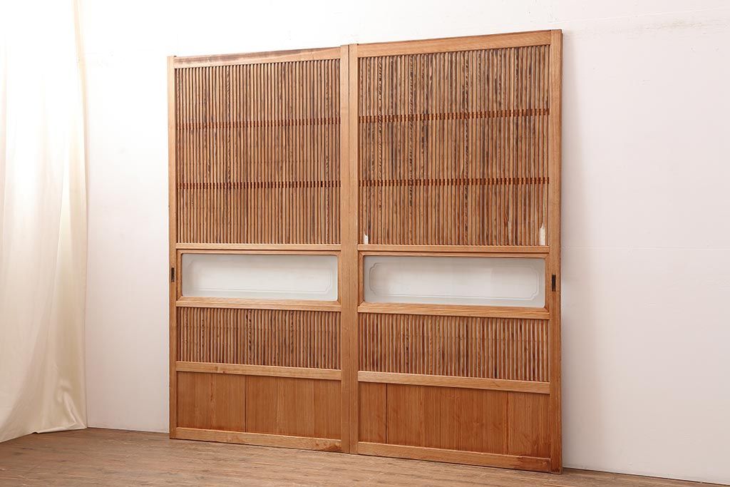 アンティーク建具 昭和中期 裏障子付き 和風スタイルにおすすめな帯格子戸2枚セット(障子戸、引き戸、建具)(R-045839)