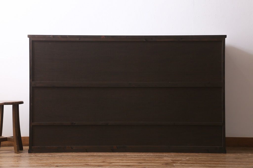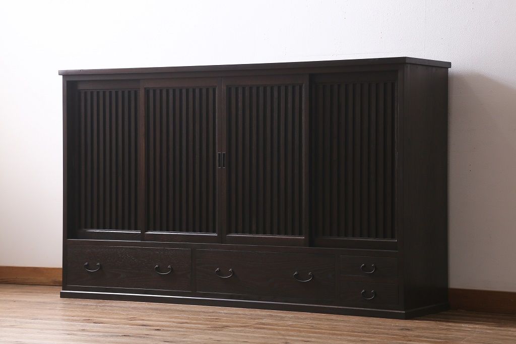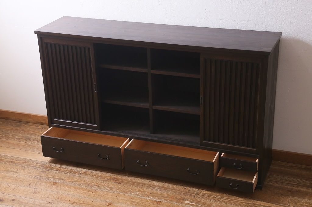 キャビネット・戸棚> 下駄箱 > 水屋箪笥サイドボードを新規製作!当店商品を参考にデザイン。ヒノキ無垢材を使用。アンティークの取っ手を取り付け。濃い茶色で着色し仕上げ。(サイドキャビネット、収納棚、戸棚、下駄箱、格子戸)