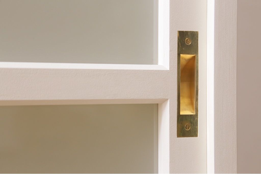 フルオーダー家具実績 > カウンターキャビネットを新規製作!収納部はセパレートさせ、可動式の棚板を設置。すりガラスを組み入れ。真鍮製の引き手、木製脚を取り付け。アイランド式の為背面までホワイトのペイント仕上げ。(収納棚、戸棚)