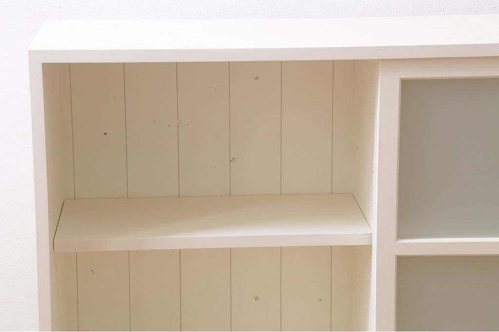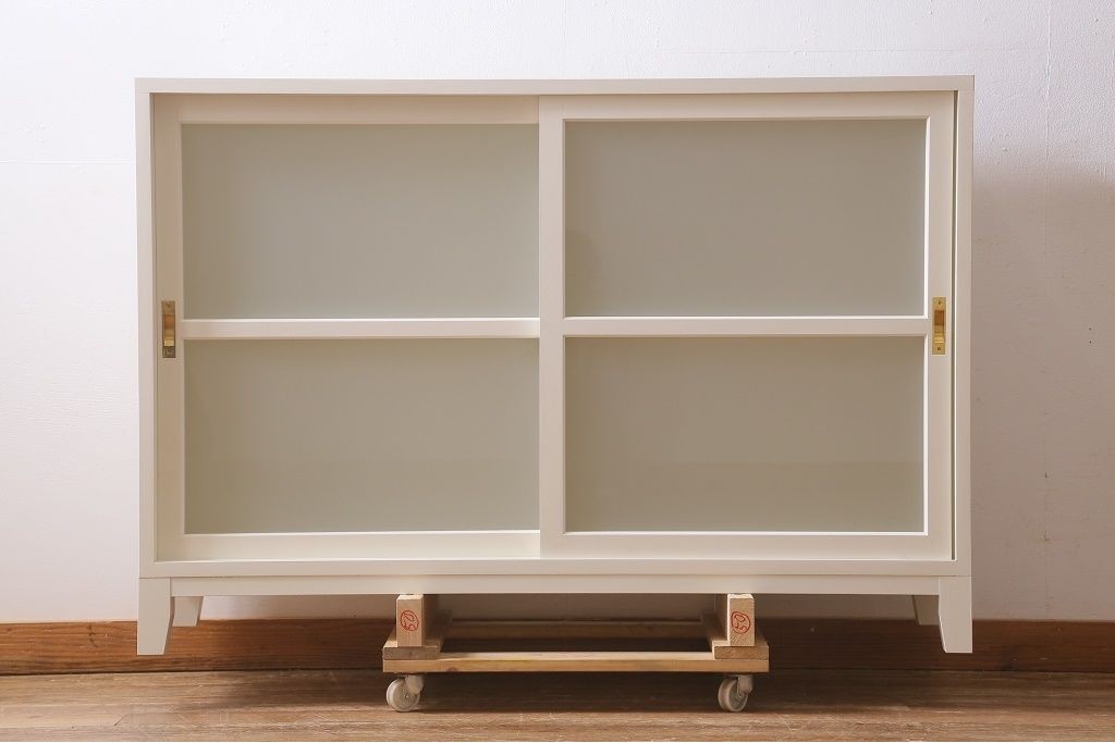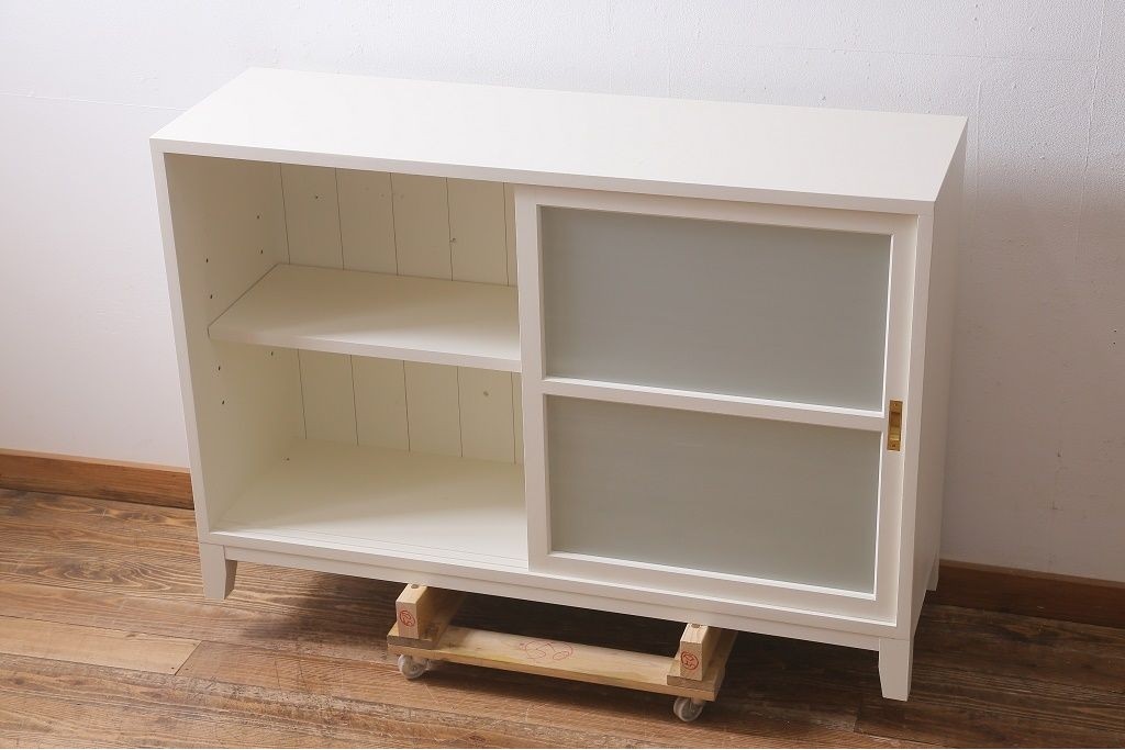 カウンターキャビネットを新規製作!収納部はセパレートさせ、可動式の棚板を設置。すりガラスを組み入れ。真鍮製の引き手、木製脚を取り付け。アイランド式の為背面までホワイトのペイント仕上げ。(収納棚、戸棚)