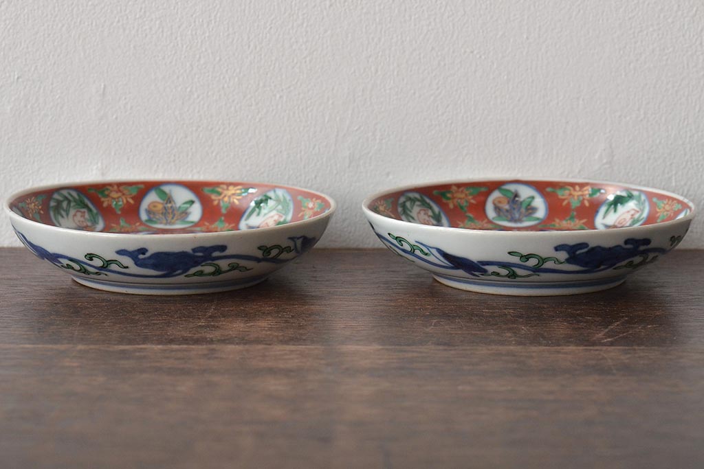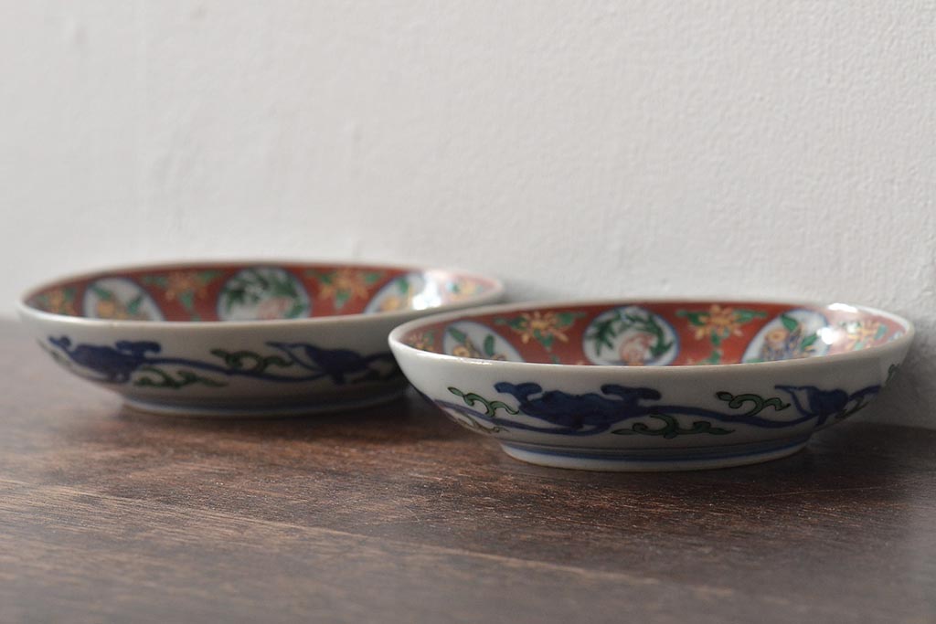 江戸期 古伊万里 大明嘉靖年製 花鳥図 色絵染付小皿2枚セット(R-045717)