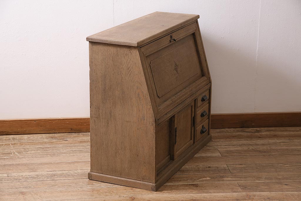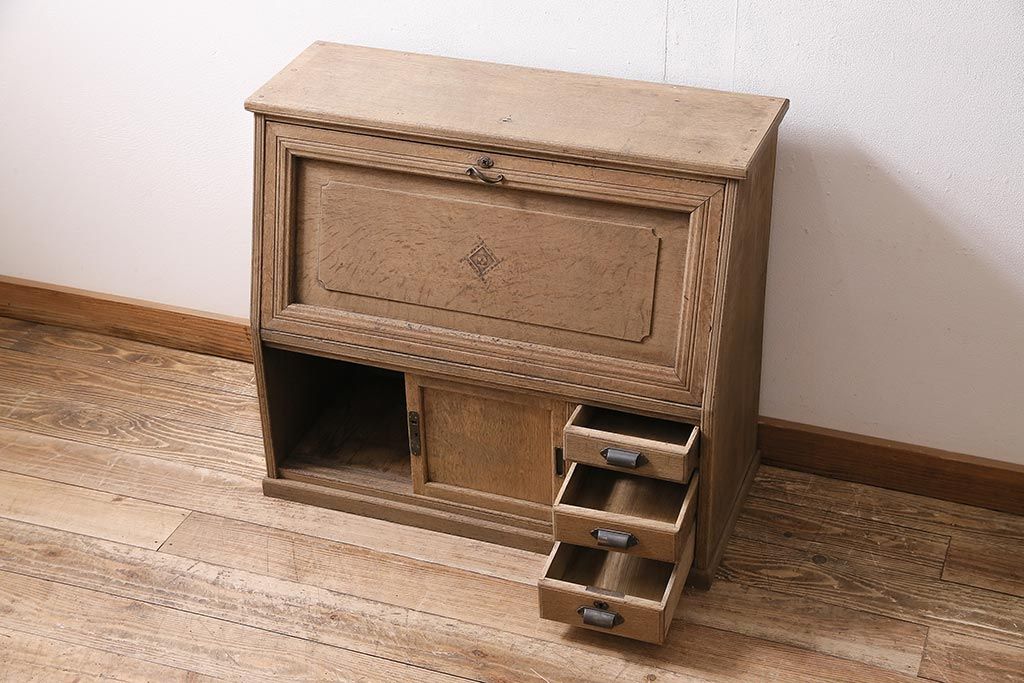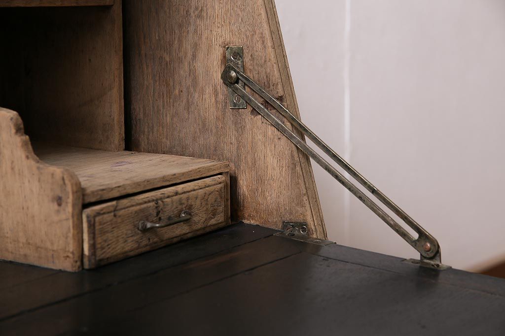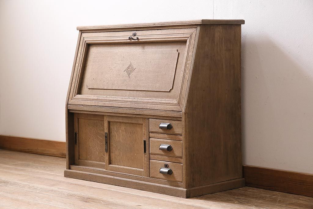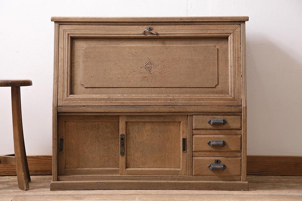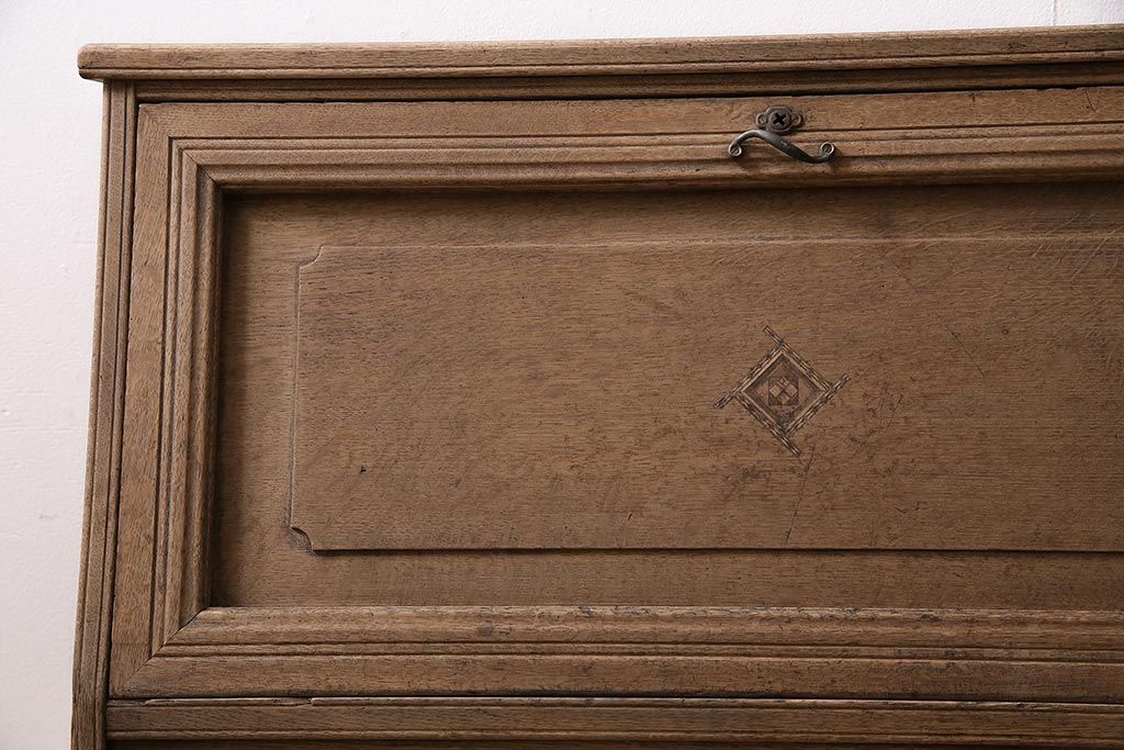 ラフジュ工房> ストリップド(剥離)家具 > アンティーク家具 昭和初期 ストリップド(剥離) ナラ材 象嵌入り 和と洋どちらのお部屋にも合うライティングビューロー(簿記机、在宅ワーク、在宅用ワークデスク)(R-040307)