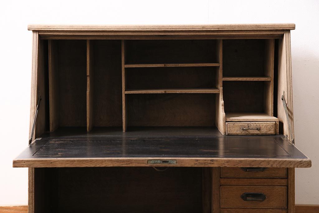 アンティーク家具 昭和初期 ストリップド(剥離) ナラ材 象嵌入り 和と洋どちらのお部屋にも合うライティングビューロー(簿記机、在宅ワーク、在宅用ワークデスク)(R-040307)