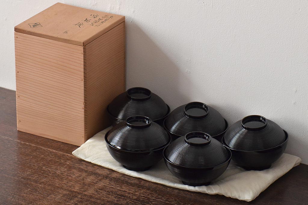 ラフジュ工房> 骨董・美術品> 骨董-漆器 > 初瀬川柳庵 糸目黒塗 切箔絵 木製 吸物椀5客(漆器)(R-045754)