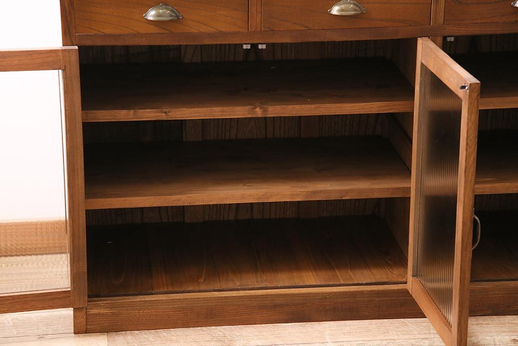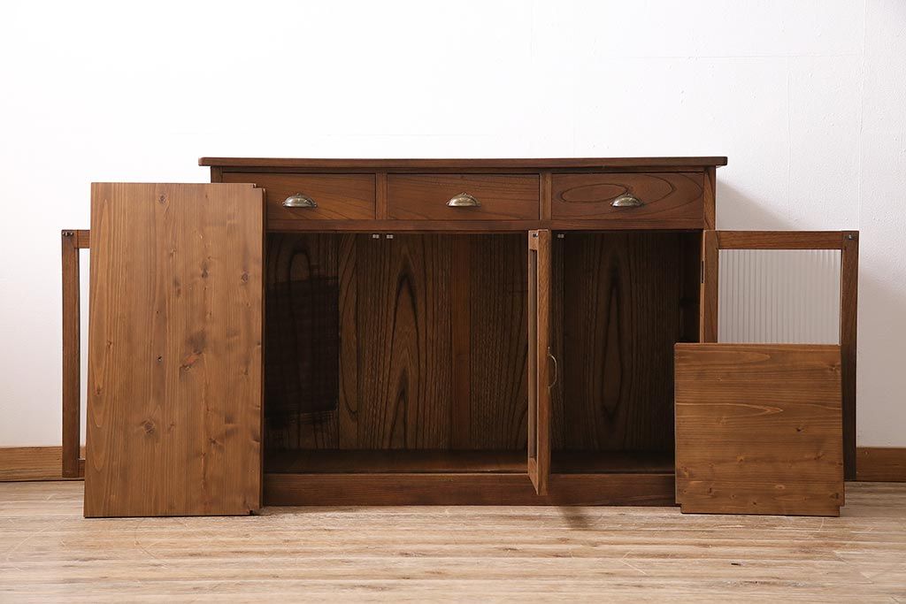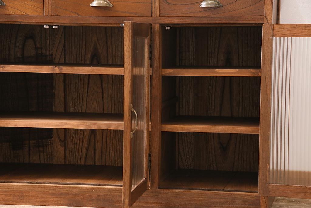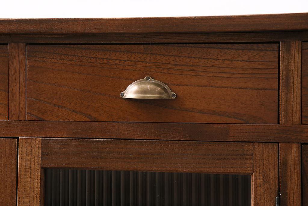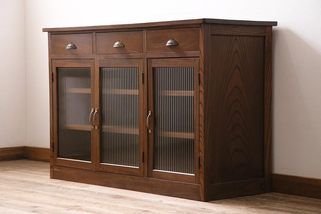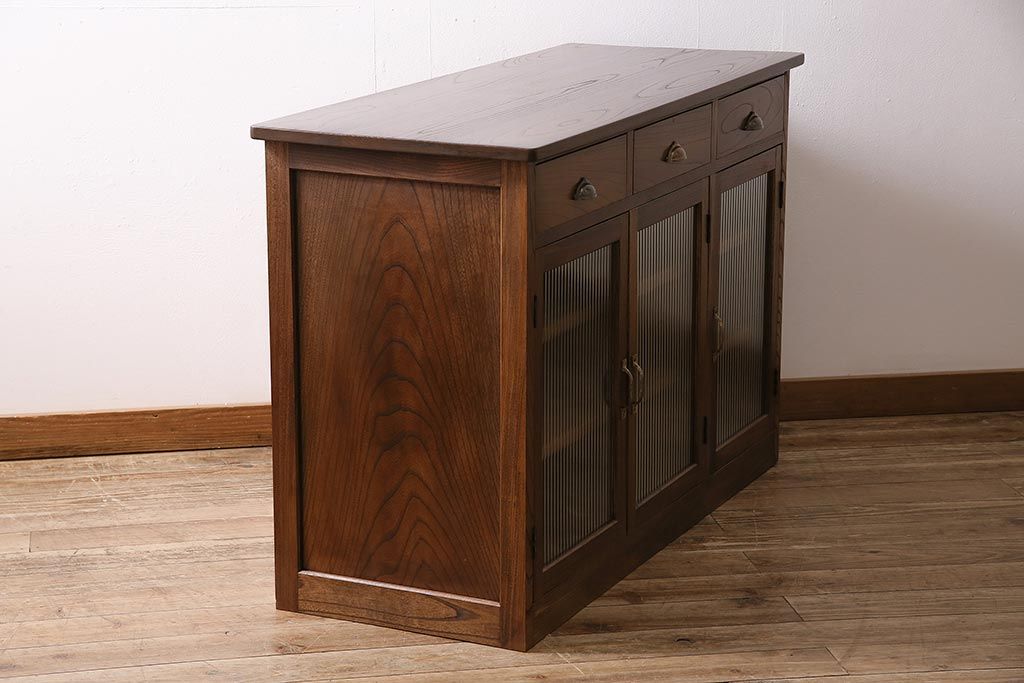 キャビネット・戸棚> サイドボード > 中古 総ケヤキ 無垢材 モールガラス 引き出し付きの木製カウンター(戸棚、サイドボード、リビングボード)(定価25万円)(R-045950)