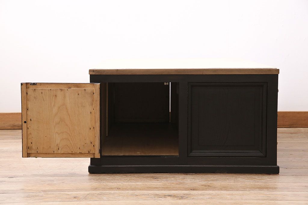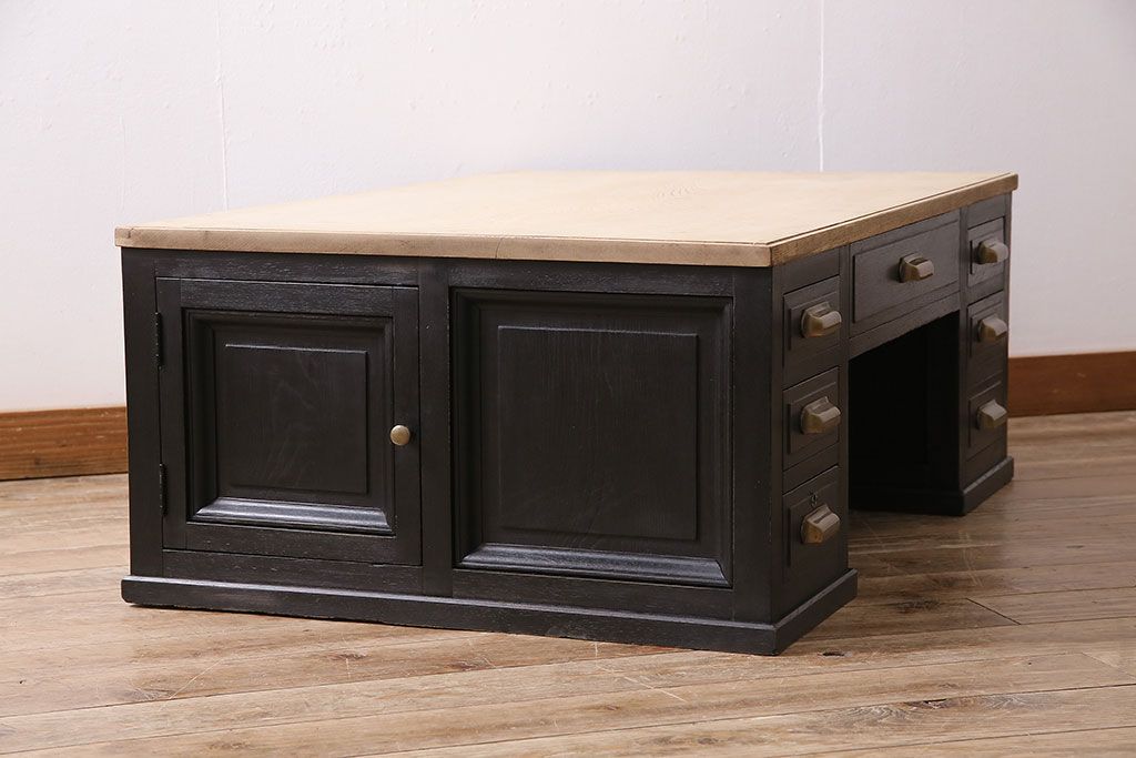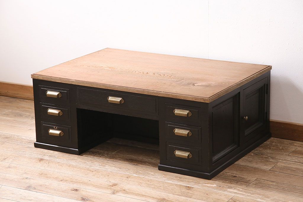 テーブル> センターテーブル・ローテーブル > アンティーク家具 昭和初期 ストリップド(剥離) 栓材 バイカラーがおしゃれな戸棚付きの両袖机(文机、ローテーブル、センターテーブル)(R-046077)